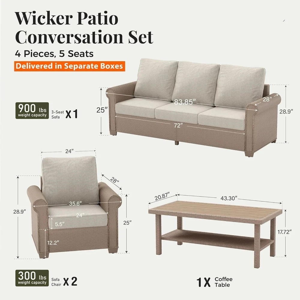 ITEM SPECIFICATION: Color :Beige Material :Rattan,Steel Materials: PE wicker, polyester cover Cushions thick :5.5 inch Each seat can support approximately 300 lbs. Includes :2 x Single Chairs, 1 x 3-Seater Sofa, 1 x Coffee Table, Instruction Manual x 1 Accessory Bag x 1