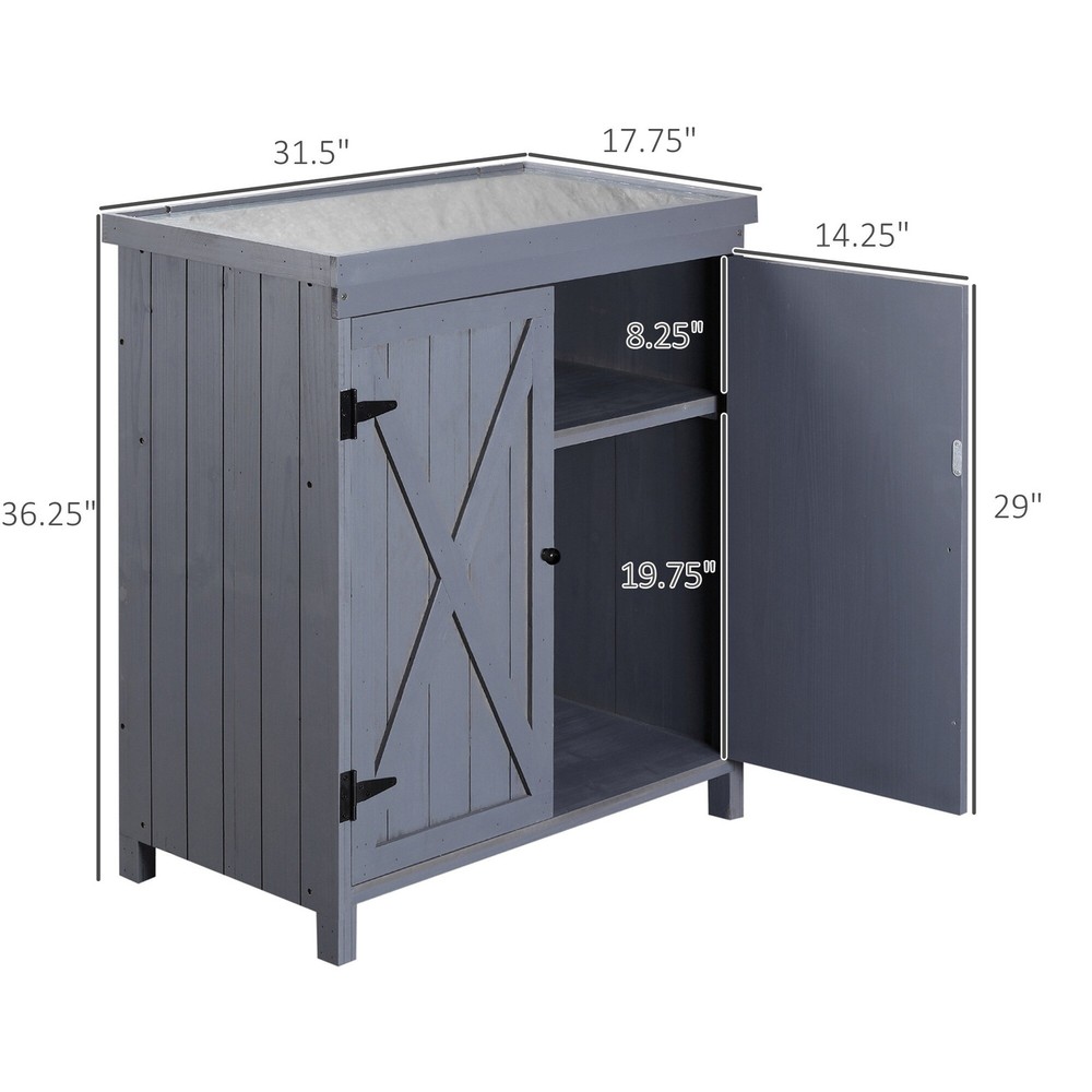 Protected Top: A sheet of galvanized metal on top of this storage cabinet resists rust to keep it in excellent condition, even when it rains. The top protects what's inside from getting wet, and the rain slides off the ground.A Home for Your Tools: This outdoor tool shed has two shelves to store garden tools, boots, shovels, hedge trimmers, and other outside tools to tend to your garden or lawn.Farmhouse Chic: This storage shed has X-bar farmhouse style doors with a natural wood finish to bring the country aesthetic to your lawn, garden, or garage.Outdoor Ready: This outdoor storage shed has a solid fir wood frame with a spray finish that resists water, so your tools are safe, and the shed will stay in good condition during the rain.Wood Tool Cabinet Information: 31.5" W x 17.75" D x Free Shipping Over $49.99* Details Garden Storage Cabinet, Outdoor Tool Shed with Galvanized Top and Two Shelves Product Description: Protected TopA sheet of galvanized metal on top of this storage cabinet resists rust to keep it in excellent condition, even when it rains. The top protects what's inside from getting wet, and the rain slides off the ground. A Home for Your ToolsThis outdoor tool shed has two shelves to store garden tools, boots, shovels, hedge trimmers, and other outside tools to tend to your garden or lawn. Farmhouse ChicThis storage shed has X-bar farmhouse style doors with a natural wood finish to bring the country aesthetic to your lawn, garden, or garage. Outdoor ReadyThis outdoor storage shed has a solid fir wood frame with a spray finish that resists water, so your tools are safe, and the shed will stay in good condition during the rain. Wood Tool Cabinet Information31.5" W x 17.75" D x 36.25" H. Weight Capacity110 lbs. (tabletop), 55 lbs. (shelf). Assembly required.