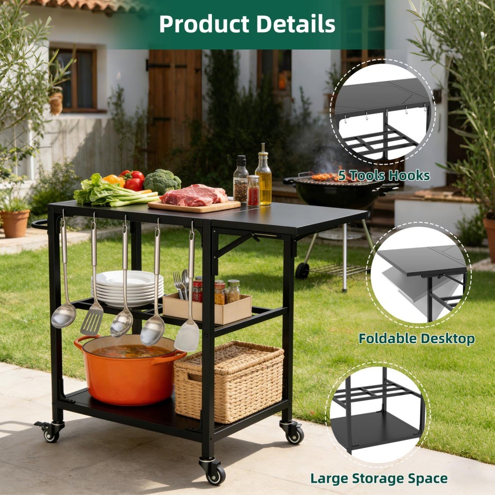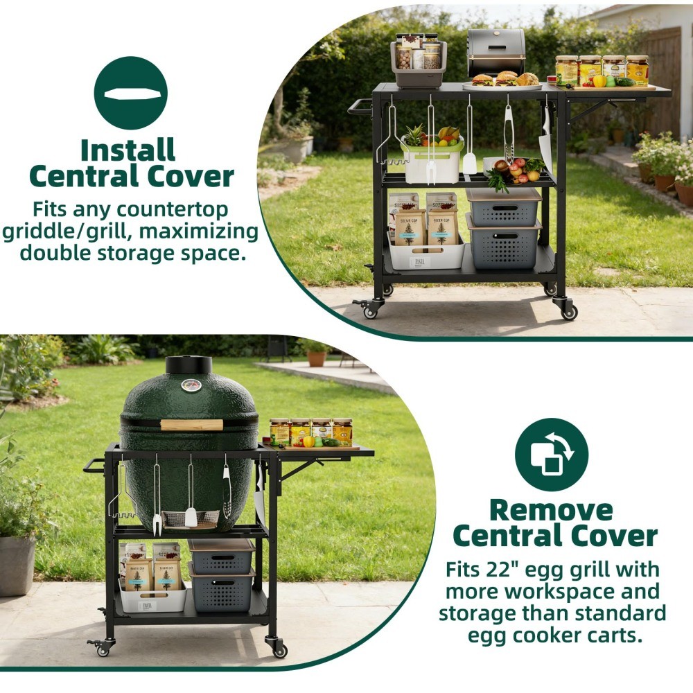 Outdoor Grill Table for Big Green Egg Style BBQ - Heavy Duty Metal Cart Prep Table with Wheels, Storage Shelf, Hooks & Removable Central Cover, Compatible with Large Big Green Egg Grill, Black Elevate your outdoor grilling experience with this heavy-duty metal grill table, custom-designed for the XLarge Big Green Egg and most 21-26 inch kamado-style grills. Crafted from durable black metal with a weather-resistant finish, this grill cart combines stability, mobility, and ample storage—featuring a foldable workspace, tool hooks, a bottom shelf, and lockable wheels. It’s the perfect addition to your patio, deck, or backyard, turning your grill into a streamlined, efficient cooking station. Custom-Fit for XLarge Big Green Egg & Kamado Grills. Designed specifically for the XLarge Big Green Egg (the result of years of design refinements), this grill stand goes beyond traditional nests by offering extra storage and convenient hooks, creating a seamless workspace that enhances your grilling workflow. It’s also compatible with most 21-26 inch kamado-style grills and supports up to 330 lbs, making it versatile enough for all your outdoor cooking needs. Heavy-Duty Metal Construction for Maximum Stability. Built from heavy-duty metal, this grill table is engineered for long-lasting durability and unwavering stability. Its robust structure ensures your Big Green Egg or kamado grill stays secure during use, so you can focus on perfecting your BBQ without worrying about wobbling or instability. The sturdy design is built to withstand outdoor elements and regular grilling use, promising years of reliable performance. 360° Rotating Lockable Wheels for Easy Mobility. Equipped with 360° rotating lockable casters and a secure brake system, this grill cart offers effortless mobility and stable positioning. Move it smoothly across any surface—patio, deck, driveway, or grass—then lock the wheels securely in place to keep it steady while grilling. This flexibility lets you rearrange your outdoor cooking space with ease, no heavy lifting required. Expansive Foldable Workspace & Versatile Storage. Designed for convenience, this grill table features a 15.8” x 27.6” foldable work surface—perfect for food prep, holding ingredients, or placing tools. Built-in tool hooks keep your grilling utensils within arm’s reach, while the bottom shelf provides extra storage for charcoal, sauces, or other grilling essentials. The removable central cover adds versatility, allowing you to customize the setup to fit your grill and needs, keeping your workspace organized and efficient. Easy to Clean & Quick to Assemble. Finished with a protective, weather-resistant powder coating, this grill table resists rust and is simple to wipe clean after every cookout—just a quick wipe with a damp cloth removes grease, food residue, and dust. Assembly is hassle-free with clear, step-by-step instructions and labeled parts, so you can set it up quickly and start grilling right away. If you have any questions or encounter issues during assembly, our professional after-sales team is always ready to assist you. With assembled dimensions of 43.40”L × 27.60”W × 30.00”H, this grill table offers ample space without taking up excess room in your outdoor area. It ships in one secure package with dimensions of 32.68”L × 30.31”W × 8.46”H and a package weight of 49.82 lbs, ensuring safe, damage-free delivery to your doorstep. The sleek black finish complements any outdoor decor, adding a modern, functional touch to your grilling setup. Product Details - Color: Black (note: actual product color may differ slightly from images due to lighting or monitor display differences) - Material: Heavy-Duty Metal; Finish: Weather-Resistant Powder Coating (Rust-Resistant) - Product Type: Outdoor Grill Table, BBQ Cart, Prep Table, Grill Stand - Compatibility: XLarge Big Green Egg, Most 21-26 Inch Kamado-Style Grills - Features: 330 lbs Weight Capacity, 360° Rotating Lockable Wheels with Brake System, Foldable Workspace (15.8” x 27.6”), Built-In Tool Hooks, Bottom Storage Shelf, Removable Central Cover, Weather-Resistant, Easy to Clean, Quick Assembly - Assembled Dimensions: 43.40”L × 27.60”W × 30.00”H - Package Dimensions: 32.68”L × 30.31”W × 8.46”H - Package Weight: 49.82 LBS - Suitable For: Patio, Deck, Backyard, Outdoor Grilling Areas - Assembly: Quick & Hassle-Free (clear instructions and labeled parts included) Warranty & Return Policy This heavy-duty metal grill table is backed by a 1-year warranty against manufacturing defects, ensuring reliable durability and long-lasting use for all your outdoor grilling adventures. We also offer a 30-day free return & exchange guarantee for your complete peace of mind. If you’re not fully satisfied with your purchase—whether it’s the fit, durability, functionality, or assembly—simply return it within 30 days for a full refund or replacement, no questions asked. Important Notes - Color Variation: Actual product color may not match images exactly due to lighting, screen settings, or resolution differences. - Size Accuracy: Manual measurements are approximate and may have minor reasonable errors. Ensure your grill is within the 21-26 inch range (or is an XLarge Big Green Egg) for proper fit. - Care Instructions: Wipe the metal surface with a soft, damp cloth after use to remove grease and residue; avoid abrasive cleaners that may damage the powder coating. Periodically check wheels and hardware for tightness to ensure stability. - Assembly: Follow the included step-by-step instructions carefully for proper assembly. Two adults are recommended for easier assembly due to the product’s weight and size. - Weight Capacity: Do not exceed the 330 lbs weight capacity to avoid damage to the cart or grill. Ensure the grill is centered on the cart for optimal stability. - Weather Protection: While the powder coating is weather-resistant, it’s recommended to cover the cart 