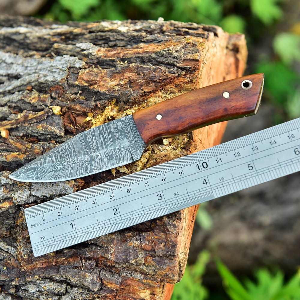 CUSTOM HANDMADE HAND FORGED DAMASCUS STEEL KNIFE WOOD Handle This superb design knife is hand forged. Blade of this knife has a nice file work and is made of 512 layers of 4340 stainless steel and 1075 high carbon steel and hardness 55-58 HRC . This robust knife is lab tested under intense conditions, the balance and shape of this knife ensures perfect grip. Overall Close Length: 6" Inches Blade Length: 2.75" Inches Damascus Design: Twist Pattern Layers: 512 Sheath: Leather Hand Forged