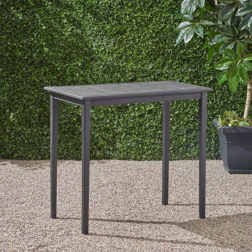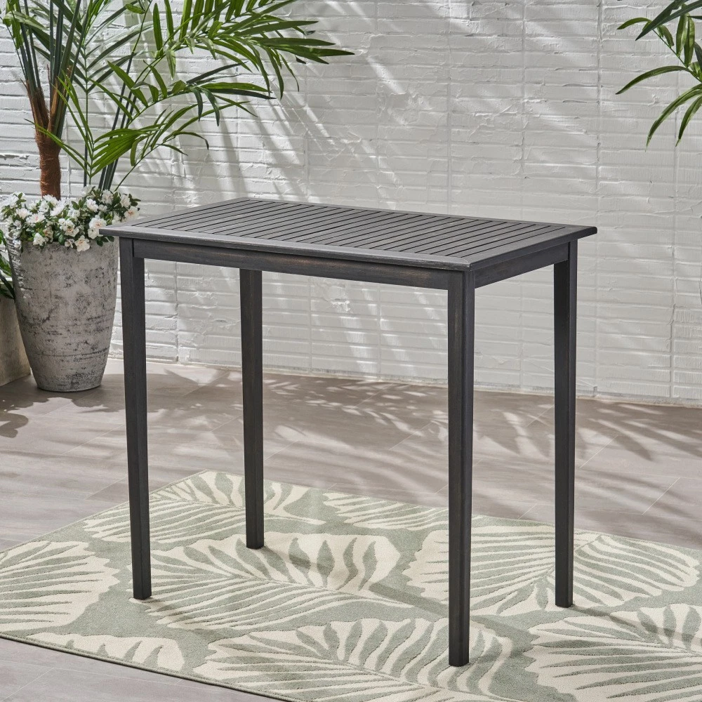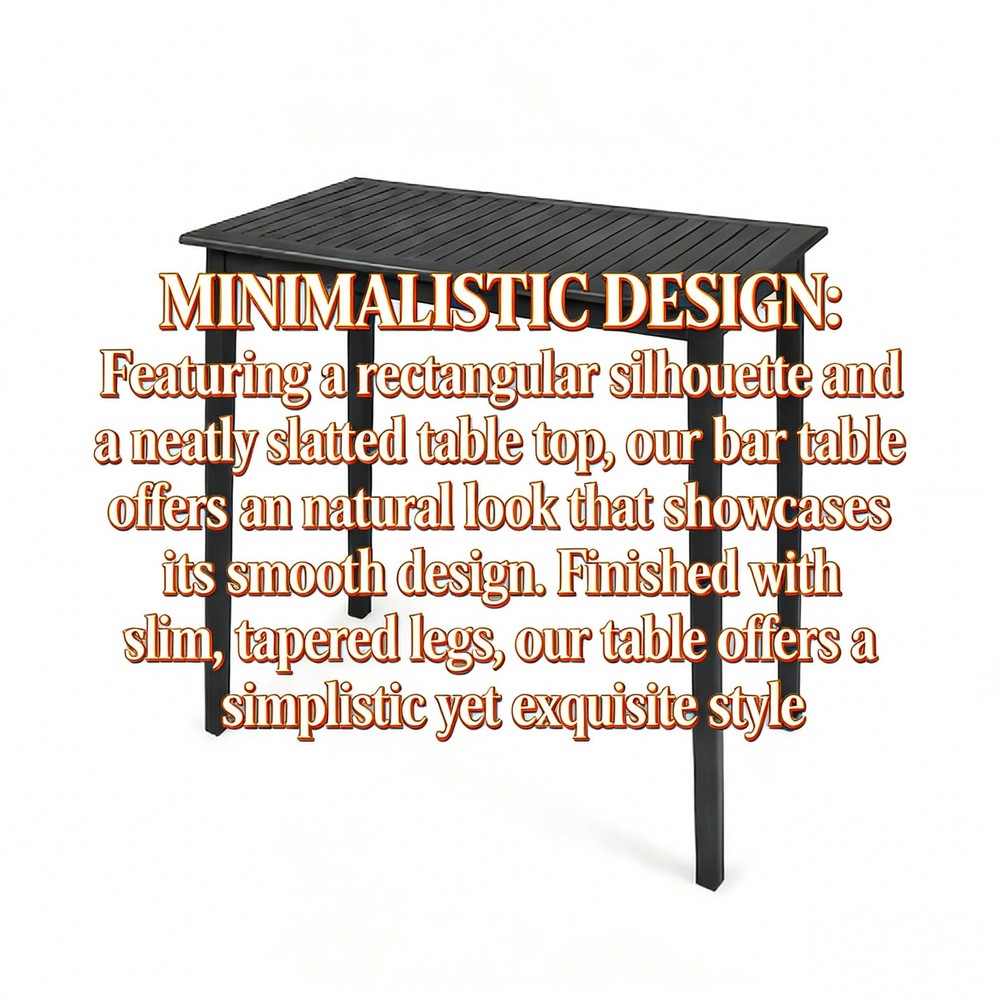 🌟 Product Highlights Timeless Minimalist Aesthetic : Boasting a clean rectangular shape and neatly arranged slatted tabletop, this bar table exudes a natural charm that highlights its smooth, refined lines. Paired with slim, tapered legs, it delivers a simplistic yet sophisticated look that complements any decor style—from modern patios to cozy kitchen nooks. Durable Acacia Wood with Teak Finish : Crafted from high-quality acacia wood, this table brings an elegant, exotic touch to your space. As a robust hardwood, it naturally stands up to outdoor elements like sun, rain, and humidity without darkening over time. The complementary teak wash enhances its natural grain while forming a protective layer, ensuring the solid, sturdy frame resists wear and tear for years. Bar Height Perfect for Versatile Use : Standing at 40 inches tall—ideal bar height—this table is a seamless addition to your outdoor patio, backyard, kitchen, or dining room. It pairs perfectly with bar stools for casual meals, cocktails, or outdoor gatherings (chairs not included). Hassle-Free Maintenance : Naturally weather-resistant to most outdoor elements, this table is designed for low upkeep. Extend its lifespan even further by covering it or storing it indoors during extreme weather conditions. Easy Assembly Included : Some assembly is required, but we've got you covered! All necessary instructions and tools are included in the package—no extra purchases needed. Set it up in minutes and start enjoying your new table. 📐 Product & Package Specifications Specification Type Details Assembled Length 44.00 inches Assembled Width 25.00 inches Assembled Height 40.00 inches Product Weight 29.76 lbs Package Length 47.00 inches Package Width 28.00 inches Package Height 6.00 inches Package Weight 35.96 lbs 🛡️ Our Promise to You We stand behind the quality of our products! Enjoy a 1-Year Warranty against manufacturing defects and a 30-Day Free Return & Exchange Policy —if you're not completely satisfied with your purchase, simply reach out to our customer service team for a hassle-free solution. Note: Chairs are not included with this bar table. For best results, clean with a damp cloth and avoid harsh chemicals.