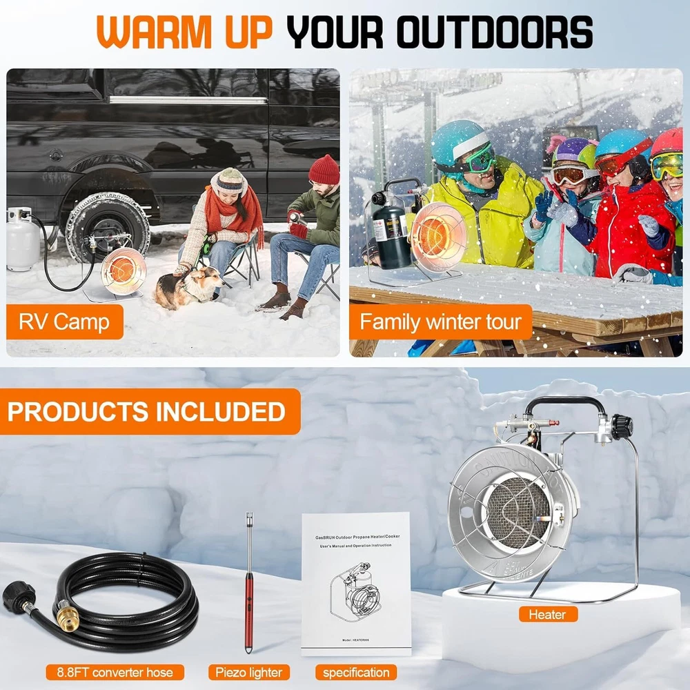 Product Description Outdoor Multi-Use Portable Propane Heater/Cooker, 18,000 BTU Gas Heater include 8.8 FT Hose and USB Lighter,Patio Heater,Tent Heater, Camping Heater for Hunting, Fishing,RV (Fuel not included) đ„Please Note : Propane Tanks are Not Included. Please keep this propane heater away from flammables. đ„ăVersatile Propane HEATER/COOKERă Our propane outdoor heater is ideal for all your outdoor heating and cooking requirements! Bring this heater along on your camping, fishing, RV CAMP and outdoor adventures, great for backyard as patio heater, as well as to sporting events and tailgate parties. đ„ăSafety Propane Patio HeaterăThe Automatic Safety Shut-Off Valve and Exterior Face Guard of the portable propane heater ensure your safety during use. Constructed entirely of metal, it eliminates the risk of fire and burning. đ„ăPropane Camping Heater Kit ăOur propane heaters for outdoor use is sold with an 8.8 FT high-pressure propane converter hose designed to connect the propane heaters outdoor to a 5-40 LB propane tank, allowing you to save money and reduce waste from disposable 1lb propane bottles. Additionally, the propane heater includes USB windproof lighter to ignite this propane heater. This rechargeable lighter eliminates the need for matches or traditional lighters, making it an essential tool for you. It can also ignite candles with ease. đ„ăPowerful Outdoor HeaterăThis patio heater generates up to 18,000 BTUs, effectively heating an area of 400 square feet. Easily set your desired heat level using the Heat Level Adjustment knob: Low (8,000 BTU), Medium (12,000 BTU), and High (18,000 BTU). It can run for up to 10 hours on low and 2 hours on high with a 1LB propane cylinder. About Us We are a reputable seller with many years of experience selling on eBay. Our goal is to provide high-quality products and excellent customer service. Payment 1.We accept PayPal only. 2.All major credit cards are accepted through secure payment processor PayPal. 3.Payment must be received within 7 business days of auction closing. 4.We ship to your eBay or Paypal address. Please make sure your eBay and Paypal address is correct before you pay. Feedback will be left automatically after we receive your feedback. Please contact us before leaving a Negative feedback or Neutral feedback. We would try our best to help you solving any problem. Shipping Items will be shipped within 1-3 business days when we received payment. (Orders are not processed on weekends & holidays) Tracking information will be sent once item is shipped. Delivery time depends on destination and other factors Item is shipped to ebay address. Leaving correct address can minimize delay. For international shipping and shipping to Guam, Hawaii and Alaska, Please contact us before placing the order. International buyers please note: Import duties, taxes and charges are not included in the item price or shipping charges. These charges are buyerâs responsibility. We will try our best to reduce the risk of the custom duties. Local pick-up is unavailable at the moment. Returns For any issues with Defects, Return, Item Exchange request, please contact us first and send us a message first before opening any type of case or request. We devote ourselves making EVERY CUSTOMER in 100% Satisfactory and resolve any problem. We highly value and appreciate your business. Thank you. No returns will be accepted without an RMA number. Please contact us for the RMA number. Return is acceptable within 30 days of delivery. Return for replacement or money back is optional. Returned items must be in the brand new, unaltered and resalable condition. Seller is not responsible for any labor cost, expense in a dealer store, or damage due to wrong installation. Contact Us We reply any email messages within 1 business / working days(off-duty at weekend). If you do not get a response from us, then please check your junk or spam mailbox. Our Business hours: Mon-Fri 9:00-18:00, UTC/GMT +8 hours. Please contact us either by clicking "contact seller" in the "purchase history" section or simply click "ask a question" at the bottom of this page. If you are unsatisfied with our item or service, please contact us before leaving any feedback. We are committed to resolve all issues in a friendly and satisfactory manner. powered by
