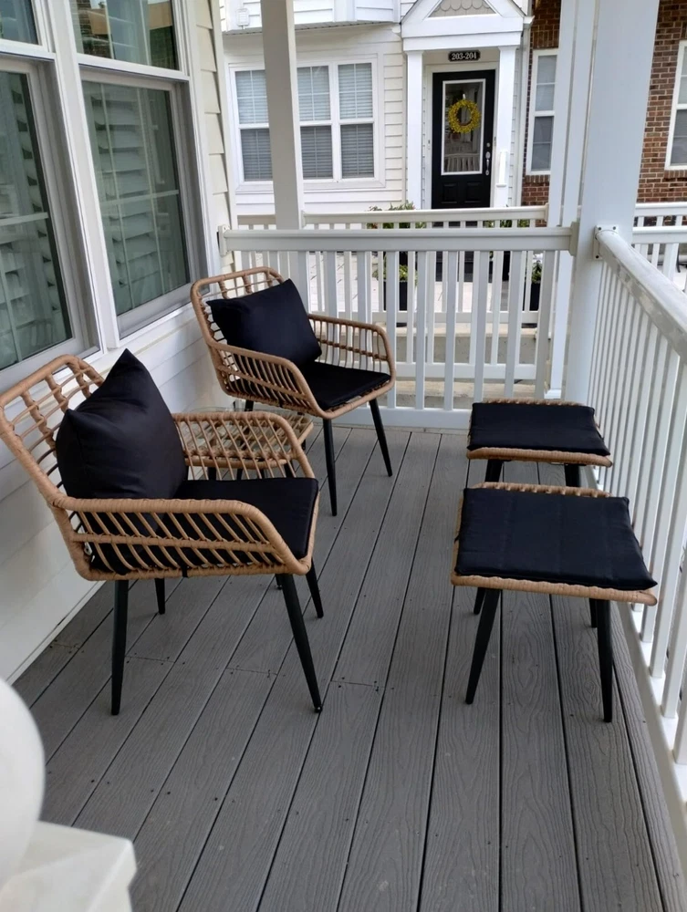 5 Piece Wicker Bistro Patio Conversation Furniture Set, Includes 2 Chairs, 2 Ottomans, and Side Table, Ideal for Porch, Balcony, Deck, Backyard, Natural Modern Bistro Set: This contemporary 3-piece rattan patio set from KROFEM features a timeless design that complements various decor styles, making it perfect for creating a cozy seating area in your garden, backyard, or balcony. Durable Construction: Crafted with a powder-coated steel frame for weather resistance and virgin polypropylene rattan hand-woven by skilled artisans, this set promises long-lasting durability. The tempered glass tabletop adds a touch of elegance and safety. Comfortable Seating: Plush, all-weather cushions with washable covers provide year-round comfort, inviting you to relax and enjoy casual conversations with friends or family. Easy Assembly: With a straightforward manual and all necessary parts included, this set can be assembled in approximately an hour, ensuring a hassle-free setup process.