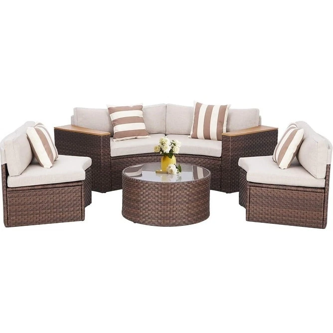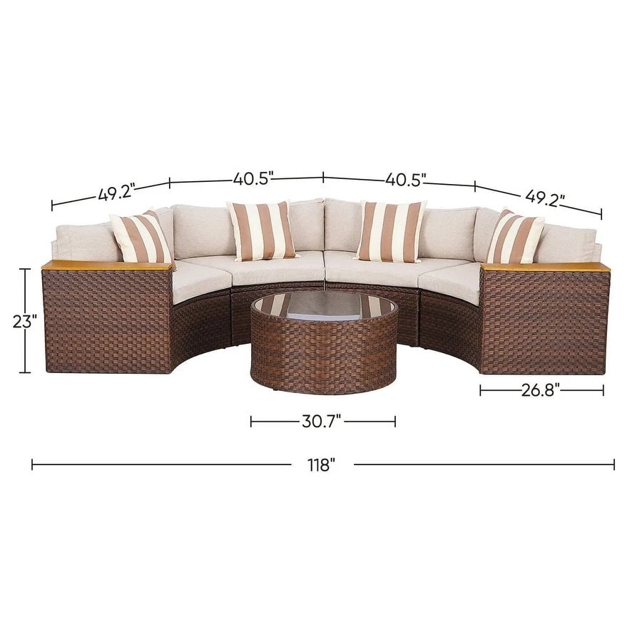 Bring style and comfort to your outdoor space with the Outdoor 5-Piece Rattan Sectional Patio Furniture Half-Moon Sofa. This set features a durable galvanized steel frame and handmade weather-resistant PE rattan for long-lasting use. The red olefin outdoor fabric cushions with removable covers make for easy maintenance, while the included round table with tempered glass and 4 pillows offer added convenience. Perfect for any occasion, this versatile set can be easily rearranged to fit your needs.Features: Handmade weather-resistant PE rattan Sturdy galvanized steel frame Durable red olefin outdoor fabric cushions with removable covers Round table with tempered glass Versatile design for different configurationsIncluded: 4 seats 1 round table with tempered glass 8 cushions 4 pillows Free Shipping Over $49.99* Details Outdoor Patio Furniture 5-piece Rattan Wicker Half-Moon Half Round Curved Sofa Product Description: Bring style and comfort to your outdoor space with the Outdoor 5-Piece Rattan Sectional Patio Furniture Half-Moon Sofa. This set features a durable galvanized steel frame and handmade weather-resistant PE rattan for long-lasting use. The red olefin outdoor fabric cushions with removable covers make for easy maintenance, while the included round table with tempered glass and 4 pillows offer added convenience. Perfect for any occasion, this versatile set can be easily rearranged to fit your needs. Features: Handmade weather-resistant PE rattan Sturdy galvanized steel frame Durable red olefin outdoor fabric cushions with removable covers Round table with tempered glass Versatile design for different configurations Included: 4 seats 1 round table with tempered glass 8 cushions 4 pillows Assembly instruction and all necessary hardware Additional Details: Product packaging quality has been improved for safe transportation Appropriate waterproof and sunscreen measures are necessary for extended use Easy and quick assembly with all hardware and necessary tools included