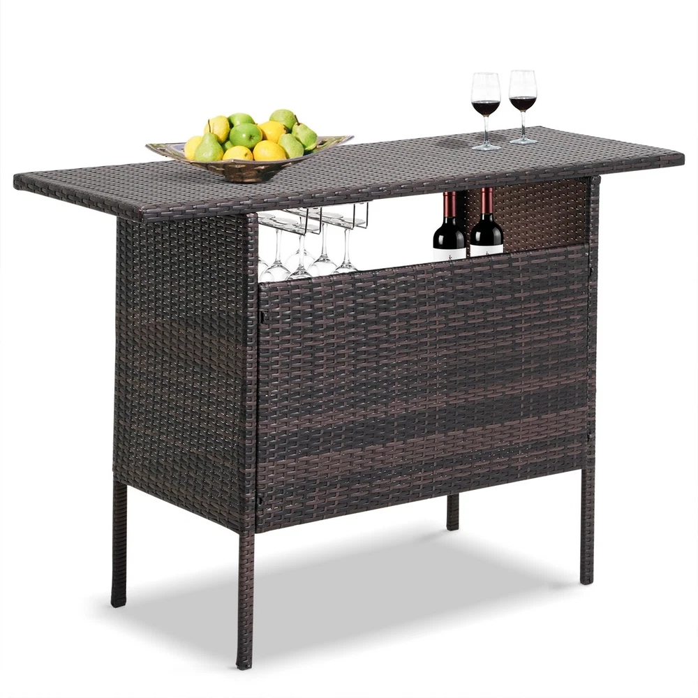 JUSTMAE - YOUR OUTDOOR FURNITURE CHOICE Modern design matches your patio furniture. It is a perfect wicker bar patio table for your outdoor party to serve drinks and snacks. Besides, the elegant appearance can match well with any outdoor and indoor area including garden, yard, pool, kitchen, dining room, etc. Features: With 2 layer steel shelves under table add additional storage space for your outdoor party. 2 stemware rack for hanging wine glasses allow for easy access to drinks. Make your backyard the place to be for outdoor socials with the Patio Wicker Bar Table top support up to 88lb Weather and UV resistant made it more durable High quality rattan ensures strong wear resistance for long lasting use Specifications: Color: Brown Material: Steel & Wicker Overall Free Shipping Over $49.99* Details Outdoor Patio Rattan Bar Counter Table Product Description: JUSTMAE - YOUR OUTDOOR FURNITURE CHOICE Modern design matches your patio furniture. It is a perfect wicker bar patio table for your outdoor party to serve drinks and snacks. Besides, the elegant appearance can match well with any outdoor and indoor area including garden, yard, pool, kitchen, dining room, etc. Features: With 2 layer steel shelves under table add additional storage space for your outdoor party. 2 stemware rack for hanging wine glasses allow for easy access to drinks. Make your backyard the place to be for outdoor socials with the Patio Wicker Bar Table top support up to 88lb Weather and UV resistant made it more durable High quality rattan ensures strong wear resistance for long lasting use Specifications: ColorBrown MaterialSteel & Wicker Overall Dimensions54.72"L x 18.1"W x 36.8"H Dimension of shelves:33.9"L x 17.3"W Bottom to Top Shelf23.22"H Weight Capacity:110lbs Weight39.6lb Package Includes : 1 x Bar Counter Table 1 x Accessories Bag 1 x Manual