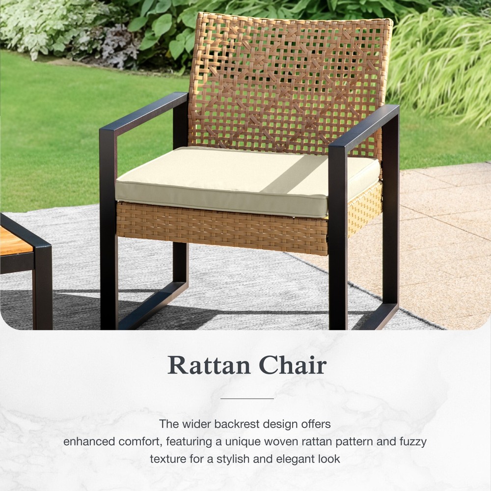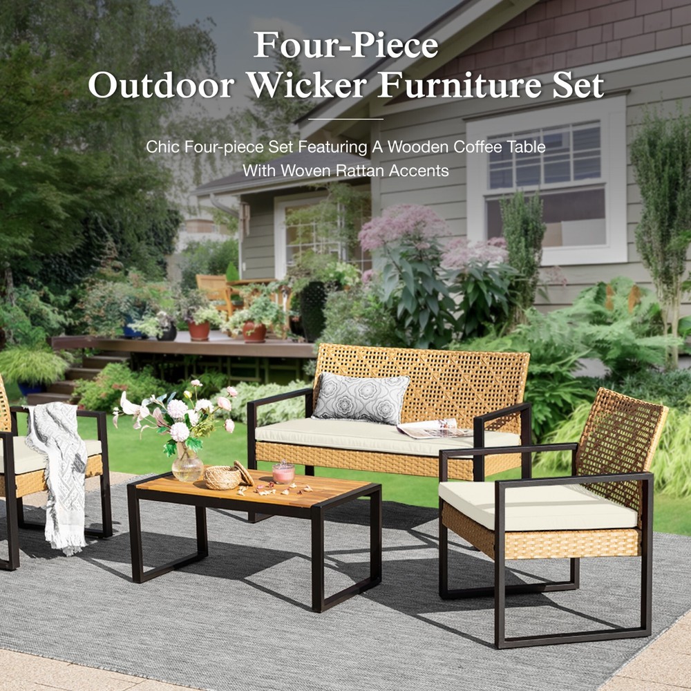 About Us Product Description: Transform your outdoor space with our stylish Rattan Furniture. This elegant rattan sofa combines comfort and charm, making it the perfect addition to your patio or garden. Designed for relaxation, this furniture set invites you to unwind while enjoying the fresh air. The durable rattan material is not only weather-resistant but also easy to clean, ensuring that your outdoor oasis stays beautiful for years to come. Enjoy gatherings with friends and family or simply relax in style on our cozy rattan sofa. Elevate your outdoor living experience today! About Us Feature: Made from beautifully woven rattan and 100% acacia wood, this furniture combines style and durability. The natural look of the woven rattan adds a touch of elegance to your patio, garden, or balcony, making it perfect for relaxing with friends or family. The sturdy acacia wood frame ensures that your furniture is built to last, providing comfort for years to come. Easy to maintain and weather-resistant, our Rattan Furniture is the ideal choice for any outdoor setting. Elevate your home today with this luxurious and functional addition! About Us Our products come with 1-year-warranty, ensuring that there will be no defects in materials and workmanship under normal use. We do our best to hear from customers and update our products. If you have more problems, please be free to contac