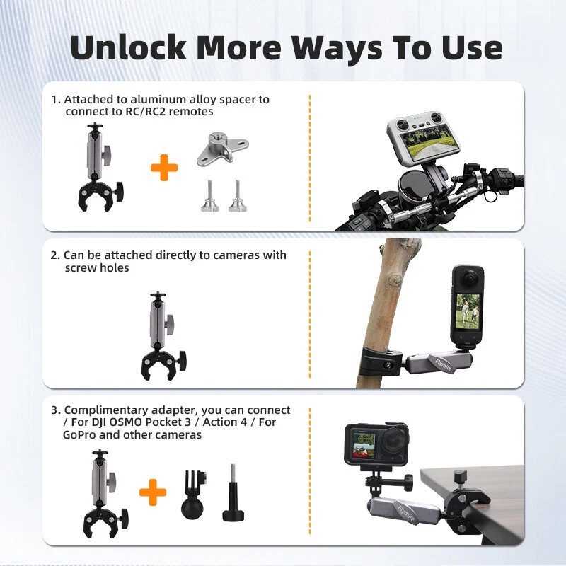 Product Description If you have any questions, please contact customer service first, do not open disputes easily, thank you! Feature: 1.Aluminum alloy base specially designed for DJI RC/RC 2. 2.Dual ball head design, more flexible, meet more angle adjustment. 3. Clamps to any 0.78 to 1.96in (2 to 5cm) diameter tubes. 4.The metal clip has two screw holes, which are compatible with RC/ RC2 remote controllers with screens. 5.1.Attached to aluminum alloy spacer to connect to DJI RC/RC2 remotes. Can be attached directly to cameras with screw holes. Complimentary adapter, you can connect /OSMO Pocket 3 / Action 4 and other cameras 6.Can be stored in a carrying case, explosion-proof box, original packaging, etc. Specification: Material: Aluminum alloy+ABS Applicable models: For RC/RC2 Remote Control(other models are not applicable, please check your remote control model before purchase) Color: Black+Silver Net weight:9.21oz(263.3g) Packaging includes: Cycling Mount*1 Sankwa Adaptor*1 1/4 adapter*1 Long screw*1 Hand screw*2 Metal buckle*1 Instructions manual*1 Note: 1.Does not include Sports camera, 2.Transition: 1cm=10mm=0.39inch, 3.Please allow 1-3mm error due to manual measurement. please make sure you do not mind before ordering, 4.Due to the difference between different monitors, the picture may not reflect the actual color of the item,please make sure you do not mind before ordering, Thank you! About Us We accept all payments authorized by eBay. powered by On Aug 8, 2024 at 00:31:45 PDT, seller added the following information: