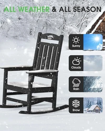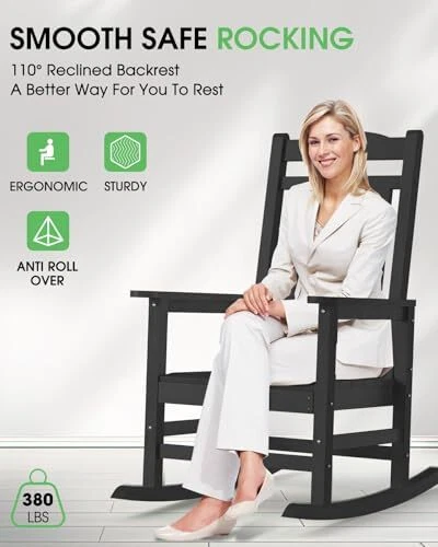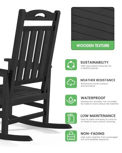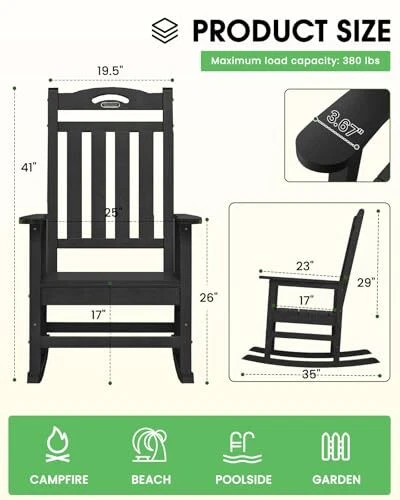 Return Policy Fast Delivery Trusted seller Outdoor Rocking Chair, High Back Porch Rocker Chair, All Weather Resistant HDPE Oversized Rocking Chairs for Patio, Garden, Lawn, Indoor (Black) Product Description Relaxing State: rocking chair features an ergonomic curved design that sets it apart from traditional, straight-backed rocking chairs. With a more reclined angle, it offers enhanced comfort and support, ensuring you enjoy a truly relaxing seating experience. Anti-Rollover Design: The porch rocker is equipped with 4 sturdy support points and cross bars, which evenly distribute weight for enhanced stability. The carefully calibrated rocking angle ensures your safety while maximizing comfort. Premium Material: Our outdoor patio chairs are crafted from HDPE, a strong and durable material that is both recyclable and environmentally friendly. Unlike wooden chairs, our HDPE rockers are waterproof and weather-resistant. They won’t chip, peel, or rot, making them the ideal choice for outdoor use. Oversized Rocking Chair: With dimensions of 35"L x 25"W x 41"H, the high back offers excellent head support for various body shapes. Enjoy a comfortable rocking experience while reading or napping, whether indoors or outdoors. Customer Service: is a brand devoted to product excellence and rapid growth. If you have any product inquiries, don’t hesitate to reach out to us. Your satisfaction is our top priority. Shipping Returns Payment Shipping Shipping is FREE to all addresses other than APO/PO boxes in the lower 48 states. All our stock ships from US-based warehouses. Shipped via USPS or UPS (depending on location and package weight) Unless stated otherwise, all orders will ship within 24-72 hours of your payment being processed. Check our feedback to see the great reviews of FAST shipping we offer. Returns Seller does not accept returns Payment We currently accept payment via eBay managed payments only. Once payment is cleared, we will dispatch your shipment within 1-3 business days. Please refer to the "Shipping" tab for more information regarding shipping speed to your destination.