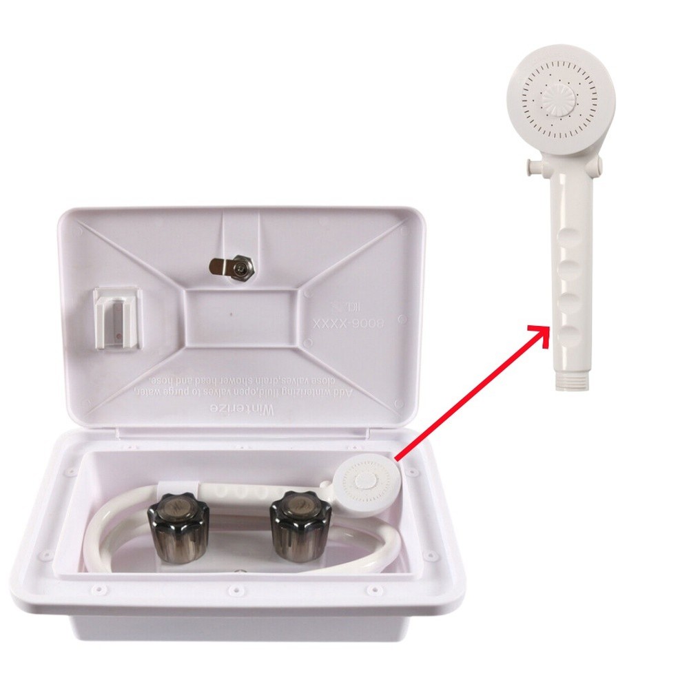 Specification: Hose Length: 47.2" D imensions: 13.4" Width x 8.5" Height H andle Type: Dual Knob Material: Plastic Installation Position: Exterior, Rear Features: Easy to control the spray from high to small to save water. Constructed with premium grade light weight material. Both hot and cold knobs for precise control over water temperature. Add winterizing flulid,open valves to purge water close valves drain shower head and hose. Outdoor shower is perfect for rinsing off beach sand,bathing pets,cleaning sports equipment and more. Package Included: 1Pc Shower Box (I nclude Key Lock)