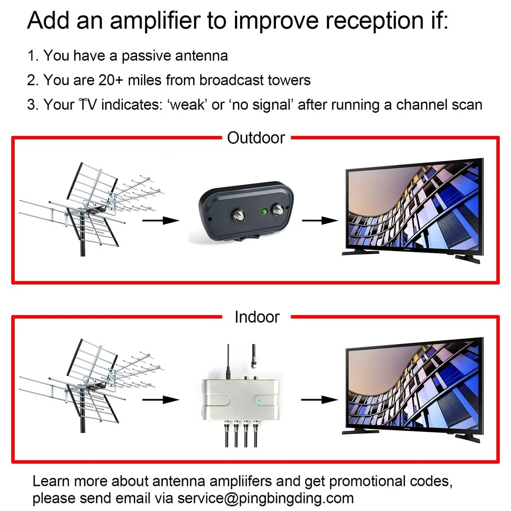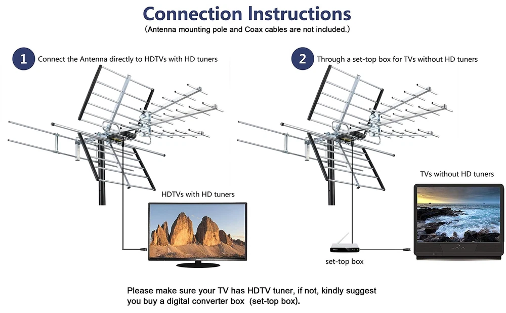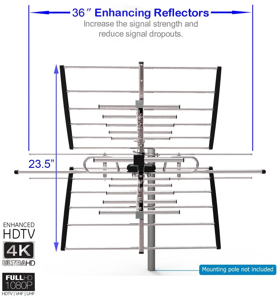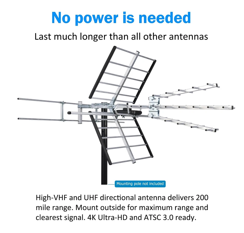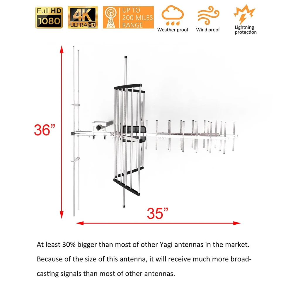 Receive UHF/VHF Signals -- Receive 1080p and 4K reception from the TV Transmitters, Outdoor TV Antenna has superior reception for both VHF and UHF signals. Working Frequency: VHF 170~230MHz | UHF 470~860MHz | Receive free digital broadcast high definition TV signals, save your monthly cable / satellite bill. Long Range Reception -- Extended Antenna Length designed for more stable and strong signal reception, longer and larger receiving elements than any of the other antennas. Find the most over-the-air stations For FREE in HD. Watch top-rated shows, live sports, and local news and weather with Antenna. (antenna reception vary depends on your local towers, trees, obstacles, etc.) EASY Installation -- Antenna comes with most pre-assembled , only few elements need to be combined together. No Tools inquired. Suitable for all people. Weather Resistant -- outdoor TV Antenna is lightning protected, durable design with grounding done. Superior construction to withstand tough outdoor weather conditions. What you get -- TV Antenna together with professional customer service & technical support.