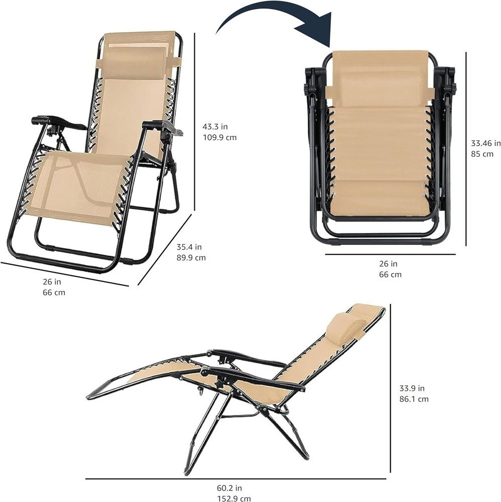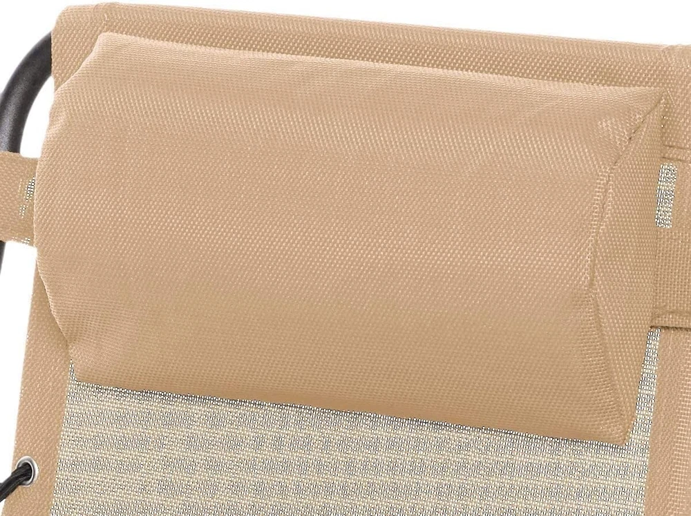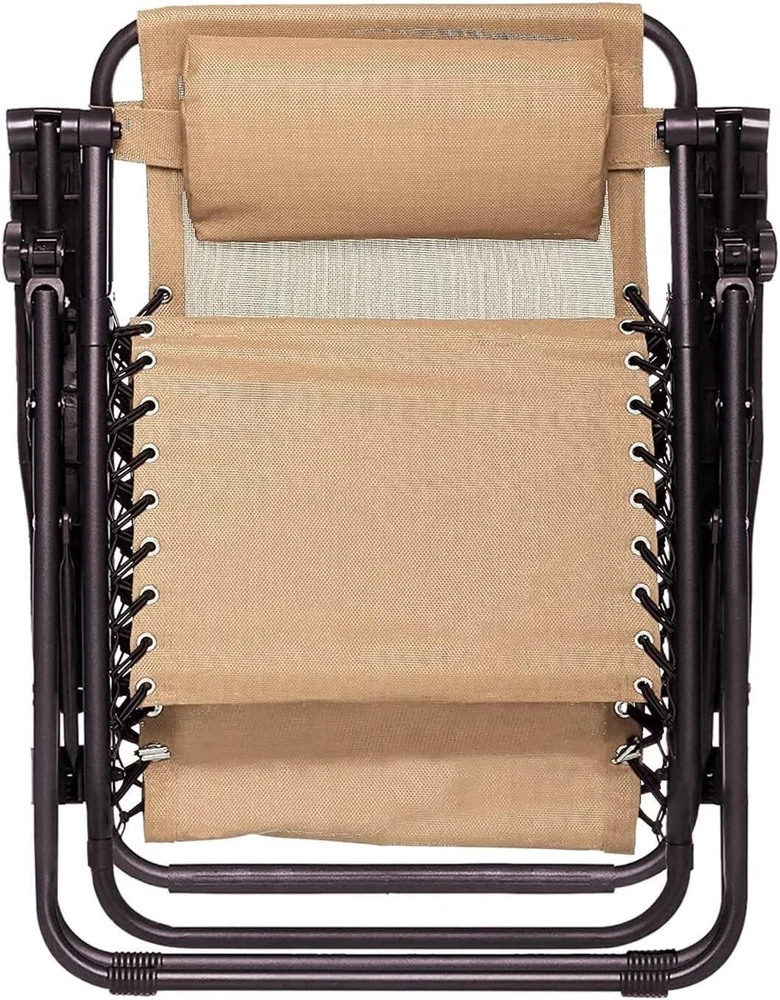 Outdoor Textilene Adjustable Zero Gravity Folding Reclining Lounge Chair with Pillow, 26", Beige Adjustable zero-gravity outdoor chair in Beige provides a stress-free weightless feel for optimal relaxation Padded headrest pillow offers extra comfort Reclining mechanism for easily transitioning from sitting upright to leaning back with legs raised; contoured armrests provide added ergonomic support Durable powder-coated steel frame; double-bungee support system securely connects the weather-resistant Textilene fabric to the frame 300-pound weight capacity; Product dimensions: x - x - inches (LxWxH); adjustable length and height depending on preferred position from upright to reclined Lightweight design folds flat for effortless storage or portability, whether heading to the beach or a campsite Basics Outdoor Textilene Adjustable Zero Gravity Folding Reclining Lounge Chair with Pillow, Beige From the Manufacturer Basics