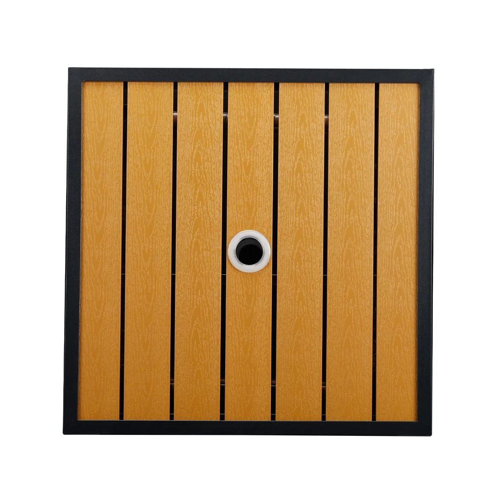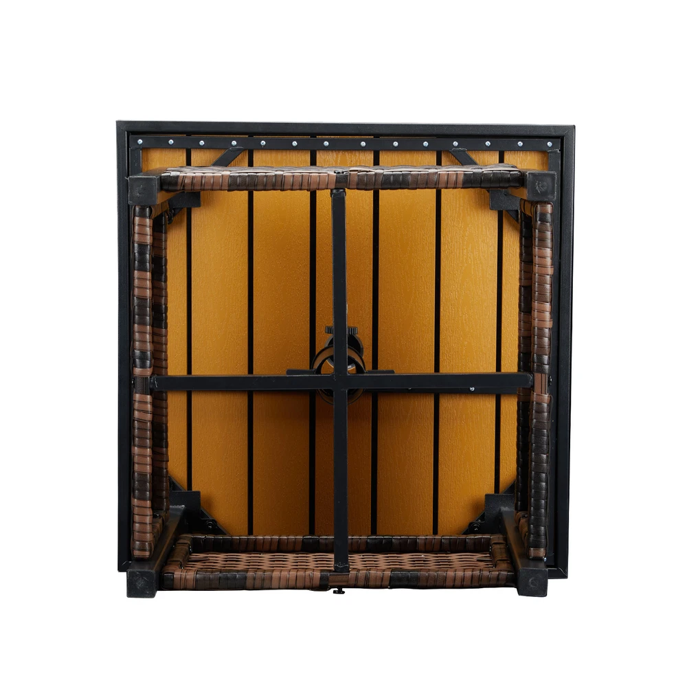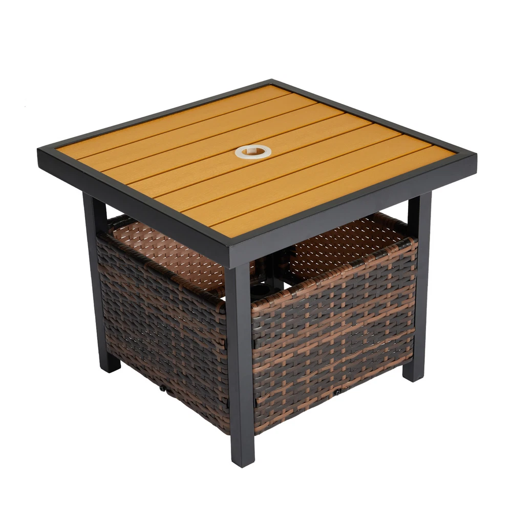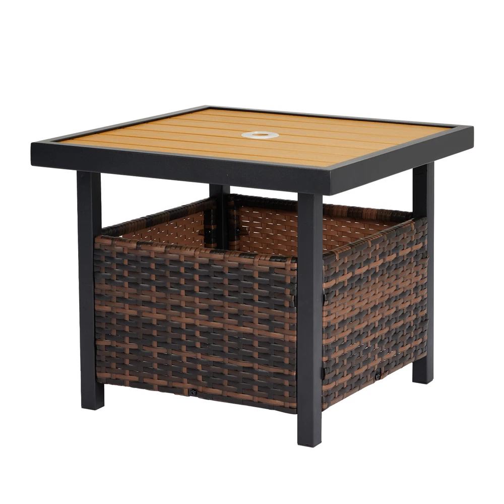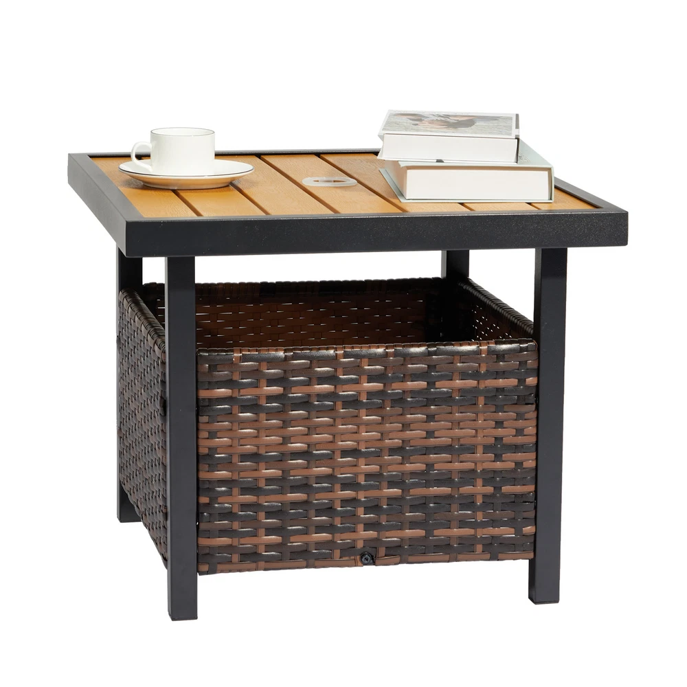 Introductions: Enhance your outdoor living space with our Outdoor Wicker Side Table, designed to blend seamlessly with any patio, garden, poolside, or deck setting. Made with a heavy-duty steel frame and high-quality PE rattan, this table is capable of supporting up to 110 pounds. The tabletop features a waterproof and moisture-resistant imitation wood material. The central umbrella hole allows for shade on sunny days, while the lower storage space is ideal for keeping magazines, towels, drinks, and snacks within reach. This table promises convenience, style, and a wide range of applications, both indoors and out. Features: 1. Sturdy & Durable: Crafted with a heavy-duty steel frame, this table stands firm with a high load capacity of 110 lbs. The premium PE rattan material ensures all-weather resilience. The table's top is made of waterproof and moisture-resistant imitation wood, perfect for outdoor environments. 2. Built-in Umbrella Hole: A 1.57" umbrella hole in the center allows for convenient installtion of a patio umbrella in sunny days. 3. Storage Space: The integrated shelf provides additional space for your reading materials, poolside essentials, or refreshments, keeping your outdoor area clutter-free. 4. Universal Appeal: This side table's versatile design seamlessly adapts to any indoor or outdoor decor. Ideal for a variety of settings such as balconies, patios, backyards, gardens, cafes, and even beachside retreats, it's the perfect accent piece for any environment. 5. Easy Assembly: Comes with high-quality hardware and a detailed instruction manual for quick, hassle-free installation. Specifications: 1. Material: Steel Frame, PE Rattan, Imitation Wood 2. Color: Brown 3. Overall Size: (22 x 22 x 18.1) in / (56 x 56 x 46) cm 4. Umbrella Hole Diameter: 1.57 in / 4 cm 5. Tabletop Thickness: 1.57 in / 4 cm 6. Wicker Side Panel Size: (9.8 x 15.4) in / (25 x 39) cm 7. Distance from Ground to Wicker Side Panel: 4.3 in / 11 cm 8. Load Bearing: 110 lbs / 50 kg 9. Weight: 22.4 lbs / 10.2 kg Package Includes: 1 x Wicker Side Table 1 x English Assembly Instructions 1 x Hardware Pack