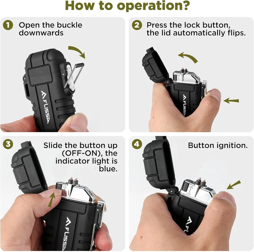IPX8 Fully Waterproof - The cool lighter is clad in comfortable rubber, the case snaps shut and features a metal-ring safety latch for water seep inside. Even though splashes and heavy rain, this tool will continue to work. Powerful & Reliable Arc lighter - Having a windproof lighter you can rely on will make starting fires easy and will save you a lot of time. The plasma electrodes of the lighter create a high-temperature dual arc, that ignites a fire in an instant, and ensures still be used in strong wind or other bad weather conditions. Economical & Eco-friendly - USB Rechargeable lighter with built-in 220mah lithium battery, which can plug into PC, car charger, or power bank, etc. (USB cable included) Flame-less lighter is very eco-friendly and easy to use. Security Upgrade - The side power button can prevent accidental triggering of the ignition button, and the metal locking clasp secures the lid to prevent it from falling open in your bag. This waterproof lighter can maintain a safe state for children and adults. 11 in 1 Multi-Function Spoon - This punk-style skull spoon is made of high-quality stainless steel, it is small, lightweight, exquisite, easy to carry around, and ideal for outdoor projects. Flissa rechargeable lighter & Multifunctional Spoon Combo is the best choice for emergency equipment, adventure, camping, hiking, hunting, survival tactical, traveling, etc. Product Description FLISSA WATERPROOF LIGHTER OUTDOOR WINDPROOF LIGHTER ELECTRIC LIGHTERS Ideal for Camping, Hiking, Hunter and more FLISSA USB Rechargeable Electric Lighters Perfect for outdoor lighter, camping fire starter tool, emergency equipment, camping survival gear, gadgets for men and more. The video showcases the product in use. The video guides you through product setup. The video compares multiple products. The video shows the product being unpacked. IPX8 WATERPROOF Fully submersible in water and perfect for the outdoor environment Clad in comfortable rubber, the case snaps shut and features a metal-ring safety latch for water seep inside. WIND RESISTANT Can start a fire in almost any weather conditions Having a windproof lighter you can rely on will make starting fires easy and will save you a lot of time. SECURITY UPGRADE A safe fire starter tool for outdoor acivities USB Rechargeable lighter with built-in 220mah lithium battery, which can plug into PC, car charger, or power bank, etc. SIMPLE STEPS TO USE FLISSA TRACTICAL SURVIVAL LIGHTER FEATURES Waterproof, Dustproof & Wind Resistant fully submersible in water and perfect for the outdoor environment. Completely dust proof and windproof. This punk style skull spoon is made of high quality stainless steel, it is small, lightweight, and exquisite, ideal for outdoor projects. The metal locking clasp secures the lid to prevent it from falling open in your bag. This lighter can maintain a safe state for children and adults. Compact Size. The Waterproof lighter is about 2” tall and 1.44” wide. Weight is 1.73oz. Easy to pack and carry anywhere. WIDE APPLICATION