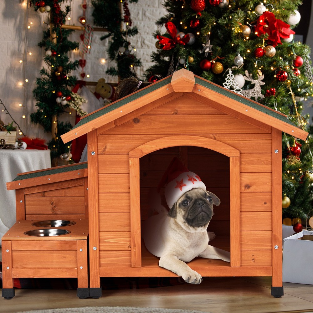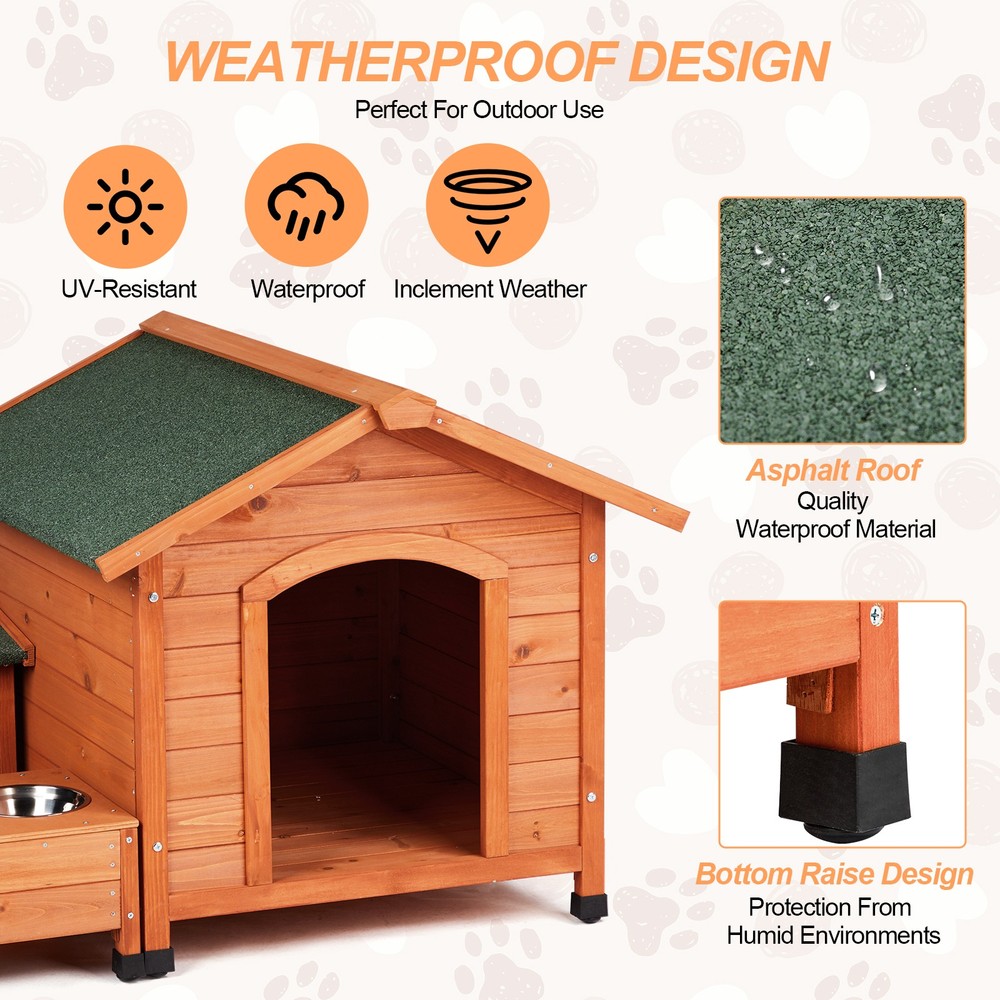 listing template VISIT OUR STORE SIGH UP FOR EMAIL Outdoor Wooden Dog House Kennel Shelter with 2 Bowls, Storage Box, Asphalt Roof Introductions: This Wooden Dog House offers a perfect combination of comfort, durability, and convenience for your pet. Designed with a spacious interior and weatherproof features, it's ideal for use both outdoors and indoors. The raised floor and asphalt roof provide superior protection from rain and humidity, ensuring your dog stays dry and cozy. Plus, with two included bowls and a convenient storage box, this doghouse is not only a safe shelter but also a complete feeding station for your furry friend. Features: 1. Spacious & Comfortable: Designed with large interior space measuring 25.5 x 27.5 inch, this dog house comfortably accommodates small, medium, and large dogs, giving them plenty of room to relax and feel secure. 2. Weatherproof Protection: The UV-resistant, waterproof asphalt roof and slanted design ensure your dog stays dry, while the raised floor enhances ventilation, keeping the inside cool and free from moisture. 3. All-in-One Feeding Station: Equipped with two built-in bowls and a handy storage box, this kennel offers the convenience of feeding and organizing your pet’s essentials all in one place. 4. Easy Cleaning Access: The fully opening roof makes cleaning quick and simple, allowing you to air out and maintain a clean, fresh environment for your pet without any hassle. 5. Sturdy & Long-Lasting Build: Built from durable fir wood with stainless steel hardware, this dog house is crafted to withstand outdoor elements, ensuring long-lasting protection for your furry companion. Specifications: 1. Dimensions: 32 x 34.5 x 29.5 in 2. Interior Size: 25.5 x 27.5 in 3. Material: Fir wood, Steel, Asphalt 4. Net Weight: 49.6 lbs Package Includes: 1 x Wooden Dog House Shipping Policy 1. Ship worldwide from New Jersey by reliable shipping companies -- USPS, UPS, FEDEX, DHL, etc., and only to VERIFIED PAYPAL ADDRESS. Transport Delivery ETA. Package handling only takes 1 business day at our warehouse, so please make sure entering correct payment and shipping information before checking out. Once your payment is completed, we are not going to accept any more changes to your order. 2. International Buyers – Please Note: a. Import duties, taxes and charges are not included in the item price or shipping charges. These charges are the buyer's responsibility. b. Please check with your country's customs office to determine what these additional costs will be prior to bidding/buying. 3. Please check your shipping address carefully before checkout, it can't be changed if order completed. 4. Orders placed on weekend will be shipped within 2 days.Notification of shipment with tracking number will be sent to buyers. 5. Standard shipping: 2-7 business days Expedited Shipping: 2-3 business days One-day Shipping: 1 business day International shipping: Varies 6.Ship within 1 business day once payment completed. Notification of shipment with tracking No. will be sent to buyer. 7.We offer discounts for combine shipping. Please contact us first if you need combine shipping, and an invoice with discount will be sent to you. 8.Please allow 5 business days for delivery to US destinations on any eBay orders and 14 business days for delivery to any International destinations. We highly recommend our buyer choose priority/expess mail for international delivery which is much more stable. Return Policies 1. Refunds given only if item DOA and cannot be replaced via PAYPAL . If so, Please contact us with 5 days since you receive the item and and return to us within 30 days from the delivery date for exchange or refund. 2. If you need return, please contact our customer service representative, let us know the detailed problem and send us some pictures for confirmation. Payment Payment should be sent within 8(EIGHT) days of auction closing. Feedback If you are dissatisfied for any reason, please do not be quick to leave negative/neutral feedback. We work hard to make sure EVERY CUSTOMER 100% SATISFIED and resolve any problem for you. Work Time Work Time: Monday to Saturday About Us | Newsletter| Feedback| Contact Us Copyright © 2022 LikeDeal. All rights reserved. 无标题文档 Outdoor Wooden Dog House Kennel Shelter with 2 Bowls, Storage Box, Asphalt Roof Introductions: This Wooden Dog House offers a perfect combination of comfort, durability, and convenience for your pet. Designed with a spacious interior and weatherproof features, it's ideal for use both outdoors and indoors. The raised floor and asphalt roof provide superior protection from rain and humidity, ensuring your dog stays dry and cozy. Plus, with two included bowls and a convenient storage box, this doghouse is not only a safe shelter but also a complete feeding station for your furry friend. Features: 1. Spacious & Comfortable: Designed with large interior space measuring 25.5 x 27.5 inch, this dog house comfortably accommodates small, medium, and large dogs, giving them plenty of room to relax and feel secure. 2. Weatherproof Protection: The UV-resistant, waterproof asphalt roof and slanted design ensure your dog stays dry, while the raised floor enhances ventilation, keeping the inside cool and free from moisture. 3. All-in-One Feeding Station: Equipped with two built-in bowls and a handy storage box, this kennel offers the convenience of feeding and organizing your pet’s essentials all in one place. 4. Easy Cleaning Access: The fully opening roof makes cleaning quick and simple, allowing you to air out and maintain a clean, fresh environment for your pet without any hassle. 5. Sturdy & Long-Lasting Build: Built from durable fir wood with stainless steel hardware, this dog house is crafted to withstand outdoor elements, ensuring long-lasting protection for your furry companion. Specifications: 1. Dimensions: 32 x 34.5 x 29.5 in 2. Interior Size: 25.5 x 27.5 in 3. Material: Fir wood, Steel, Asphalt 4. Net Weigh