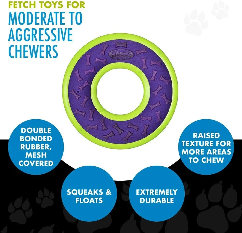 HERO OUTER ARMOR: Made using a multi-layered manufacturing process that blends two layers of thermoplastic rubber (TPR) with a layer of durable mesh, Outer Armor toys create a new standard of durable play. FLYING RING: The Outer Armor Ring has an aerodynamic design that is designed to fly high and fly far, giving your dog some additional exercise. Comes in eye-catching colors for easy visibility. EASY TO CATCH SHAPE: Designed to be easy to catch by medium to large sized dogs, with a textured material that is easy for your dog to dig their teeth into and grab on to. SAFETY GUARANTEE: Materials and processes used to make this product is guaranteed non-toxic and tested by an independent lab. Ideal for medium to large sized dogs from 45-65 lbs. Product dimensions: 8" l x 8" w x 1.5" h. Available in two colors, purple and blue. Product Description A New Standard in Durable Play HERO Outer Armor toys are made using a special proprietary, multi-layered manufacturing process that brings together different materials to create a new standard in durable play. The process blends two layers of thermoplastic rubber (TPR) with a layer of durable mesh. When it comes to durability, three layers are better than one! The result is an extremely durable fetch, toss, and squeak toy with a unique look and feel that dogs and their owners love. Outer Armor Products A NEW KIND OF BALL The Outer Armor Football is made of extremely durable materials with a varied texture that dogs love, for hours of tossing, fetching, and chewing fun. They float and squeak as well! FLYING BOOMERANG The Outer Armor Boomerang has an aerodynamic design that is designed to fly high and fly far, giving your dog some additional exercise. Comes in eye-catching colors for easy visibility. FLYING PROPELLER All Outer Armor toys, including the Flying Propeller are easy to catch by medium to large sized dogs, with a textured material that is easy for your dog to dig their teeth into and grab on to. FLYING RING Made using a multi-layered manufacturing process that blends two layers of thermoplastic rubber (TPR) with a layer of durable mesh, Outer Armor toys create a new standard of durable play. FIND THE PERFECT HERO FOR YOUR DOG