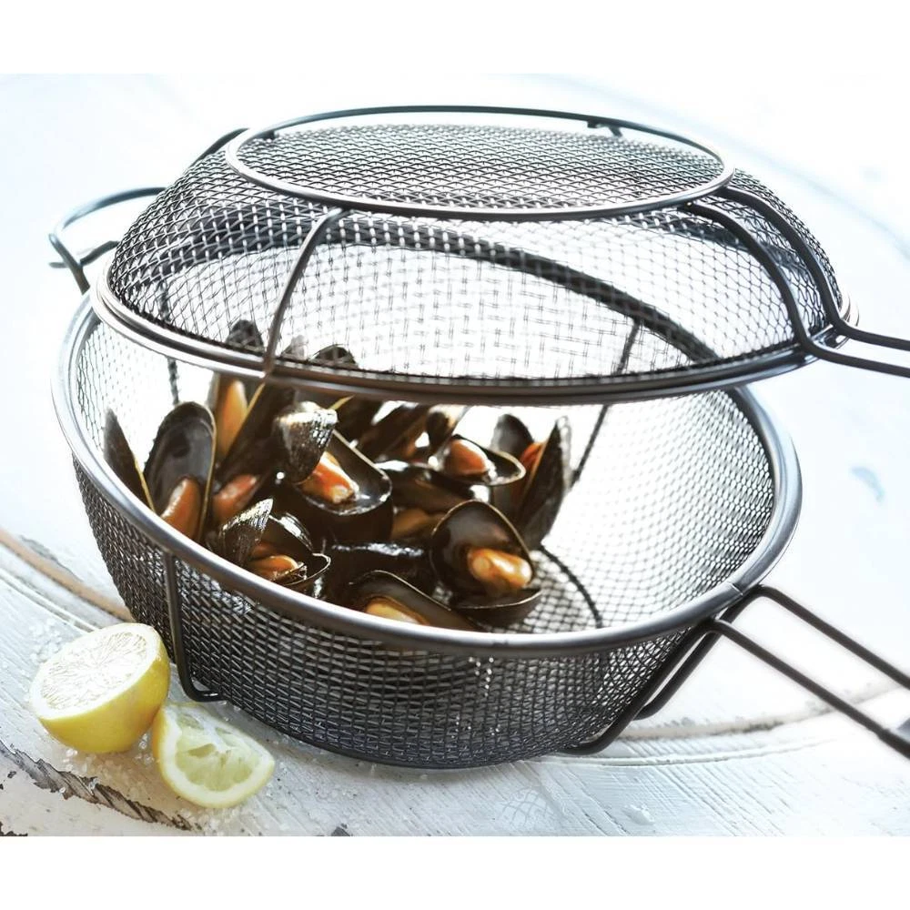 Versatile Grilling with 3 Ways to Use Shake things up with this 3-in-1 grill basket and skillet. For use as a skillet, deep basket or a grill basket with lid, its unique design creates a smoky flavor infusion into your foods. The sturdy, mesh design allows you to sear meats and vegetables without them slipping beneath the cooking grate. 3 Ways to Use: 1. Skillet (grill veggies, seafoods and meats); 2. Deep Basket (perfect for grilling family-sized meals); and 3. Grill Basket with Lid (interlock helper handles to use skillet as a lid to shake it up). Helper handles make transportation to and from the grill easy. The basket's nonstick coating makes for quick clean up and safe cooking. Collapsible design with removable handles for convenient storage. Compatible with gas stovetops Visit Our Store Contact Us Chef's Outdoor Grill Basket and Skillet Versatile Grilling with 3 Ways to Use Shake things up with this 3-in-1 grill basket and skillet. For use as a skillet, deep basket or a grill basket with lid, its unique design creates a smoky flavor infusion into your foods. The sturdy, mesh design allows you to sear meats and vegetables without them slipping beneath the cooking grate. 3 Ways to Use: 1. Skillet (grill veggies, seafoods and meats); 2. Deep Basket (perfect for grilling family-sized meals); and 3. Grill Basket with Lid (interlock helper handles to use skillet as a lid to shake it up) Helper handles make transportation to and from the grill easy The basket's nonstick coating makes for quick clean up and safe cooking Collapsible design with removable handles for convenient storage Compatible with gas stovetops Hand wash only Color: Black Material: Iron Dimensions: 23" x 11" x 6.5" Weight: 2.6 lb Origin: China