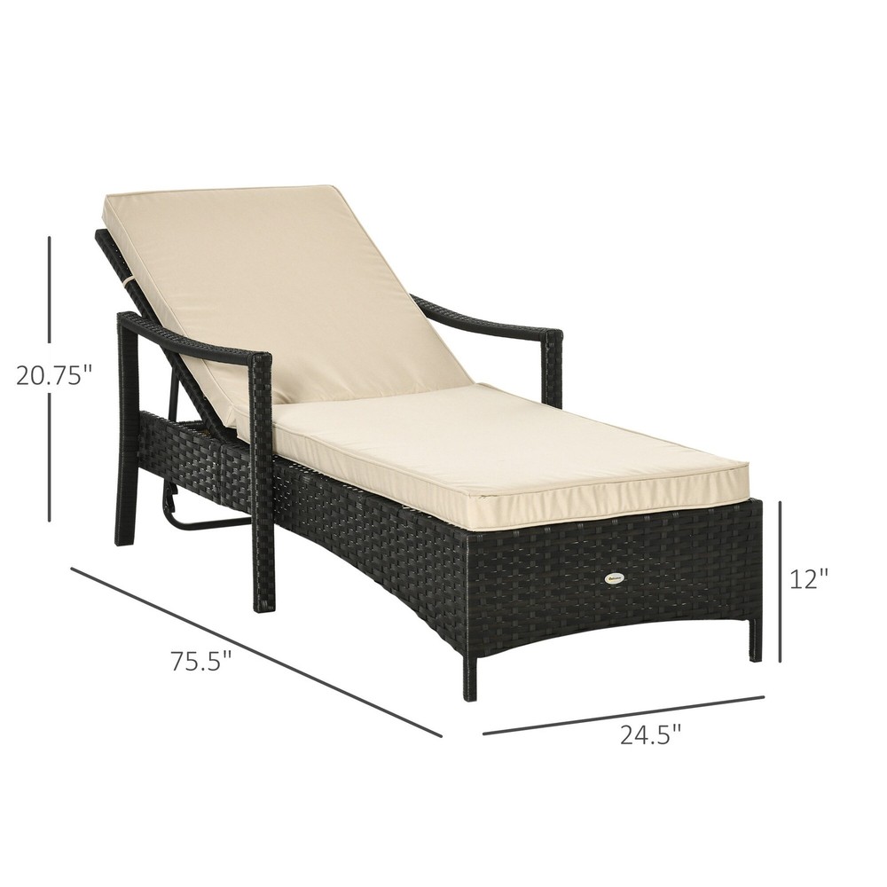 Escape the summer heat with this stylish Outsunny Patio Chaise Lounge Chair! Crafted with a powder-coated metal frame and all-hand weaved PE rattan wicker, this outdoor sun lounger is built to last. Enjoy the four-level adjustable backrest and a soft padded cushion to keep you comfortable while you tan, nap, or chat with friends and family. Plus, the cushion cover is removable and washable for easy cleanup.Features: Powder-coated metal frame All-hand weaved PE rattan wicker 4-level adjustable backrest Removable, washable cushion cover Soft padded cushion for comfortAdditional Details: Overall Dimensions: 75.5"L x 24.5"W x 20.75"H Seat Size Dimensions: 23.75"W x 42.25"D Seat Height: 12" Adjustable Height: 22.75", 27.5", 32.25", 37.5" Weight Capacity: 352 lbs. Assembly required Free Shipping Over $49.99* Details Outsunny Patio Chaise Lounge Chair, Outdoor PE Rattan Single Sun Lounger with Product Description: Escape the summer heat with this stylish Outsunny Patio Chaise Lounge Chair! Crafted with a powder-coated metal frame and all-hand weaved PE rattan wicker, this outdoor sun lounger is built to last. Enjoy the four-level adjustable backrest and a soft padded cushion to keep you comfortable while you tan, nap, or chat with friends and family. Plus, the cushion cover is removable and washable for easy cleanup. Features: Powder-coated metal frame All-hand weaved PE rattan wicker 4-level adjustable backrest Removable, washable cushion cover Soft padded cushion for comfort Additional Details: Overall Dimensions75.5"L x 24.5"W x 20.75"H Seat Size Dimensions23.75"W x 42.25"D Seat Height12" Adjustable Height22.75", 27.5", 32.25", 37.5" Weight Capacity352 lbs. Assembly required