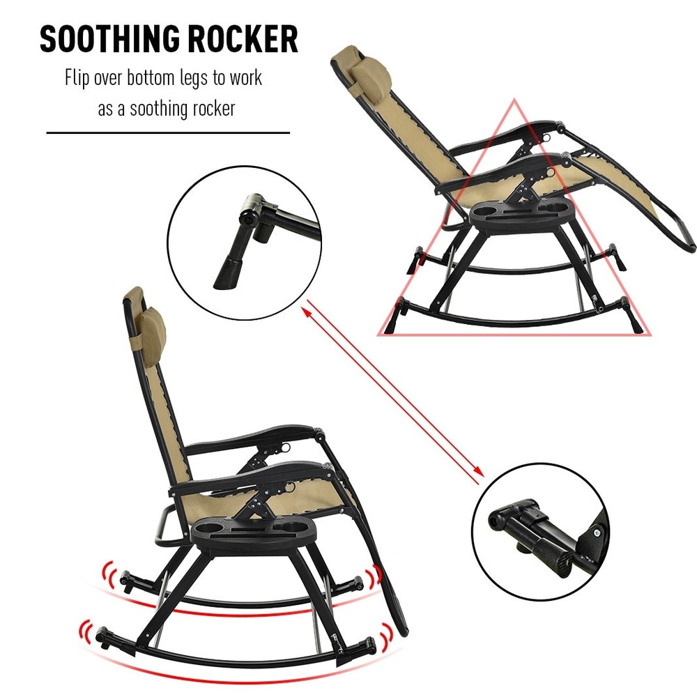 Blast off those shoes and tell Houston to put the lemonade on standby; next stop is zero-gravity comfort. Recline, lay down, sit, rock; it's all up to you. Our rocking zero-gravity lounge chairs have a cup holder, space for your phone, and snacks, all in a fast-folding design. Lounge on the patio, picnic on the porch, or keep them in the car for camping. They make any outdoor area a great place to nap. Get out, get comfy, get Outsunny. Features: Zero-gravity weightless feel double bungee support system Pick your favorite angle to recline to Folding legs can lock it in place Outdoor rocking chair Pillow headrest and ergonomic armrests Foldable for fast-moving and storage Large cup tray for holding drinks, food Strong powder-coated steel frameSpecifications: Color: Beige Materials: Free Shipping Over $49.99* Details Outsunny Folding Zero Gravity Rocking Lounge Chair with Cup Holder Tray, Durable Product Description: Blast off those shoes and tell Houston to put the lemonade on standby; next stop is zero-gravity comfort. Recline, lay down, sit, rock; it's all up to you. Our rocking zero-gravity lounge chairs have a cup holder, space for your phone, and snacks, all in a fast-folding design. Lounge on the patio, picnic on the porch, or keep them in the car for camping. They make any outdoor area a great place to nap. Get out, get comfy, get Outsunny. Features: Zero-gravity weightless feel double bungee support system Pick your favorite angle to recline to Folding legs can lock it in place Outdoor rocking chair Pillow headrest and ergonomic armrests Foldable for fast-moving and storage Large cup tray for holding drinks, food Strong powder-coated steel frame Specifications: ColorBeige MaterialsSteel Frame, Breathable Mesh Upright Dimensions47.25" L x 26.5" W x 40.25" H Fully Reclined Dimensions52.25" L x 26.5" W x 37.5" H Folded Dimensions43.5" L x 26" W x 6" H Seat Size20.5" W x 19.75" D Seat Height20.5" (Front), 17.25" (Back) Cup Holder Size15" L x 9" W x 2.25" T Weight Capacity265 lbs.