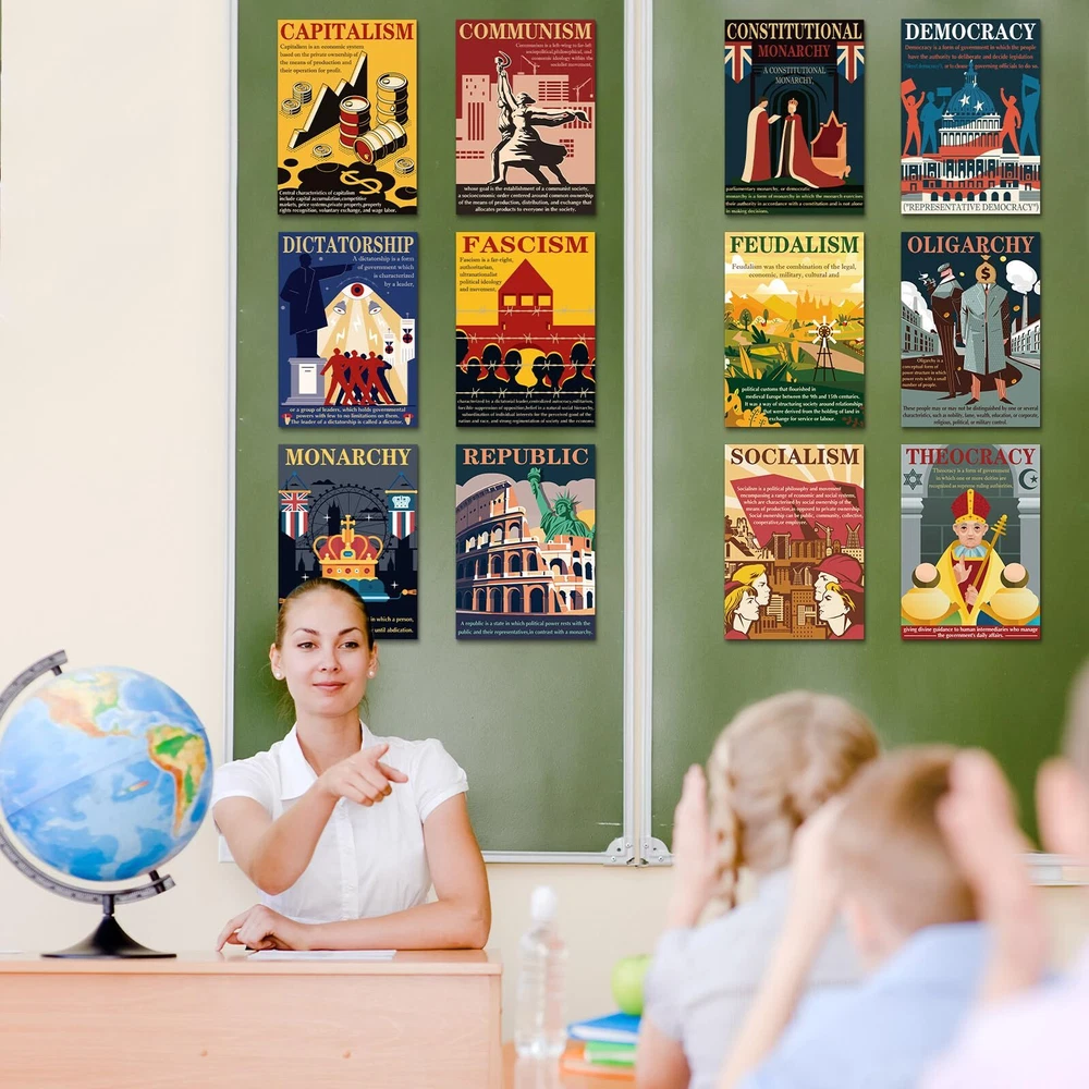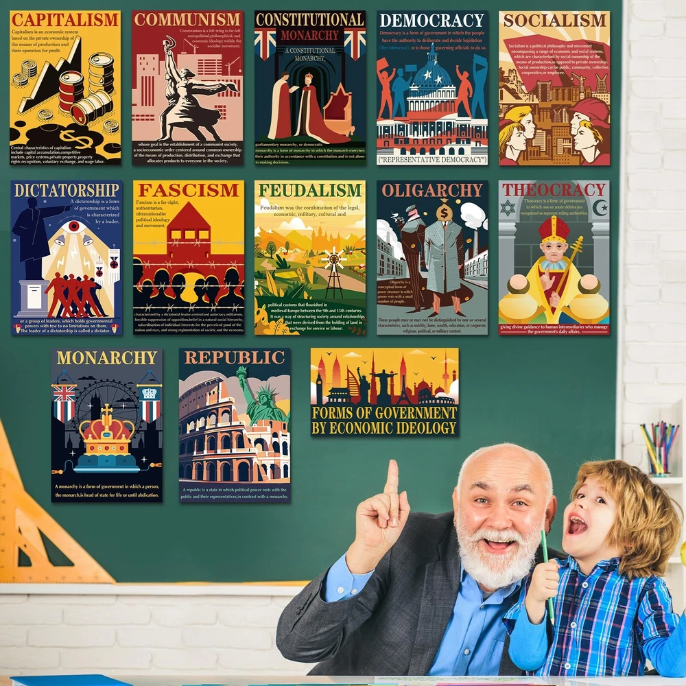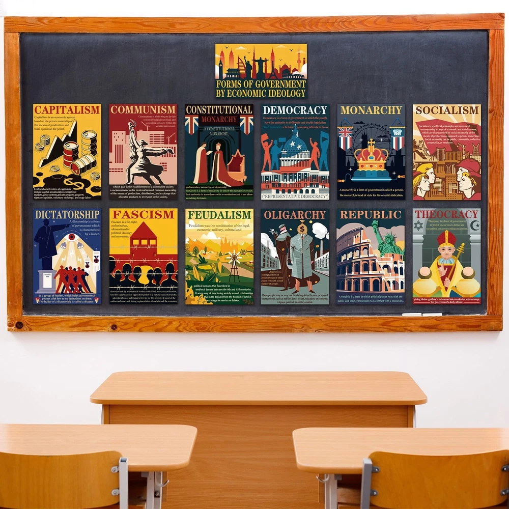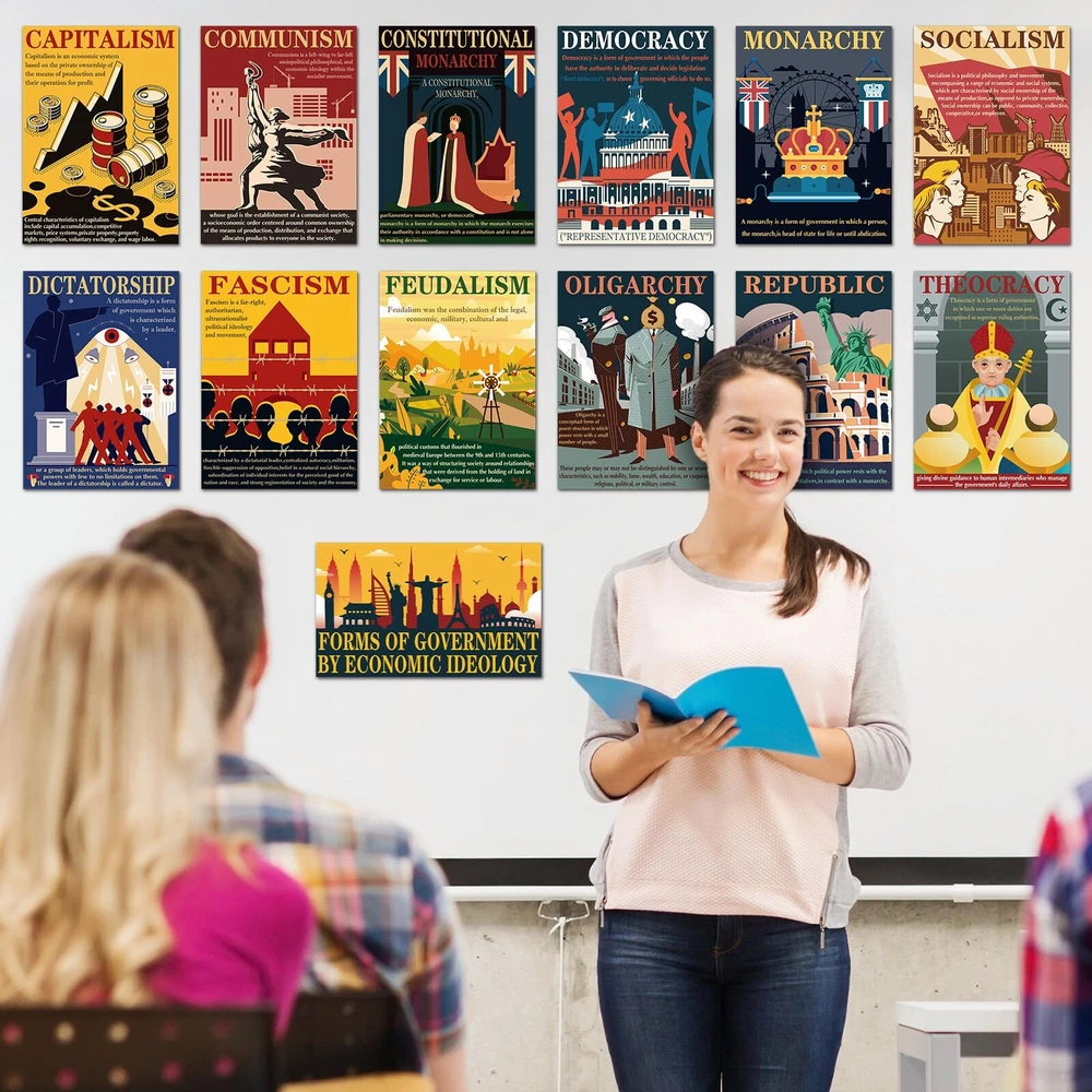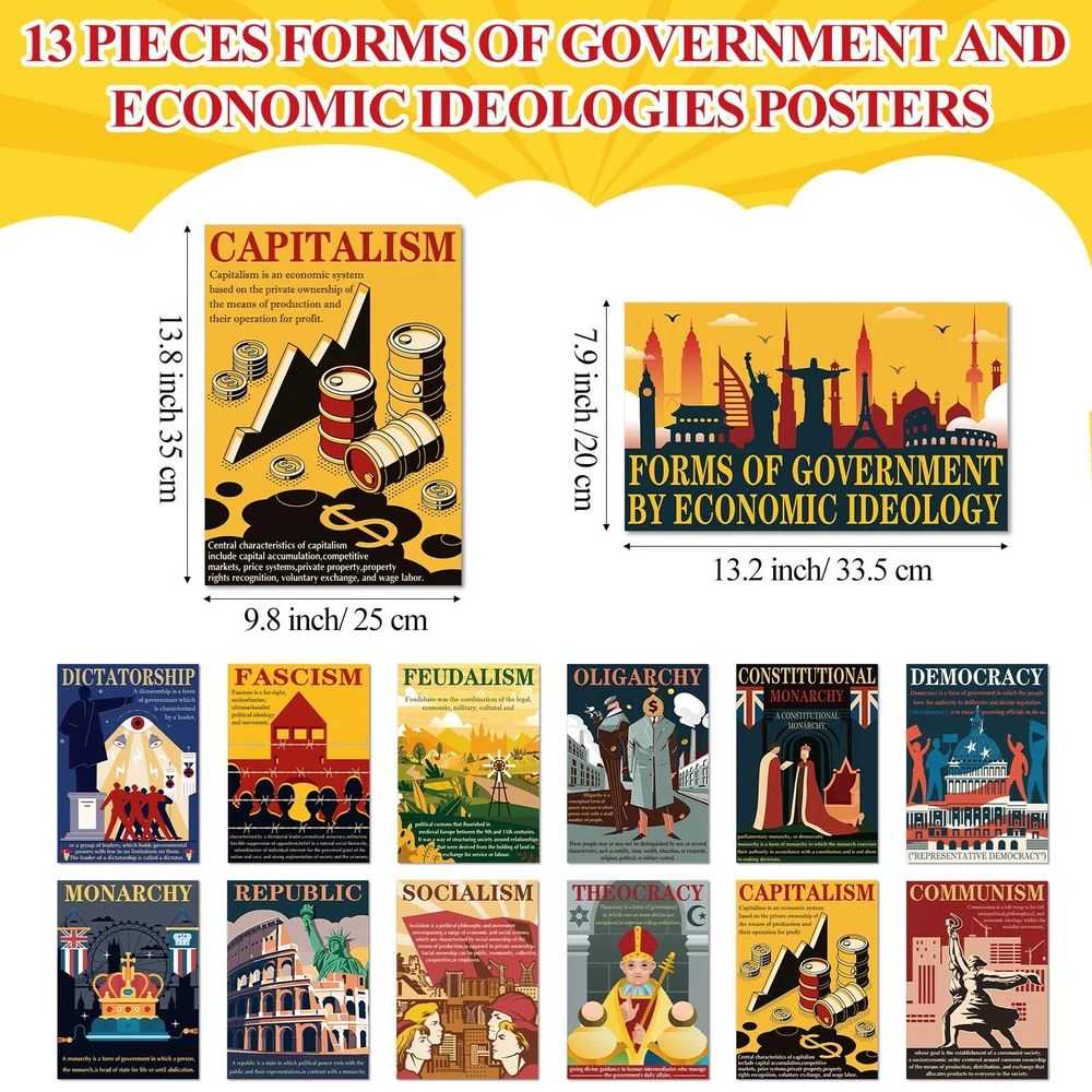 Feature: Sociology posters for classroom: Whenever you talk about government and economic ideology, every teacher will worry about whether the students are interested and whether they can understand. Then these branches of government posters can be your classroom must have. Decorative and educational: You can stick these social studies classroom posters on wall, blackboard, bulletin board, learning corner, school corridor and more. Through them, students can better understand the government and economic ideology, and better understand the historical development of world society. Specifications: Quantity: 13 Material: paper Color: as shown in the picture Size: Government poster: about 13.8 x 9.8 inch/ 35 x 25 cm Title poster: about 13.2 x 7.9 inch/ 33.5 x 20 cm Package includes: 13 x Forms of government and economic ideologies posters 4 Sheets adhesive dots Notes: Manual measurement, there may be slight differences in size. Due to the screen display, the color of the item may differ slightly from the picture. Government and Economic Ideologies Posters Set: the package includes 13 pieces of the forms of government and economic ideologies posters and tools for pasting, including capitalism, communism, constitutional monarchy, democracy, dictatorship, fascism, feudalism, monarchy, oligarchy, republic, socialism, theocracy and a title poster School Educational Supplies: these government and economic posters can show the concepts of government and economic ideologies, the students will clear and easy to understand their difference between concepts, suitable for government, politics, economics, world history, social studies and more class Durable Material: our social studies classroom decorations are made of quality paper and waterproof film which is reusable, tear resistant and easy to clean, you can use them to decorate your classroom, bedroom, home school, bulletin board, tutorial room, office and more Large Size: each government poster is about 13.8 x 9.8 inch/ 35 x 25 cm, while the title poster is about 13.2 x 7.9 inch/ 33.5 x 20 cm; The title words of the forms of government and economic ideologies poster is large and clear with no worry about students can't see clearly Fits the Theme Design: these forms of government and economic ideologies bulletin board decorations have designed with graphics that fit the theme. That will let students remember more deeply and understand more intuitively which suitable for middle school, high school, college and more