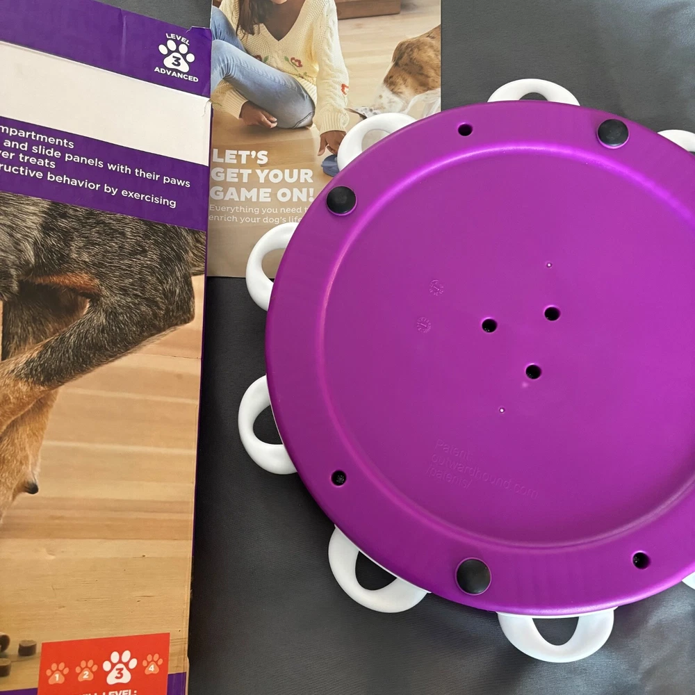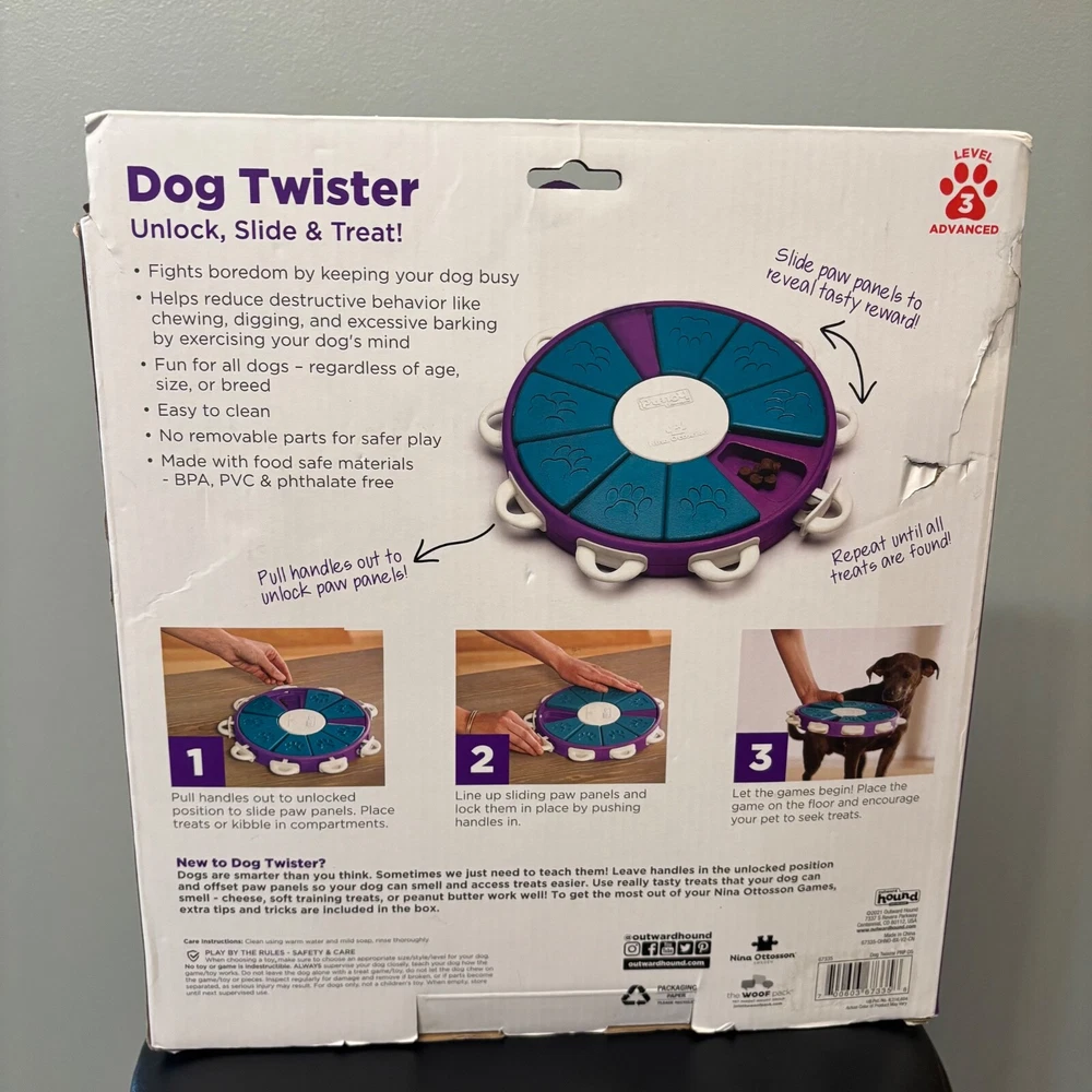 When you're looking for a toy for bored dogs who have mastered the simpler dog treat puzzles, this engaging level 3 advanced interactive treat puzzle from Nina Ottosson by Outward Hound is the perfect next step! The Dog Twister interactive dog puzzle toy features nine treat drawers for dog treats which are secured in place with nine white tabs. Just simply place the treats in the drawers, slide them in, and lock the white drawer tabs for an added sequential step challenge. Your pup will enjoy pawing, sniffing, and nudging around to reveal the hidden tasty rewards! The Dog Twister puzzle dog toy is made of durable BPA, PVC & phthalate-free material that you can feel safe using with your furry friend. Easy to clean with warm water and soap between uses. advanced level fun: The Nina Ottosson level 3 Dog Twister puzzle dog toy is designed for advanced levels of problem-solving play that challenge your dog with learning sequential steps. A fun way for your smart pups to train their brain while redirecting destructive or negative behavior in an exciting way! slide, pull, & lock to hide treats: Place the treats underneath the triangular block compartments and push in the white plastic tabs to lock the blocks in place. Your dog will have to lift the tabs sequentially to unlock the blocks and move them to reveal the treats! no removable parts & easy to clean: Built in play pieces that don't come out when your dog plays to prevent choking. Durable construction also helps to keep this dog toy intact, making it your new go-to treat puzzle dog toy. bpa, pvc & phthalate-free: Nina Ottosson by Outward Hound interactive treat dog puzzles are designed with your pet's health in mind from food safe materials that you can trust with your dog. Easy to clean with warm water and soap between uses. New - Open Box