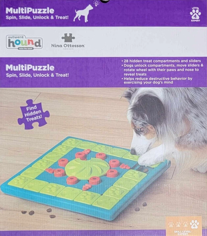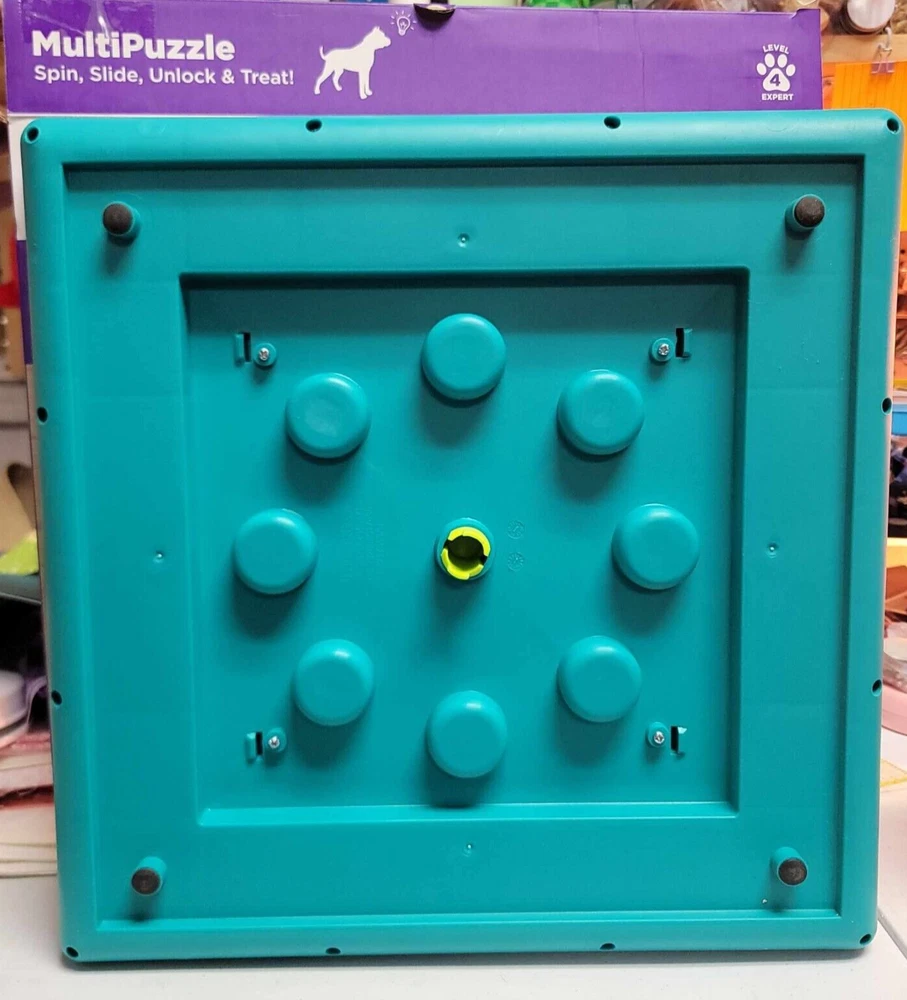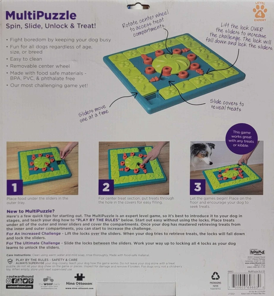 Outward Hound Multi Puzzle Level 4 Spin Slide Unlock & Treat THIS IS AN INTERACTIVE DOG TOY THAT SHOULD BE MONITORED WHILE IN USE From the back of the box: Fight boredom by keeping your dog busy Fun for all dogs regardless of age, size or breed Easy to clean Removeable center wheel Made with food safe material - BPA, PVC and phthalate free Our most challenging game yet! Sliders move one at a time. Rotate center wheel to access treats. Slide covers to reveal treats. Lift the locks over the sliders to increase the challenge. New to MultiPuzzle? Here is a few quick tips for starting out. The MultiPuzzle is an expert level game, so it is best to introduce it to your dog in stages and teach your dog how to "play by the rules" below. Start out easy without using the locks. Place treats under all the outer and inner sliders and cover the compartments. Once your dog has mastered retrieving treats from the inner and outer compartments, you can start to increase the challenge. For an increased challenge - lift the locks over the sliders. When your dog tries to retrieve the treats, the locks will fall down and lock the sliders. For the Ultimate challenge - slide the locks between the sliders. Work your way up to locking all 4 locks as your dog learns to unlock the sliders. Ships with USPS Ground (formerly First Class) package Local pick-up available. Must have eBay app on phone to scan the QR code. See my other listings below: https://www.ebay.com/usr/scruffi-dogg