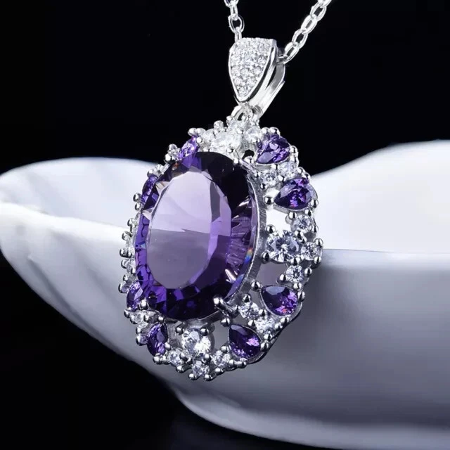 Occasion: Anniversary, Birthday, Christening, Christmas, Confirmation/Communion, Engagement, Graduation, Mother's Day, Valentine's Day, Wedding Material: Stone, Metal Country of Origin: India Chain Type: Box Vintage: No Cut Grade: Excellent Color: White Brand: karunas-76 Gemstone Clarity Grade: Na Signed: No Customized: Yes Type: Pendant Necklace Length: As per picture Setting Style: Prong Wholesale: Yes Main Stone Creation: Simulated Main Stone Length: As per picture Main Stone Color: Purple Country/Region of Manufacture: India Secondary Stone: Simulated Diamond Main Stone Depth: As per picture Theme: Beauty Main Stone Shape: Oval Features: Engraved Main Stone Treatment: Not Enhanced Closure: Snap Personalize: Yes Base Metal: Silver Metal: Sterling Silver Style: Pendant Era: Undated Number of Gemstones: Na Antique: No Handmade: Yes Metal Purity: 925 Pendant Shape: Oval Seller Warranty: Yes Main Stone: Amethyst Pendant/Locket Type: Charm Main Stone Width: As per picture
