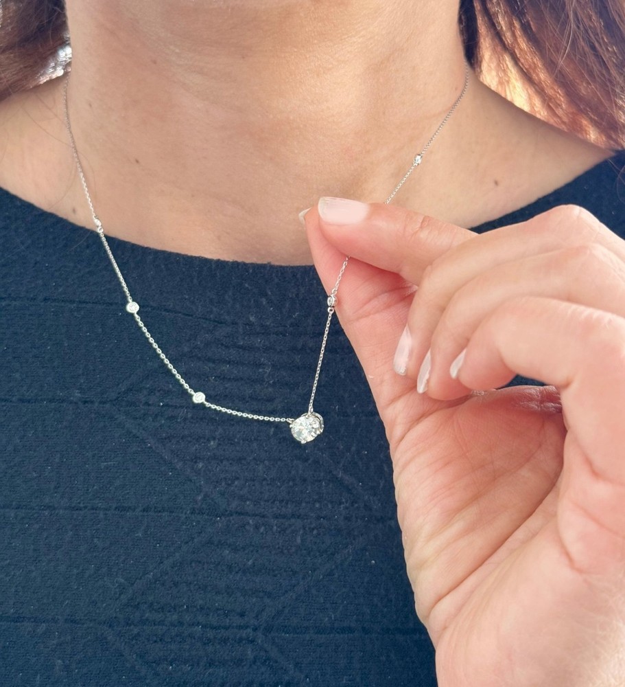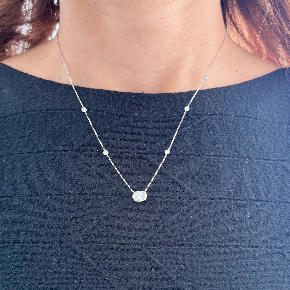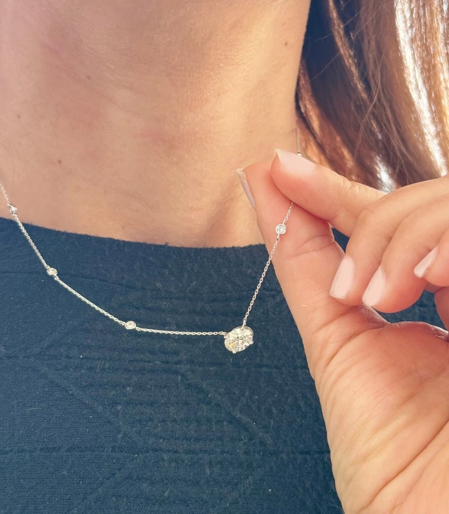 Lab grown diamonds are in fact chemically, optically and physically identical to earth mined diamonds, but are more ethical, beautiful and affordable than any diamond we will ever get out of the earth The singular difference between lab-created diamonds and mined diamonds is their origin. All of the aspects of a diamond, how it looks, its chemical composition, and its physical properties remain, while all of the bad parts - destructive mining and muddled ethics are removed. Product Description: Add refined elegance to any jewelry collection with this exquisite Oval Cut IGI Certified Diamond and Round Cut Diamond Necklace Pendant, beautifully crafted in 14k solid white gold. The brilliant oval-cut center diamond is accented by shimmering round-cut diamonds, creating a graceful and luminous design with a total diamond weight of 2.30ctw. The elongated oval shape offers timeless sophistication and exceptional sparkle. Inspired by a classic diamond-by-the-yard style, this pendant features a combination of prong and bezel settings for both brilliance and security. The prong-set diamonds allow maximum light exposure, while the bezel-set accents add a sleek, modern touch. The polished white gold setting enhances the diamonds’ natural fire, making this necklace effortlessly elegant and versatile. Perfect as a luxury gift, anniversary present, or meaningful milestone piece, this IGI Certified diamond pendant necklace is designed for everyday elegance and lasting beauty. Whether worn alone or layered with other favorites, it is a timeless statement piece she will treasure for years to come. Item Information: Main Stone: Carat Weight: 2.00ct Clarity: VS2, very clean Color: F, white Cut: Oval, Excellent cut and shine Side Stones: Carat Weight: 0.30ct Clarity: VS2, very clean Color: F-G, white Cut: Round, Excellent cut and shine Appraisal: IGI Certificate Included Metal: 14k solid white gold