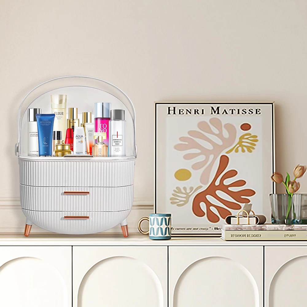 This egg-shaped makeup storage box is a total game-changer! The sleek oval design and gold accents add a touch of elegance to my vanity while keeping everything organized. I love how the clear lid makes it easy to spot my favorite products, and the two spacious drawers fit all my smaller makeup essentials. It holds way more than expected without cluttering my countertop—perfect for anyone who loves style and functionality!