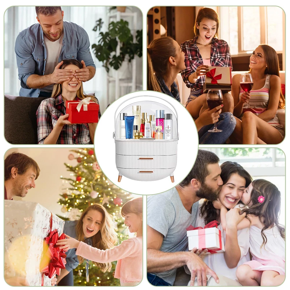 [Stunning & Awarded Design]With a stunning curved design(golden plated supporting legs and drawer handles, this makeup organizer is also a charming ornament for any countertop, vanity or dresser. [Large Capacity&Compartment ]The top compartment can store about 12 tall bottles and the bottom 2 drawers are ideal to store your lipsticks,eye shadow,brushes, jewelry and other little pieces. [Wide Open Clear Lid]With high clear lid,you can easily see throught the box and get/put back your makeups without any hassle. [Grab&Go] With the belt handle,box can be easily moved by one hand to other place if you gonna clean your table/vanity desk, or travel. [Ideal Gifts]Keep skincare organizer staying on her dress tabletop, LOVE woulp keep lasting when she dressing. Ocasion: Valentine's Day Gift,Gift for daughter,gift for girl,gift for girl friend.