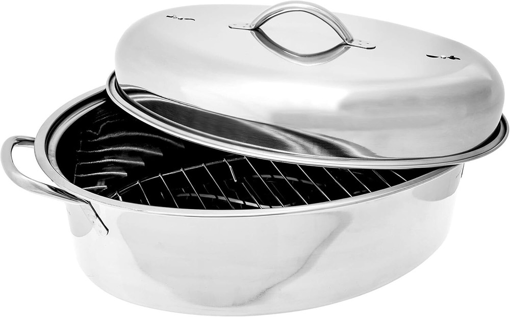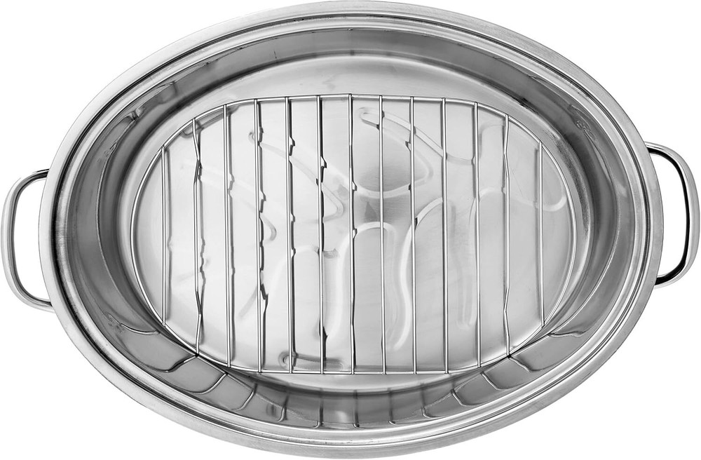 Oval Roaster Set, Stainless Steel, 10-Quart DURABLE DESIGN: This roaster set is constructed from 18/0 stainless steel, ensuring it will serve you well for many s to come. RETAIN TEMPERATURES: Featuring a high domed lid, this unique design will keep your roast at the ideal temperature. MAXIMIZE YOUR MEAT: Includes a removable chromed roasting rack that elevates your meat, underneath which will fill with succulent juices. EASY TO CLEAN: This set is dishwasher safe for easy cleaning, just be sure to keep it on the top rack. MEASUREMENTS: This oval roaster set weighs pounds and has dimensions of 12 x x 8 inches. Roast your favorite poultry, meat, seafood, or vegetables using this large 10-quart/10L Oval Roaster! Made of durable 18/0 stainless steel, heat is evenly circulated to give your dish the perfect roast. This set includes a removable chromed roasting rack that elevates your meat, underneath which will fill with succulent juices, and a high domed lid that keeps your roast at the ideal temperature. This oval roaster set is perfect for your chicken and beef dishes, as it allows proper roasting by lifting your Thanksgiving or holiday turkey, chicken, rib roast, or duck up out of its juices for an even, all-around browning. You can also easily baste your roast in its own juices to keep it moist, tender and tasty. Be the hit of the holidays with this set!