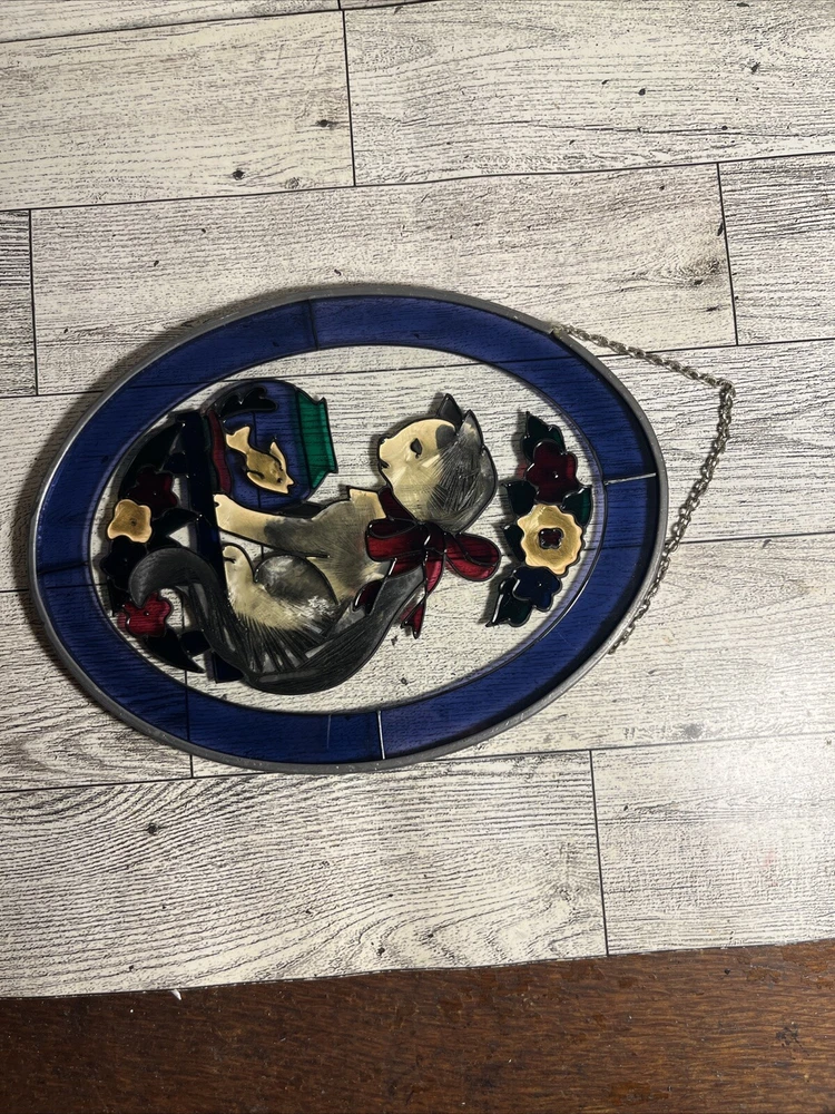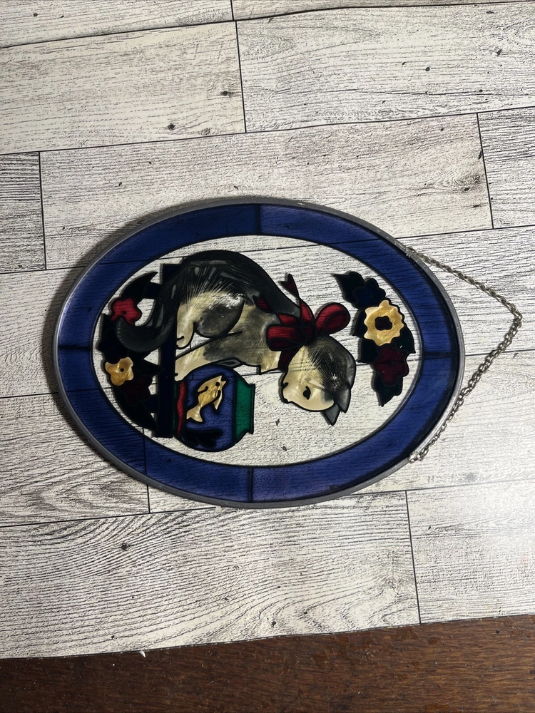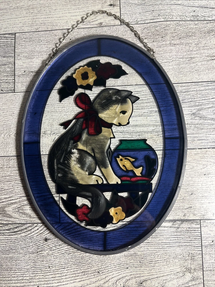Very Good Condition! Beautiful & Vibrant Colors Add a touch of charm to any room with this beautiful oval-shaped stained glass window/wall decor. Featuring a cute cat and fish design, this piece is perfect for adults who love to add a touch of whimsy to their home decor. The multicolor glass and metal materials give it a unique and eye-catching finish that is sure to brighten up any space. Measuring approximately 8.5” in height, this window/wall decor is versatile enough to be hung in any room. The intricate cat and fish design is sure to delight anyone who sees it, making it a great addition to any home decor collection.