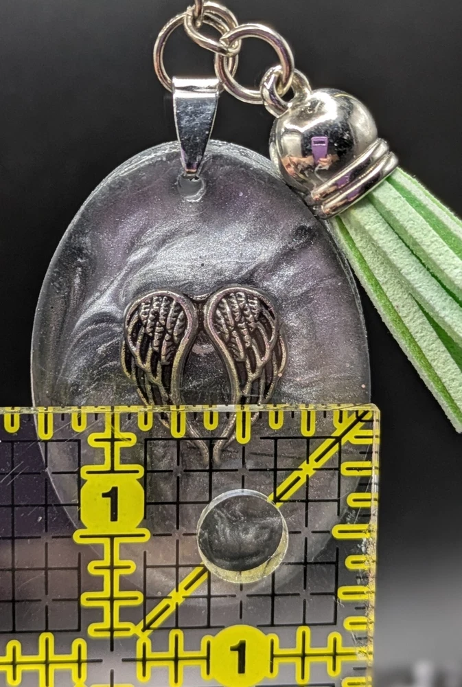Add a touch of elegance to your keys with this beautiful handmade oval silver resin keychain. The keychain features an angle wings charm and a green tassel that adds a pop of color to your keys. Made in the United States, this keychain is a perfect addition to your collection of handcrafted pieces. The unit quantity is one keychain. This item is perfect for those who love handmade one of a kind items. This keychain is a unique piece that will make a great addition to your collection. DISCOUNTED: The price is lowered about 25% due to slight imperfections. Original price - $5.00, discounted price $3.75