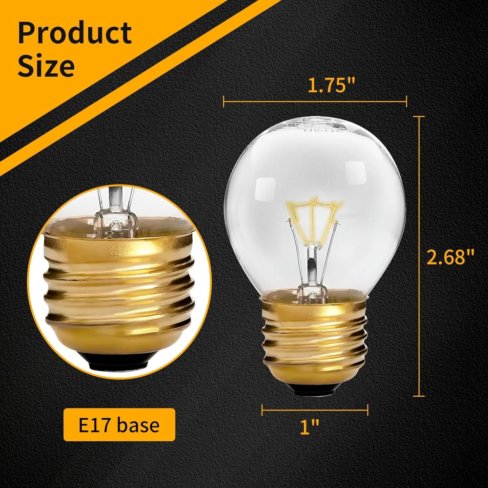 This appliance light bulb could be used in oven, stove, range hood, microwave, refrigerators, fridge, garden light fixtures and other household appliances Compatible with Maytag GE Kenmore Whirlpool and other brand. US Standard G45 E26/E27 Socket, work with 110v / 120v / 130v, 40W, Medium Brass Lead-Free Base Withstand 300 °C high temperatures, durable and long lasting. Pack of 4 appliance light bulbs. Bulb size: 2.68" X 1.76" Product Description Store Bulb Model List Add to Cart Add to Cart Add to Cart Add to Cart Add to Cart Add to Cart Customer Reviews 4.2 out of 5 stars 938 4.5 out of 5 stars 637 4.5 out of 5 stars 6,549 4.5 out of 5 stars 5,295 4.7 out of 5 stars 171 4.5 out of 5 stars 618 4.5 out of 5 stars 183 Price $9.13 $ 9 . 13 $8.06 $ 8 . 06 $7.99 $ 7 . 99 $6.68 $ 6 . 68 $8.59 $ 8 . 59 $5.43 $ 5 . 43 $6.58 $ 6 . 58 Socket Base US Standard G45 E26/E27 Socket E17 G8 bi-pin base E17 Base E17 E17 Base E12 Power 40W 40W 20W 40W 40W 40W 15W Voltage 110v / 120v / 130v 130V 120V 125V 130V 125V 120V Replaces for the Part / WB36X10003 WB25X10019 WB36X10213 8206232A WB36X10003 8206232A WE05X20431, WE4M305 etc Quantity 4 Pack 2 Pack 2 Pack 2 Pack 3 Pack 3 Pack 2 Pack