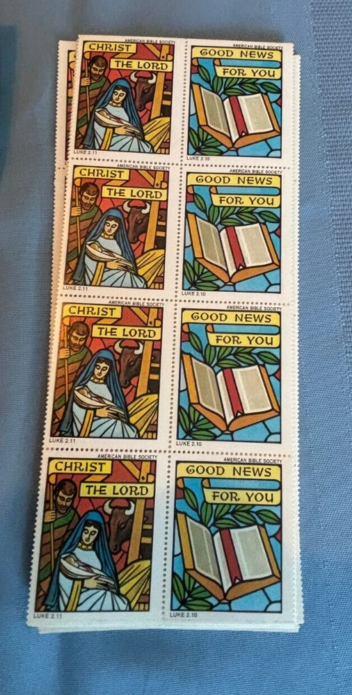 This is a lot of over 300 UNUSED vintage American Bible Society seals or stamps. These are from the late 60s and 1970 and 1971. The neon colored ones are not dated. A lot are full sheets. All in good condition. Please check the shipping fee to your area, using the shipping calculator on this listing. Returns accepted within 30 days of purchase. Please contact me before returning. I strive for 5 star ratings & will do my best to make my customers happy!