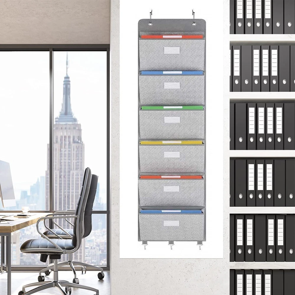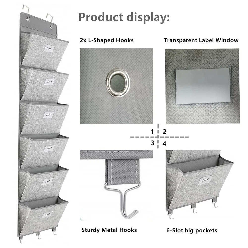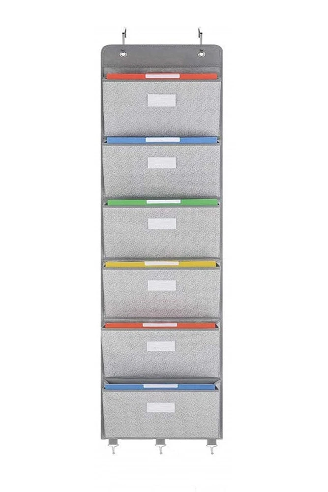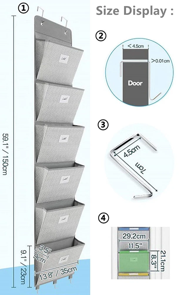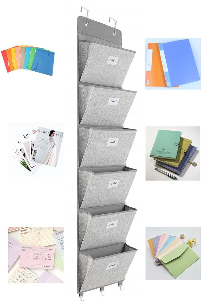 Over The Door File Organizer - 6 Extra Large Pockets Hanging Wall Mounted Storage Files Holder Pocket Chart for Magazine, Notebooks, Planners, Mails etc. Office Home Supplies ✓ Free 60 Day Returns ✓ Free Express Shipping Description: Features: Over The Door File Organizer Made Of Non-Woven Fabric ,Each Pocket With A Thick Card Board ,Three Equipped Hooks On The Bottom, Corrosion Resistant And Durable Perfect Size For Storage: 2x L-Shaped Hooks,1 X 6-Slot Hanging File Organizer (13.8"Lx3.5"Wx9.1"D For Each), Large Files Holder Pocket Keeping Your Home Or Office Tidy ,A Great Storage Holder Options For More Office Space And Improve Your Working Efficiency Wall File Organizer Adopt Two Non-Corrosive Grommets And Enhanced Support Plate Along The Top, Strong Load Bearing For Easy Hanging On The Wall Or Door, And Also Hanging On The Wall By Installing Screws Or Adhesive Hooks File Folder Storage Designed With Transparent Label Window On The Surface Of Each Pocket, And Then Storage The Files Or Things Into Different Pockets.You Could Easily Classify Different Complicated Files Hanging File Folders Is Foldable, Easy To Carry Away And Install.It Could Storage Magazines, Notebooks, Files Or Other Things As You Like.Keep Files And Documents, Mails, Bills And Any Other Stationeries Organized Product Details: Color: Gray Material: Cardboard Product Dimensions: 13.8"L x 3.5"W x 59.1"H Item Weight: 0.83 Kilograms Brand: Geodurn Unit Count: 1.0 Count Manufacturer: Godurn UPC: 744591637480 Part Number: GE10 Item Weight: 1.83 pounds Product Dimensions: 13.8 x 3.5 x 59.1 inches Country of Origin: China Item model number: GE10 Shape: Square Number Of Pieces: 6 Mounting Type: In Wall Included Components: Bag Batteries Required?: No Date First Available: November 16, 2021