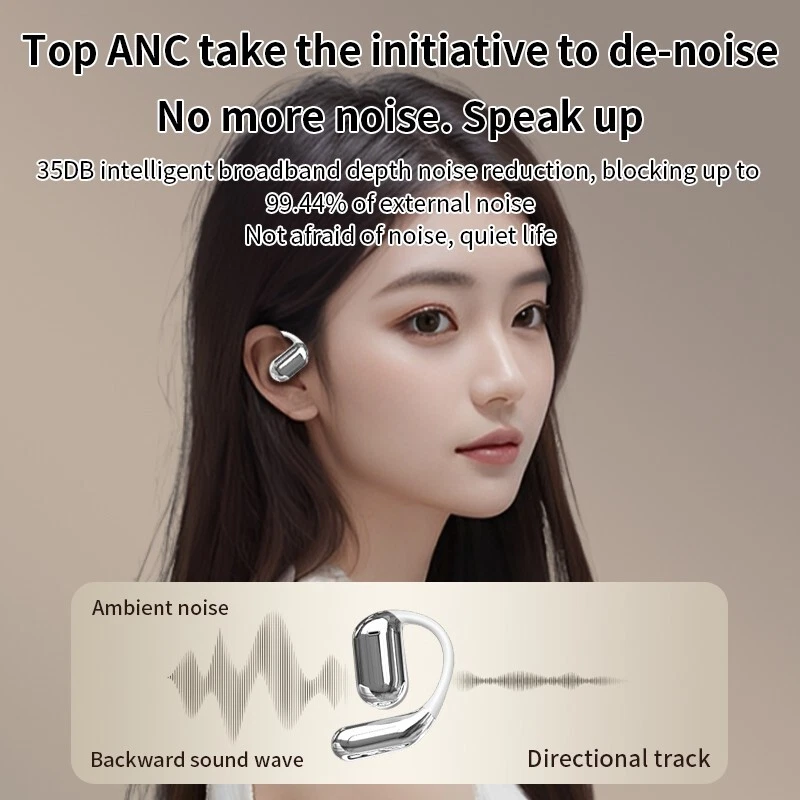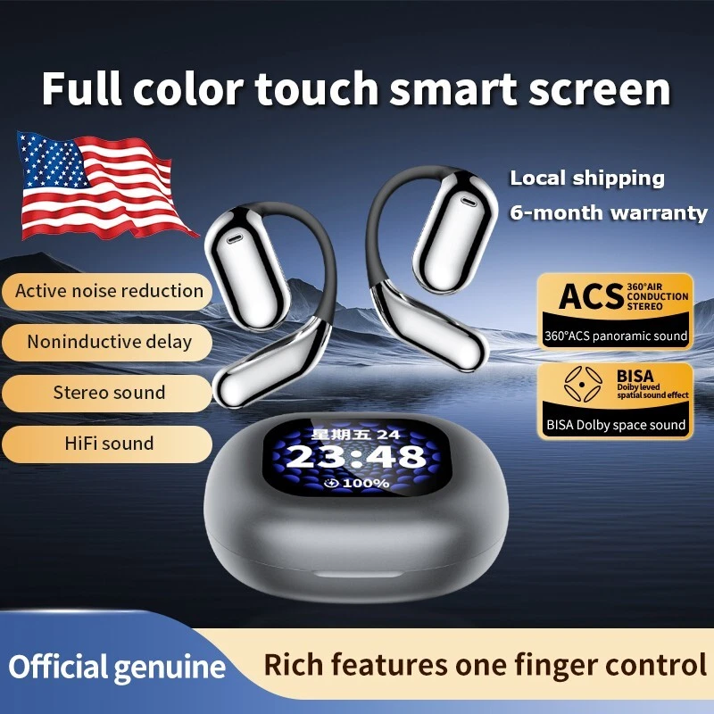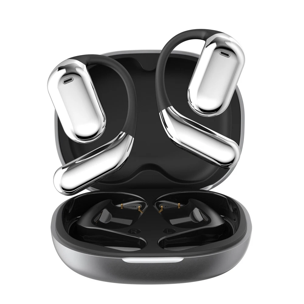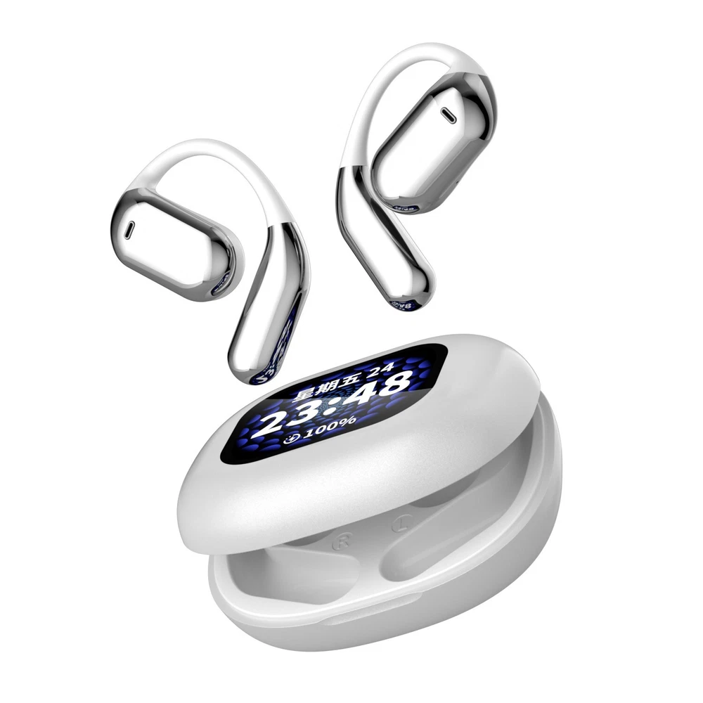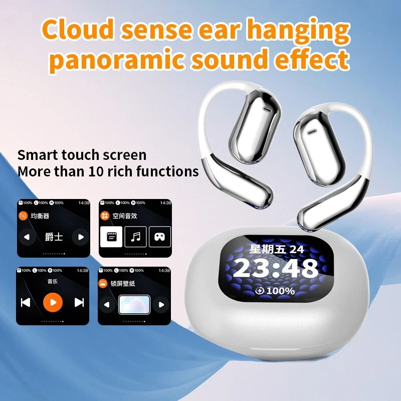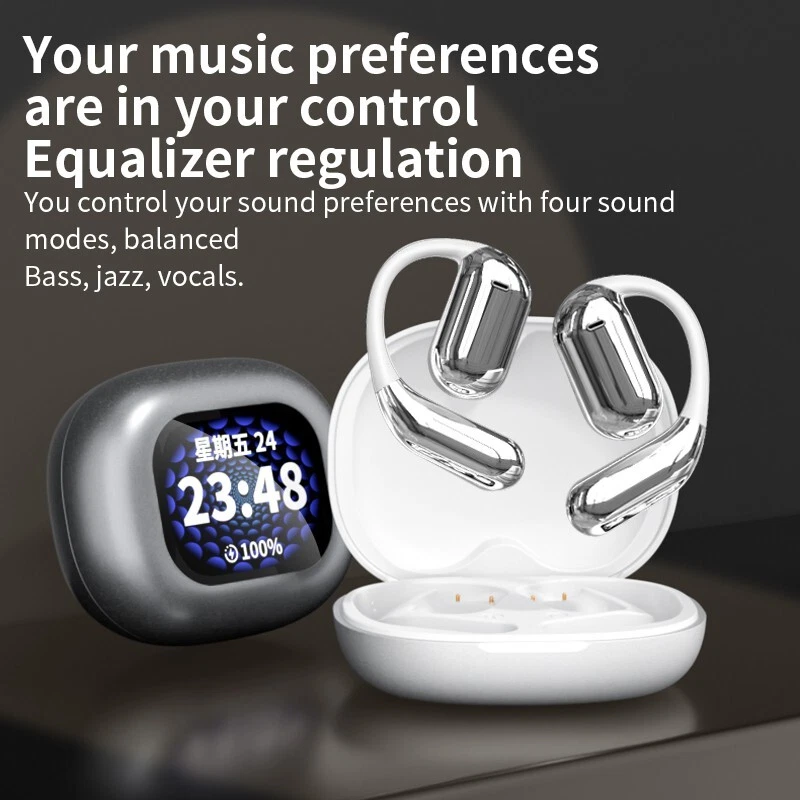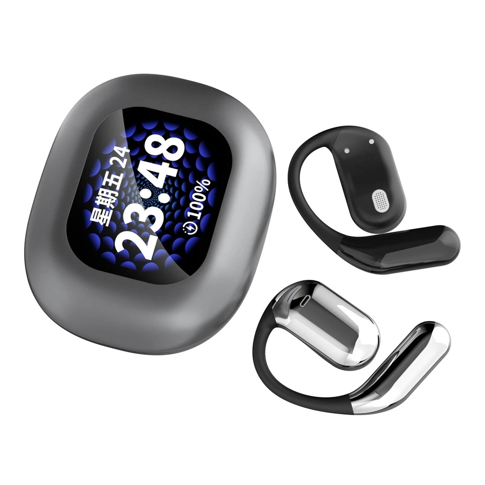 Over The Ear Earbuds Wireless Earphones, True Wireless Open Ear Headphones Bluetooth 5.4 Bone Conduction Earbuds With Touch Control LED Display Waterproof With 14.2mm Speakers Air Headsets For Sport Running Workout Fitness,Black / Silver