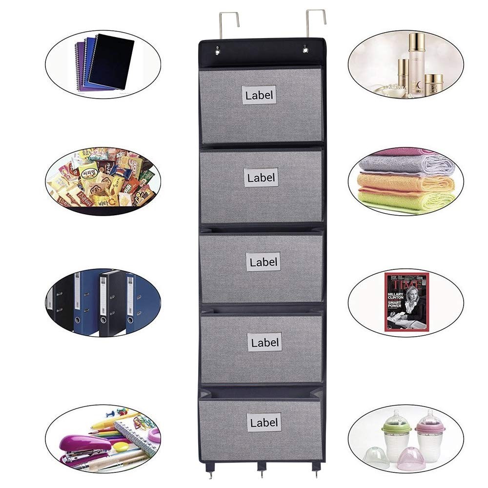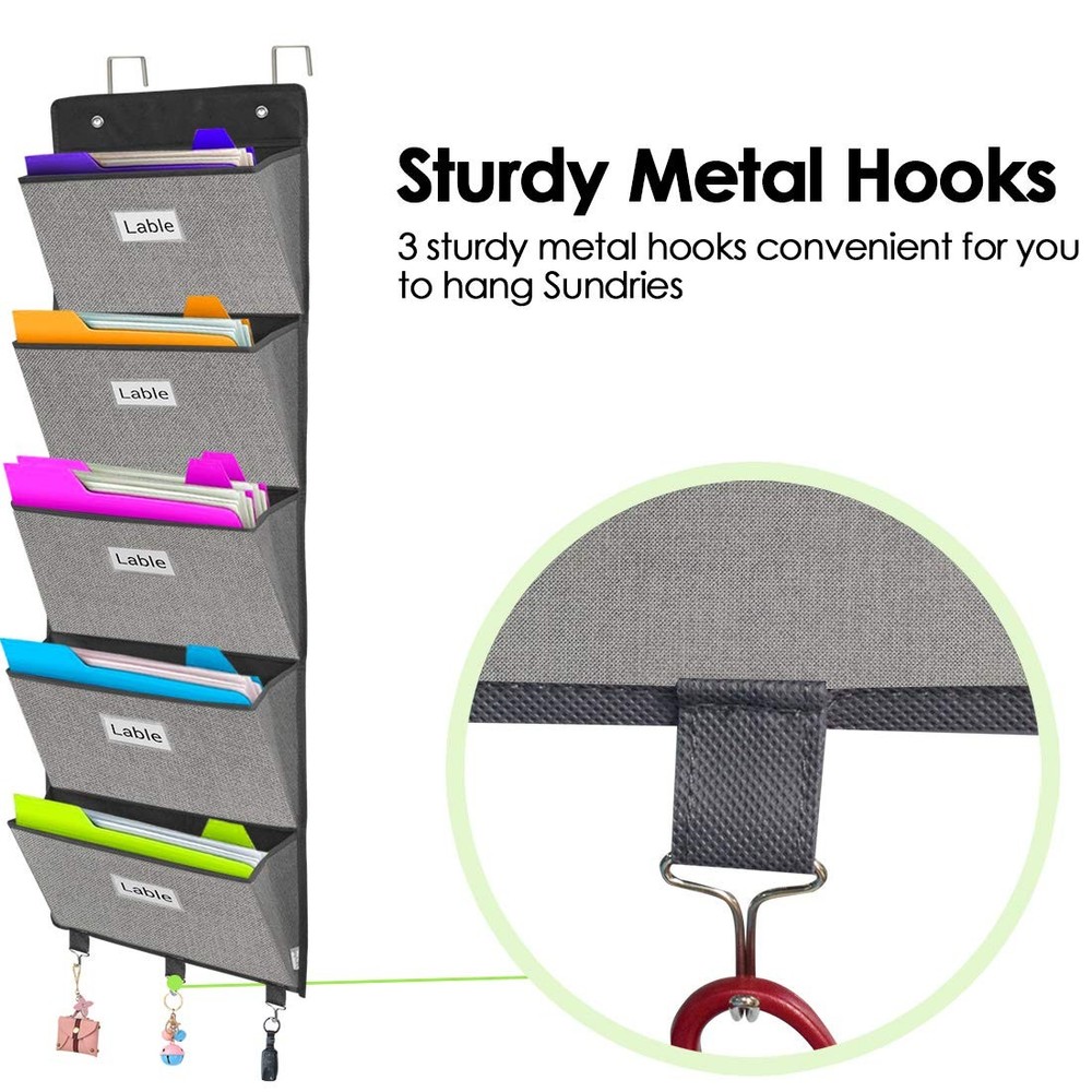 back to school Hanging wall file organizer,Big and deep pocket,Easy to hang,Perfect wall file solution,Heavy duty well made quality ,Ideal for teachers homework and office Make you feel organized- This over door file organizer is a perfect solution for storing files,mails,paperwork, magazines,homework which can help you save some tabletop space and handy you find what you want right away. Big and deep pockets- The large pockets of the hanging file folder can easily hold 5 magazines or 600 papers each layer without stretching or losing their shape. Real big capacity. Easy to hang- The folder pocket chart comes with 2 metal hooks that are good for cubicles or over-the-door applications. You can aslo hang this on the inside of your coat closet.The Grommets at the top are large enough to work for most command hooks. So you can use Command hooks to put the hanging wall files organizer on the wall. A perfect addition to your family office wall- You can use the wall file holder to store take-out menus, food coupons, grocery coupons, and school information sheets. It's sturdy and you can tell it will hold up well. PERFECT WALL FILE SOLUTION- A total of 5 large pockets measuring 3.54" inside width, by 9" inside depth, for office and teacher classroom organization and storage. The large pockets can easily hold 5 magazines or 600 papers each layer and we’ve tested the products holding without tearing, ripping, or any quality issues. Start use this over the door file organizer to keep your desktop clean and organized today! HEAVY DUTY & WELL MADE QUALITY - Measures 13.8” Wide and 50.39” Long. These hanging file folders are made from two layers long-lasting fabric with thick card board inside. Most others just use one simple layer fabric which will fall apart or tear. Two non-corrosive grommets along the top for easy hanging. IDEAL FOR TEACHERS, HOMEWORK AND OFFICE- Keep your classroom organized. Use this back to school wall file organizer to slot in daily work lessons for absentees to catch up on missing work. Don’t lose important papers. Hang in the hub of your house to organize family activities.Display scholastic magazines. Create a homework log for the week. Use each slot for a different subject for homework. SAVING MORE SPACE- Free up space on your desk. Place your staplers, pens, pencils, etc. in the pockets of this hanging file organizer to keep everything in one place. Perfect to increase storage options for small office space and improve your filing system.Have one for each child in their rooms for homework and activity organization. Maximize vertical space. FOLDABLE AND ECO-FRIENDLY All our products includes this over door mail organizer can be folable and easy carrying. All the fabric we used are environmental. Please feel free to use.