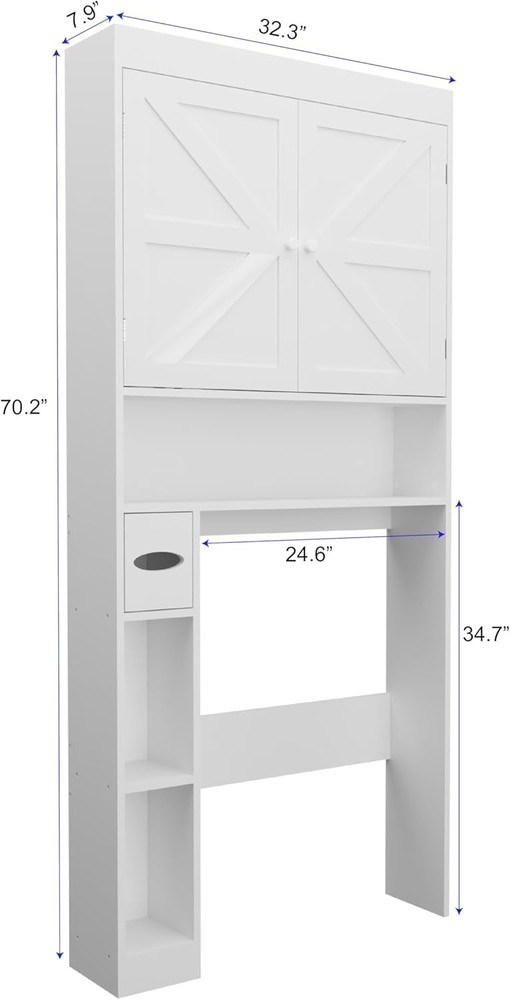 Product Description Maximize bathroom space & style! This durable over-the-toilet storage cabinet features sturdy particle board and MDF construction, built to last in humid environments. Its smart vertical design combines a top cabinet for hidden essentials with an open shelf below for easy access, plus a dedicated toilet paper holder. Perfect for small bathrooms (32.28"W x 7.87"D x 70.2"H), it offers ample storage without sacrificing floor space. Enjoy timeless farmhouse charm with modern function, keeping your bathroom organized and clutter-free. About this item Durable and High-Quality Materials Built to Last: This over-the-toilet storage cabinet is made from premium particle board and MDF, ensuring it withstands daily use in humid environments like bathrooms. The sturdy construction is designed to provide long-term durability while maintaining a stylish appearance that complements various bathroom decors. Smart Design Maximizing Vertical Space: Featuring a cabinet with doors on top and an open shelf below, this unit maximizes the use of vertical space, integrating seamlessly with the toilet. The left-side open shelf allows for easy access to frequently used items, while the cabinet keeps other essentials neatly hidden away, helping you maintain an organized bathroom. Enhanced Functionality with Thoughtful Storage Solutions: The bottom open shelf not only provides display space but also features a dedicated area for toilet paper, ensuring all your bathroom necessities are within easy reach. This thoughtful design helps to reduce clutter, keeping your bathroom looking tidy and well-organized. Compact and Space-Saving Design for Small Bathrooms: With dimensions of 32.28''W x 7.87''D x 70.2''H, this cabinet is perfect for smaller bathrooms, utilizing the vertical space above the toilet without taking up additional floor area. It offers ample storage while keeping your bathroom feeling open and spacious. Timeless Farmhouse Style with a Modern Touch: Designed with a charming farmhouse aesthetic, this storage cabinet brings warmth and elegance to any bathroom. The clean lines and subtle details make it a timeless addition that effortlessly enhances the style of your space.
