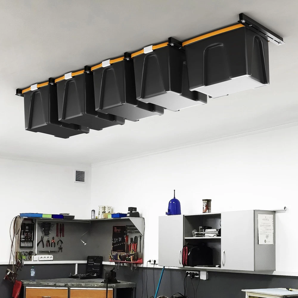 Solid Construction: Crafted from high-strength steel, the overhead garage ceiling storage racks feature a robust design that supports up to 176 pounds per set, securely storing items in overhead space Rust-Resistant Coating: Featuring a black powder coating, this ceiling storage rack resists rust and wear, ensuring long-lasting durability and reliable storage for years Expandable Storage Capacity: The ceiling storage rack adjusts to fit various bin sizes and features T-shaped bracket that can be expanded by connecting multiple sets, providing even more flexible storage space. Convenient Installation: This ceiling rack mounts easily to 16-inch or 24-inch ceiling studs and comes with detailed instructions and hardware. It fits 7-27 gallon storage bins, offering a simple and efficient solution for maximizing ceiling storage Efficient Ceiling Storage: Maximize garage space by storing items overhead. This ceiling storage rack system frees up valuable floor space, helping you keep your garage neat, organized, and clutter-free Solid Construction: Crafted from high-strength steel, the overhead garage ceiling storage racks feature a robust design that supports up to 176 pounds per set, securely storing items in overhead space Rust-Resistant Coating: Featuring a black powder coating, this ceiling storage rack resists rust and wear, ensuring long-lasting durability and reliable storage for years Expandable Storage Capacity: The ceiling storage rack adjusts to fit various bin sizes and features T-shaped bracket that can be expanded by connecting multiple sets, providing even more flexible storage space Convenient Installation: This ceiling rack mounts easily to 16-inch or 24-inch ceiling studs and comes with detailed instructions and hardware. It fits 7-27 gallon storage bins, offering a simple and efficient solution for maximizing ceiling storage Efficient Ceiling Storage: Maximize garage space by storing items overhead. This ceiling storage rack system frees up valuable floor space, helping you keep your garage neat, organized, and clutter-free