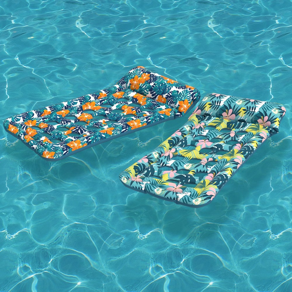 is dedicated to providing quality seasonal equipment to meet the needs of water party pool lake beach recreation vacation enthusiasts everywhere. Please feel free to message us with any questions! UNIQUE Design: The outside of the air chamber is covered with lots of holes to keep you cool, making it great for sun tanning. More comfortable and cooler than other ordinary plastic non-breathable loungers. Feature Weight capacity: up to 250 lbs. Large size for adult: 73" x 33" Holes design: more coolingComfortable and dries off fast for storage. Easy and quickly inflated with 2 fast valves(headrest and body). When inflating the pool rafts & inflatable ride-ons, please use the large valve inside to inflate the float to near full capacity at first, then cover the inner valve and use the small valve on the outside for additional inflation (note: if the float appears uneven in the process of inflation, such as C-shaped, please do not worry, this is due to uneven force, you can lightly pat the float and appropriate pressure) If you have any questions, please feel free to leave us a message through "Seller". Ultimate Comfort Tanning Pool Floats: This 2 pack luxury pool float lounger makes you feel like lying on a soft bed in the pool, sunbathing, the ultimate in comfort and enjoyment this summer. Perfect for the pool party, sea, beach, lake, river and summer vacation. Oversized and Heavy Duty Pool Floaties: The size of the pool floaties for adults is 73" x 33"(Fully inflated), Weight capacity of the rafts for pool adults is up to 250 lbs, it is comfortable, lightweight and wide enough to make you stable lie on without falling off. Muti-Hole Design: The pool hammock is covered with lots of hole, which allows water to flow through the internal holes to keep you cool, making adult pool float lounger great for sun tanning. Portable Desgin: The fabulous adult floats for pool work well in water, make your pool time more fun. Easy and quickly inflated with 2 fast valves(headrest and body). Dry off fast for easy storage. You can take it for your outdoor travel conveniently. Keep Cooling & Balance: The holes of beach floats design keeps you balanced to avoid falling over into the water and allow water touch your skin. Plus the inner contour chamber inflatabales are made of premium vinyl material, more sturdy and durable.