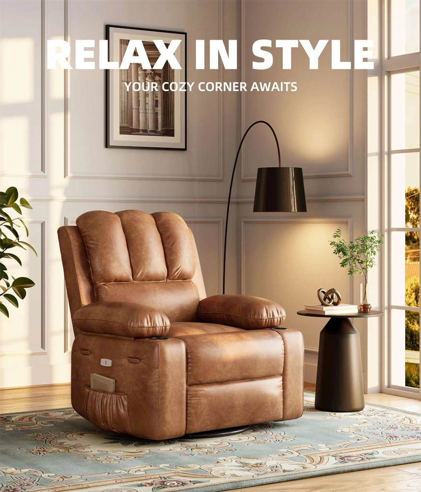 This oversized electric recliner is a game-changer for relaxation! The massage and heat features melt away stress, while the smooth 360° swivel and gentle rocking make it perfect for lounging, gaming, or napping. The extra-wide seat and plush cushioning provide cloud-like comfort, and the durable PU leather looks sleek. It reclines effortlessly with the touch of a button—ideal for unwinding after a long day. A fantastic blend of luxury and functionality!