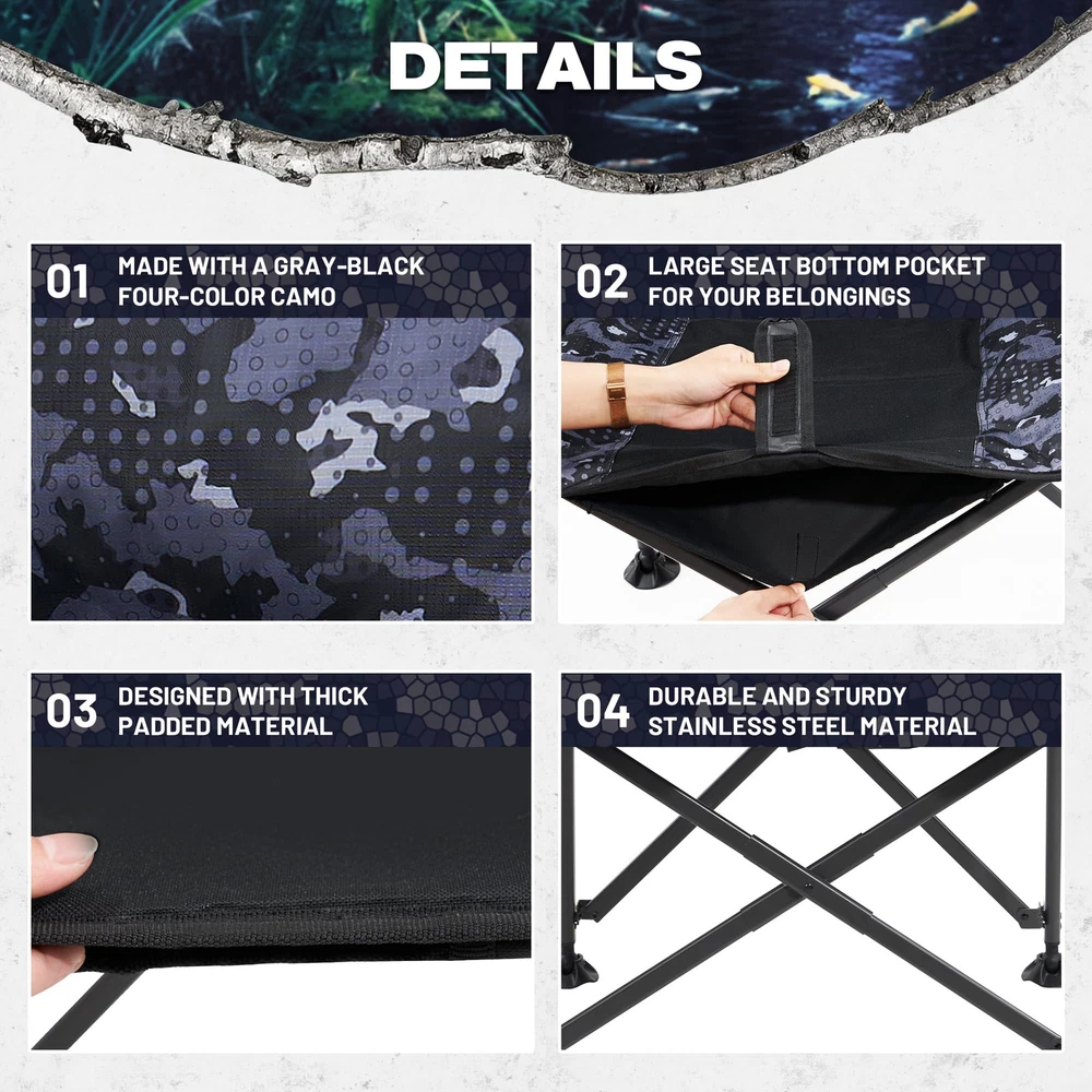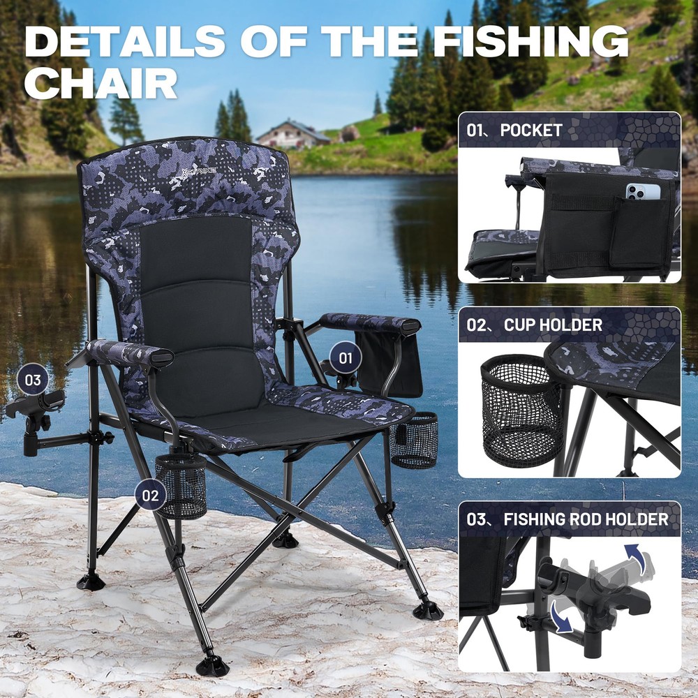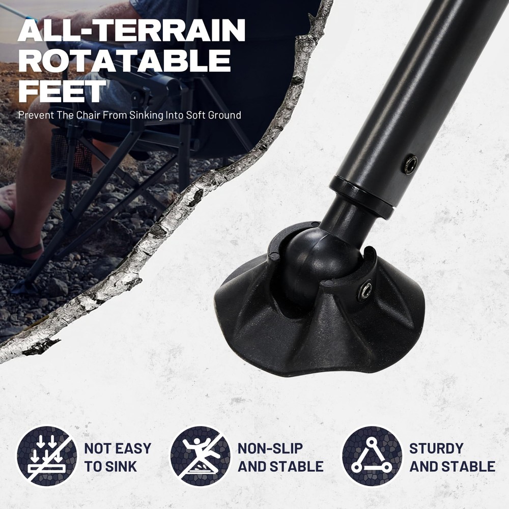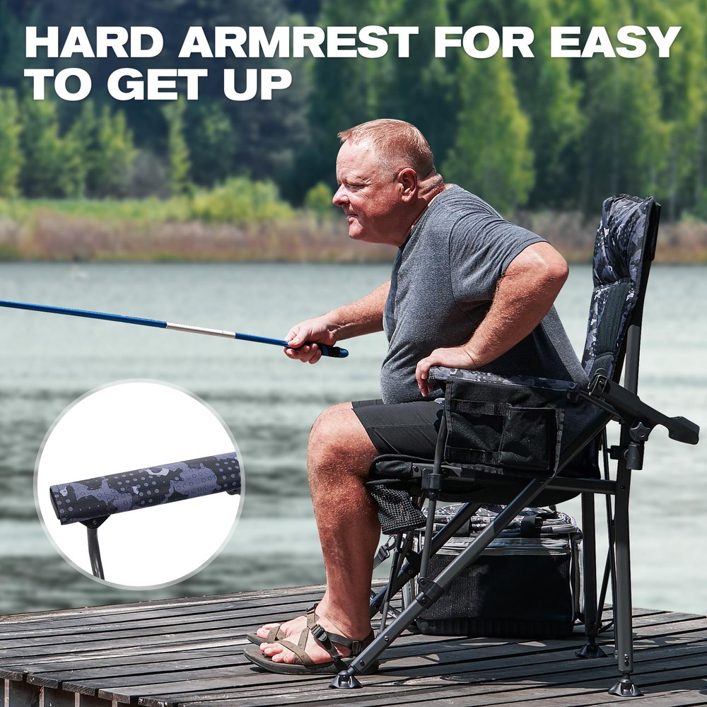 OVERSIZE FISHING CHAIR: Our new large-size fishing folding chair is made of durable 500D polyester dyed fabric, capable of supporting up to 350 lbs. It features a high backrest and padding, making it more comfortable than small fishing chairs. It is perfect for camping, fishing, picnics, and other outdoor activities, suitable for most people to use. ALL-TERRAIN ROTATABLE FEET: This fishing chair features rotatable feet that keep it stable on any rugged terrain. It allows you to rotate the feet on the front legs, and the wider chair legs help reduce pressure and prevent the chair from sinking into soft ground. It can be easily applied to any terrain, allowing you to enjoy fishing in wetlands, glaciers, valleys, and more. ADJUSTABLE ROD HOLDER: Our folding fishing chair is equipped with removable rod holders on both sides, which can be adjusted up and down, as well as left and right, without moving the chair. You can adjust the height of the fishing rod as needed, freeing your hands to do other things, allowing you to focus more on fishing. EXTRA STORAGE SPACE: The fishing chair features durable mesh cup holders on both sides for conveniently placing drinks or equipment. It also has a black storage bag on the side that can hold all your fishing tools and accessories, such as pliers, scissors, and other tools, providing maximum convenience during your fishing experience. MULTIPURPOSE OUTDOOR FOLDING CHAIR: This chair is specifically designed as a professional fishing chair, catering to various fishing needs. In addition, it can be widely used for camping, picnics, outdoor patios, balconies, lawns, backyards, gardens, and any other outdoor activities. No matter where you are, you can sit down and rest your tired body.