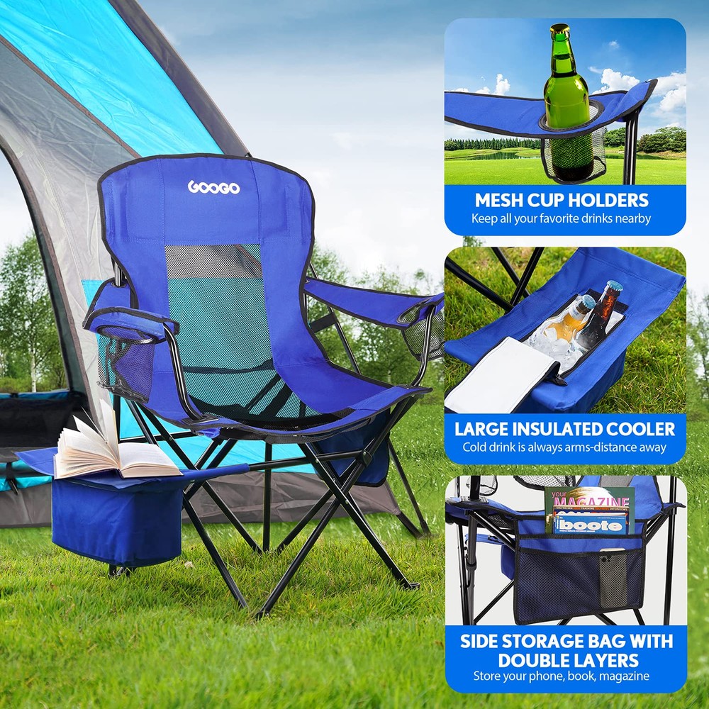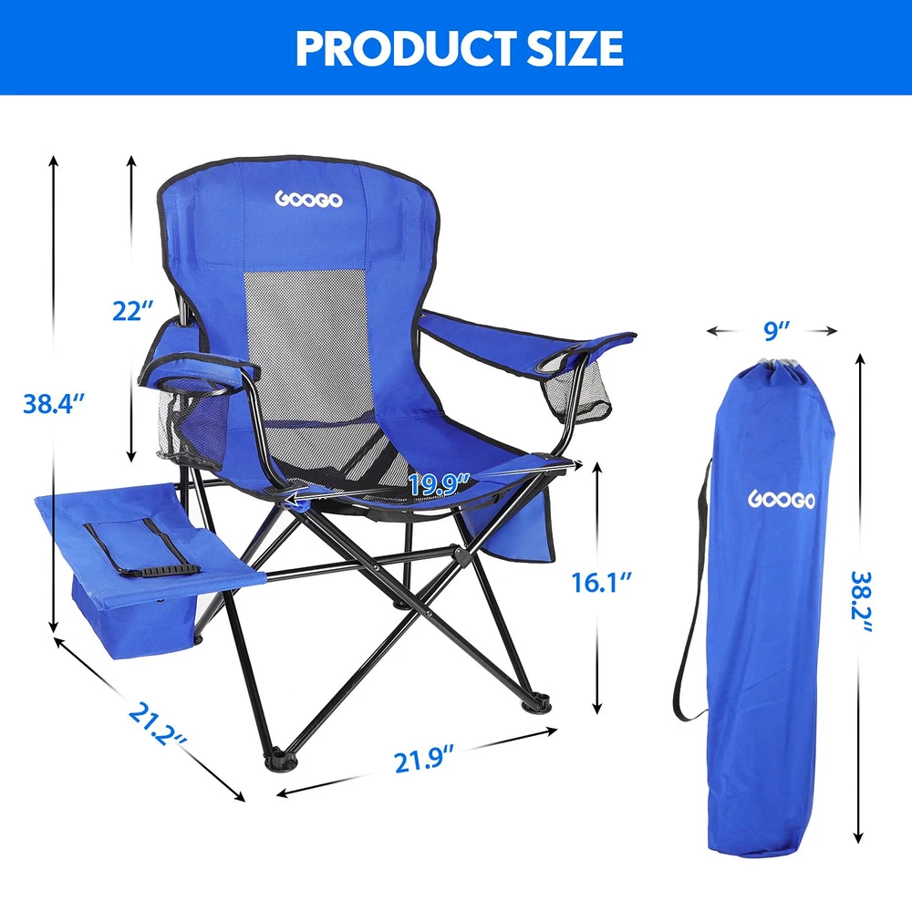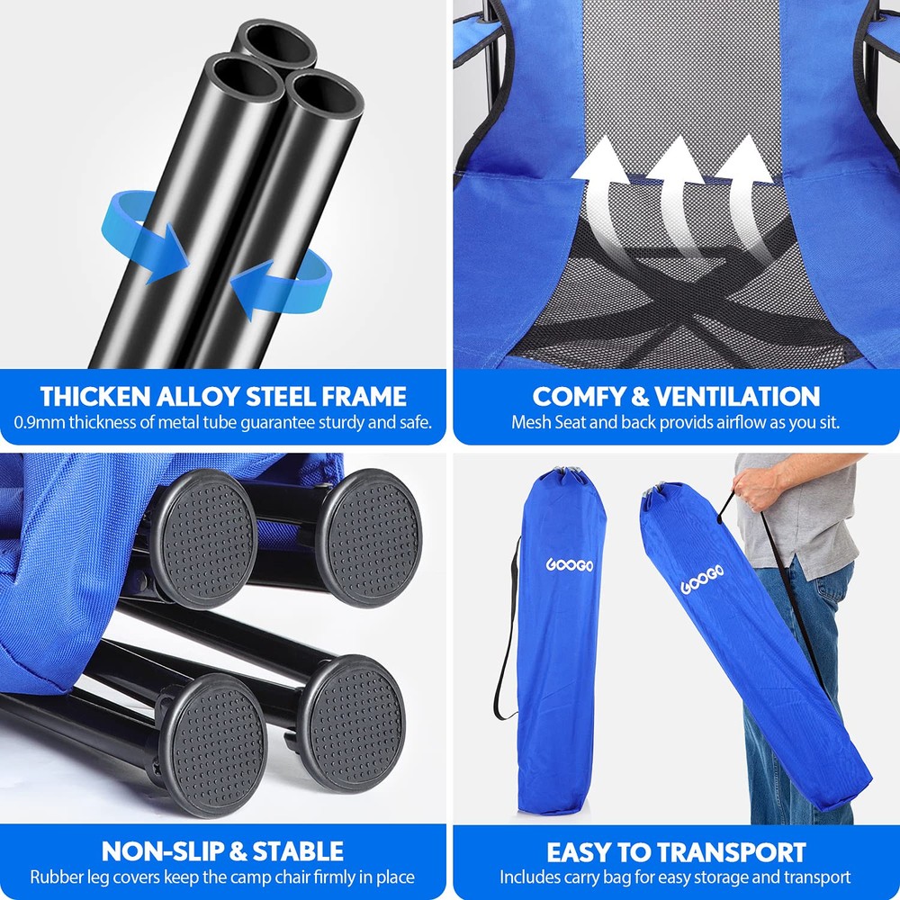 Spacious & Comfortable: Our folding camping chair has 22 inches seat back height, 23.3 inches seat width, 19.9 inches seat depth and 16.1 inch height from ground to seat. With a high back design and roomy seating area, this chair provides a more supportive and comfortable sitting experience. Thanks to the higher seat, you can sit down and stand up with ease. Build to Last & Sturdy: The foldable camping chair is built with a powder-coated Alloy Steel frame and 600D polyester fabric, boasts a weight capacity of 300 pounds. This fabric is more dense and durable without deformation after long use. This four-legged, tip-proof camp chair also has solid rubber feet to make it more stable on uneven terrain. User-Friendly & Relaxation: If you want your hands free, this outdoor chair has plenty of room for stashing stuff with 2 mesh cup holders keep drinks and other items within reach(one on each armrest), a side zipper cooler with Velcro at the end which can put an ice pack in it and will keep your drinks cool or storage your phones, snacks, keys. The side storage bag works nicely to store your book, magazine too. Easy to Fold & Carry: The portable chair easily folds up into a carry bag for easy transport and storage. Built-in strap and clip folding system for quick and easy carrying. A strap is more convenient than a bag - the quicker and easier for you to grab the chair and go. It is a travel friend for most adults and backpackers. It is quite suitable for camping, hiking, picnic, beach, or any other outdoor activities. Great Ventilation & Easy to Clean: The camp chair has mesh seat and mesh back, providing more airflow around your body as you sit, making it perfect for hot weather camping, or for those glorious heatwave days at the beach or park. In addition, the compact camping chair is really easy to clean, you just need to sweep or clean with soapy water.