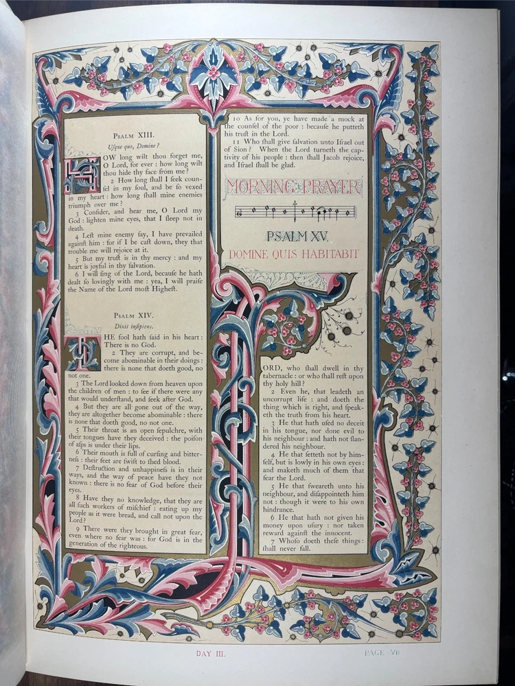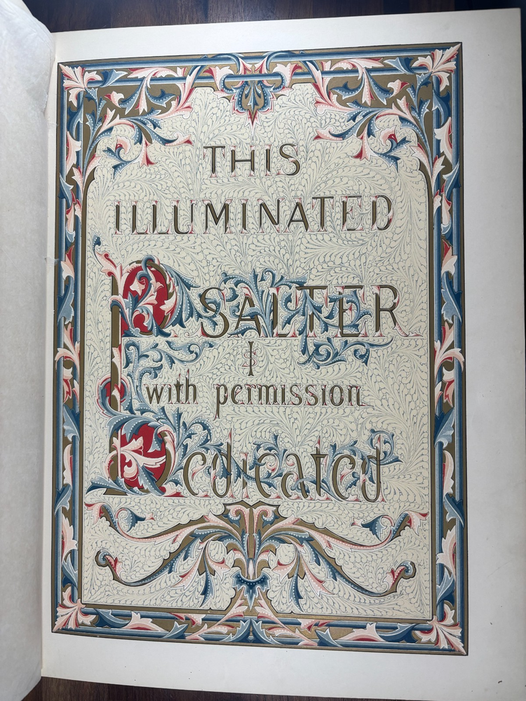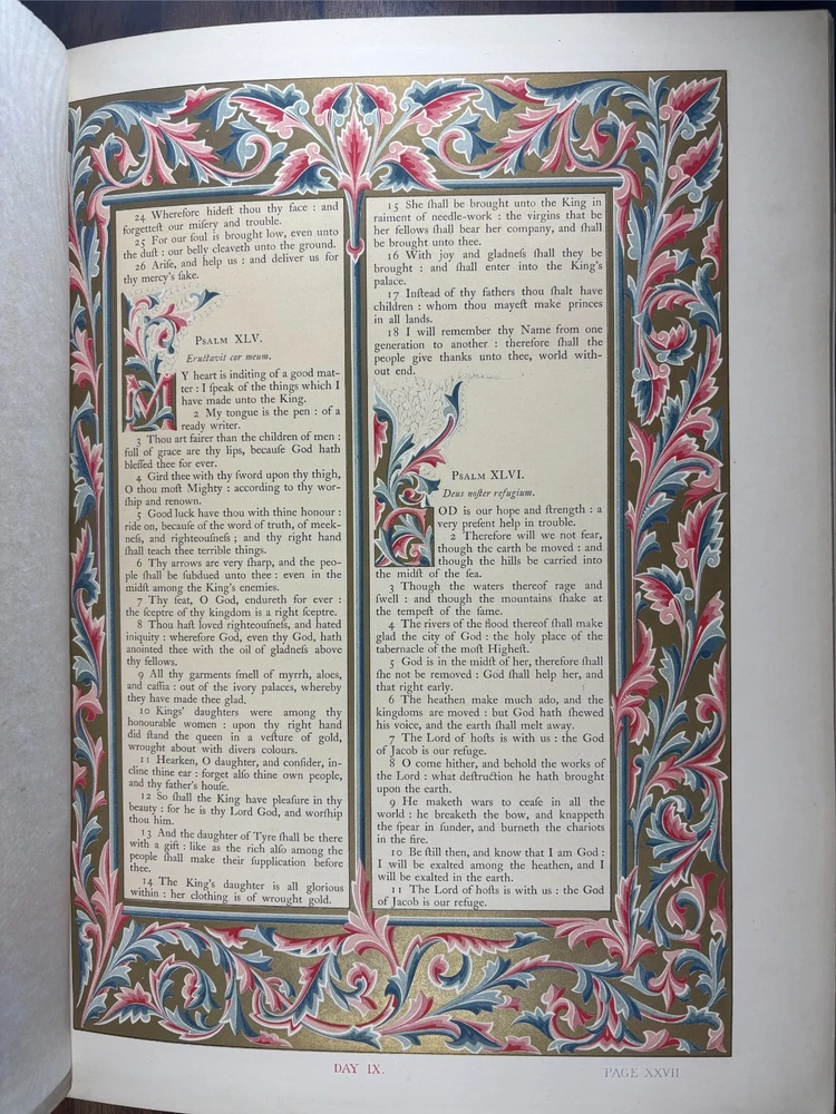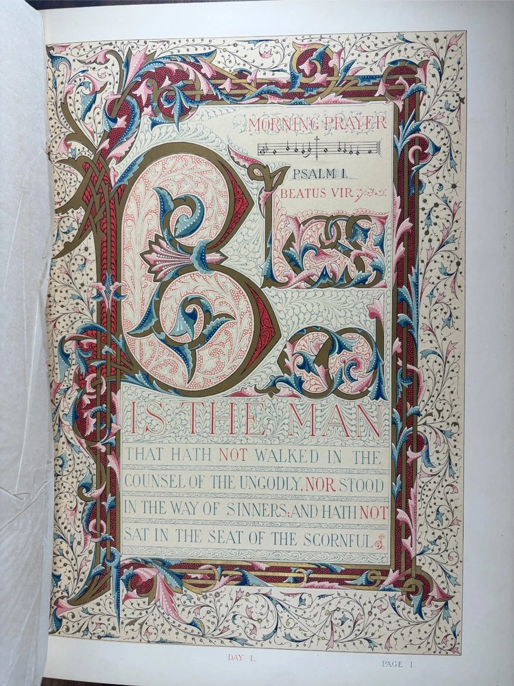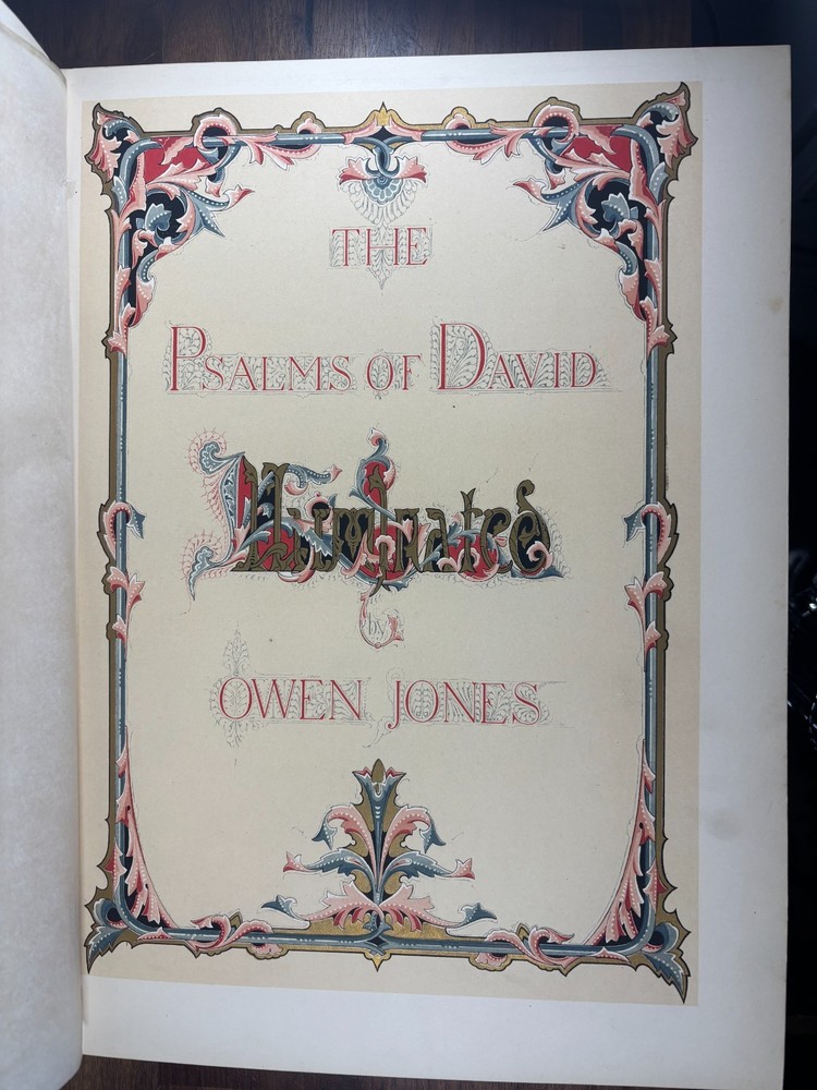 The Victoria Psalter, Illustrated by Owen Jones A spectacular and richly illuminated edition of the Psalms of David , designed and chromolithographed by the celebrated Victorian designer Owen Jones and published circa 1861–1862 . This is one of the most visually impressive 19th-century devotional works, produced as a prestige object for the Victorian middle and upper classes and dedicated to Queen Victoria herself. This copy contains 52 leaves , each lavishly printed in full chromolithography with ornate borders, illuminated initials, and decorative panels. Every leaf features unique page ornamentation , a hallmark of Jones’s design philosophy and colour theory. The book retains its original relievo binding — an embossed, sculptural style of binding over heavy boards, characteristic of the finest Victorian gift books. These bindings were produced using a specialised embossing press and are themselves highly collectable. Condition Binding: Original relievo embossed leather boards , gilt edges, some expected age wear. Pages: Clean and bright , chromolithography vivid; light age-toning to margins in places. All original. Collation: 52 leaves complete and continuous from Psalm 1 to Psalm 150. Spine: Minor cracking at the very top and bottom. This specimen was previously repaired. There are added tissue guards to protect the leaves within. About Owen Jones (1809–1874) Owen Jones was one of the most influential designers of the Victorian era — an architect, theorist, typographer, and colour innovator. His landmark book The Grammar of Ornament (1856) shaped generations of designers and established many of the decorative principles of modern design. Jones was a pioneer of chromolithography , insisting that high-quality colour printing could elevate the printed book to the level of medieval illuminated manuscripts. The Victoria Psalter is often regarded as one of his crowning achievements , combining meticulous ornament, vibrant colour, and cutting-edge 19th-century printing technology. His work influenced Arts & Crafts designers, Art Nouveau artists, and even early modernists. Historical Significance of the Victoria Psalter Produced during the height of Victorian decorative arts. Dedicated to Queen Victoria , lending the book its name and prestige. Printed by Day & Son, the foremost chromolithographers of the period. Created as a luxury devotional volume, intended to echo the splendour of medieval illuminated manuscripts. Each leaf features unique ornamental borders , showcasing Jones’s mastery of geometrical and floral patterns. Surviving copies — especially in their original bindings — are increasingly scarce . Owen Jones aimed to merge medieval sensibility with industrial-age technology, and the Psalter represents this vision at its most mature. Why Collectors Want This Book Decorative Arts & Design Collectors Jones’s ornamental work is foundational to Victorian design, making the Psalter a centrepiece in any decorative arts library. Chromolithography Enthusiasts This volume is one of the most ambitious chromolithographic projects of the 19th century. Rare Book Collectors Complete copies in original relievo bindings are increasingly uncommon. Devotional & Biblical Book Collectors Its illumination makes it a standout among 19th-century editions of the Psalms. Art, colour theory, and design historians The Psalter is a prime example of Jones’s colour principles in practice. This is not merely a religious text — it is a museum-worthy artefact of Victorian book design .