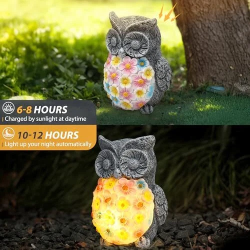 Menu 1. We require immediate payment. 2. We currently accept payment via eBay managed payments only. 3. Once payment is cleared, we will dispatch your shipment within 1-3 business days. Please refer to the "Shipping" tab for more information regarding shipping speed to your destination. Owl Solar Garden Outdoor Statues, 6.5 Inch Resin Owl Figurine Decorations with Solar Lights for Patio, Balcony, Home, Yard Art, Lawn Ornaments, Porch - Birthday Gifts for Grandma Mom Women Product description Elegant Floral Glow: This solar-powered owl statue features a floral-patterned glowing belly, enhancing any garden with its soft, ambient light. Durable Resin Material: Made from high-quality resin, this outdoor figurine is weather-resistant and durable, making it perfect for year-round outdoor and indoor use. Versatile Decor: Ideal for decorating pathways, steps, patios, and gardens, this unique snail outdoor statue also serves beautifully as a tabletop decoration (such as in flower pots) or as an attractive addition by ponds. Automatic Solar Recharging: The integrated solar panels capture sunlight to automatically recharge the LED lights, providing effortless lighting and a delightful ambiance every evening without the need for manual intervention. Perfect Gift Idea: An excellent choice for gardening enthusiasts or as a charming housewarming gift, this solar owl light statue is a thoughtful present for women who love gardening or outdoor decor. PLEASE MESSAGE US IF YOU HAVE ANY OTHER QUESTIONS, AND MANY THANKS FOR READING ALL OF THIS. Copyright ©#. All Rights Reserved.
