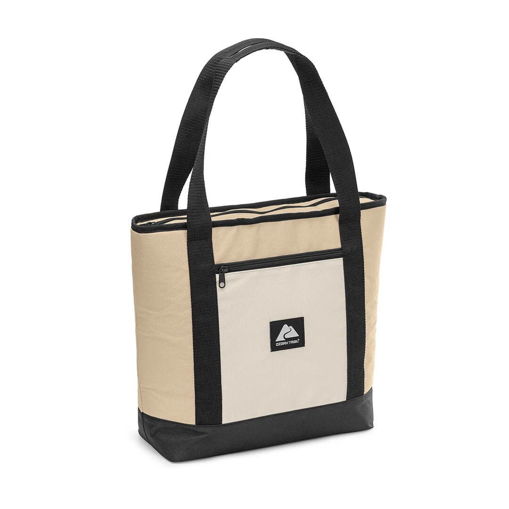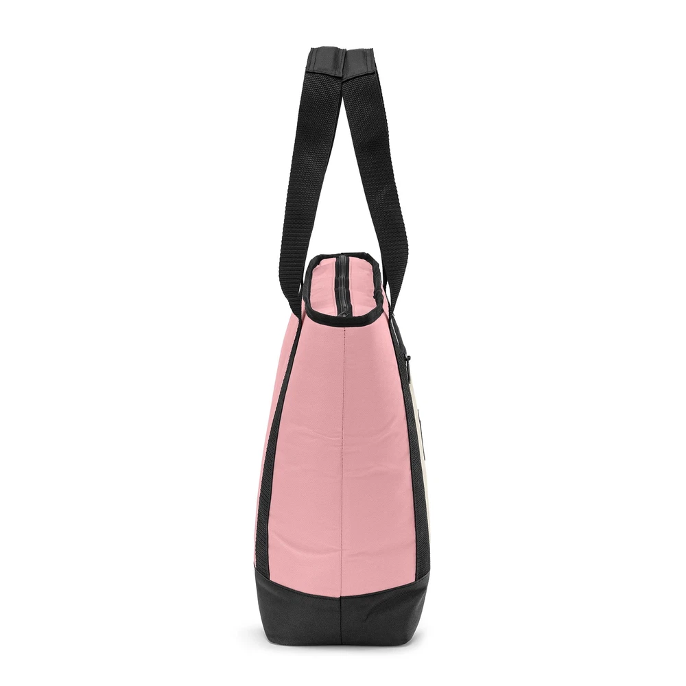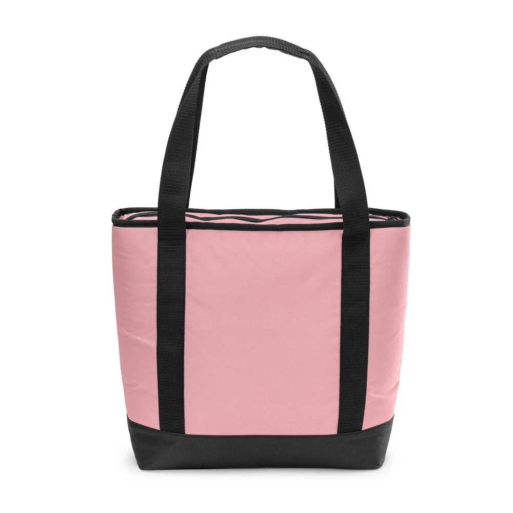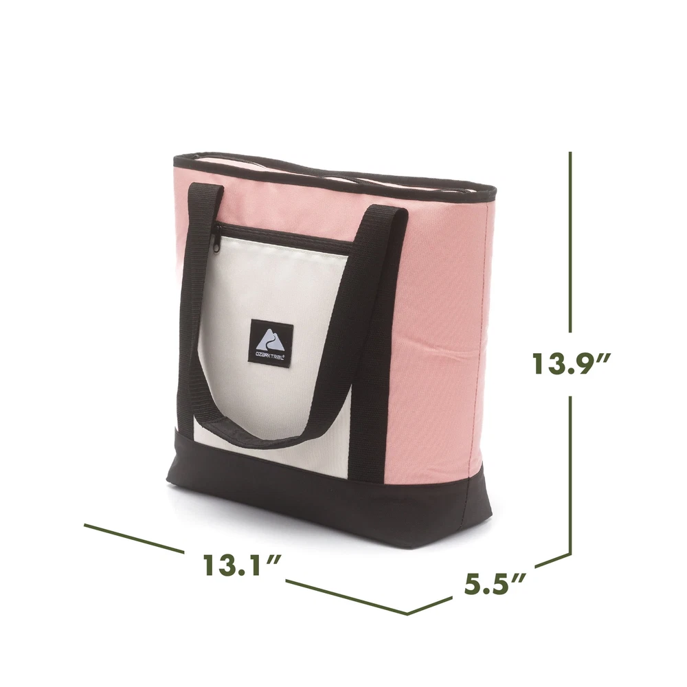 Keep your food and beverages cool with this soft-sided, 14.8 quart with 24 can capacity, Tote Cooler. This tote cooler keeps ice for up to 12 hours. The tote cooler is made with premium polyester outer fabric with nylon zipper closures. The perfect bag for the grocery store, camping and other outdoor adventures, sport events and tailgating. This tote cooler features an insulated main compartment with an easy-to-use top zipper and a front zippered pocket perfect for small snacks, your phone, sunscreen and keys. The leakproof interior has an easy clean PEVA lining with foam insulation. The dual-padded handle straps make this a comfortable to carry accessory for your next adventure. When not in use, this tote packs down flat for easy storage. Fits 24 cans 14.8 quart capacity Ice retention up to 12 hours Polyester outer shell fabric Nylon zipper closures Padded shoulder straps for comfortable carry Leakproof interior with easy clean PEVA lining Front accessory pocket Packs down flat for easy storage Product dimensions: 13.1” x 5.5” x 13.9” Available colors: Pink, Tan