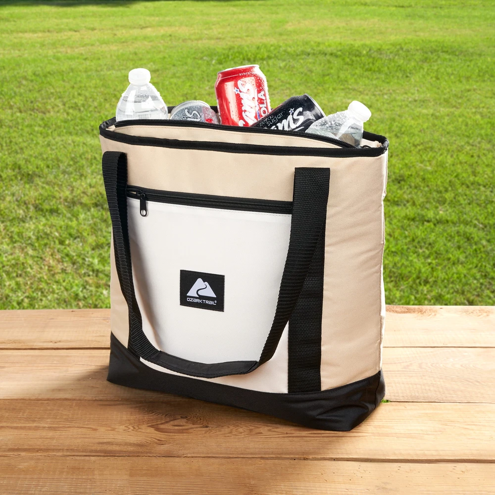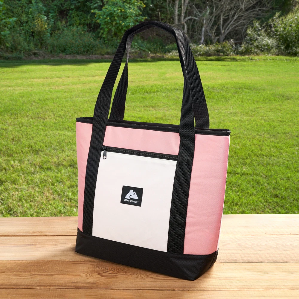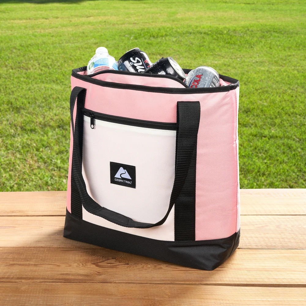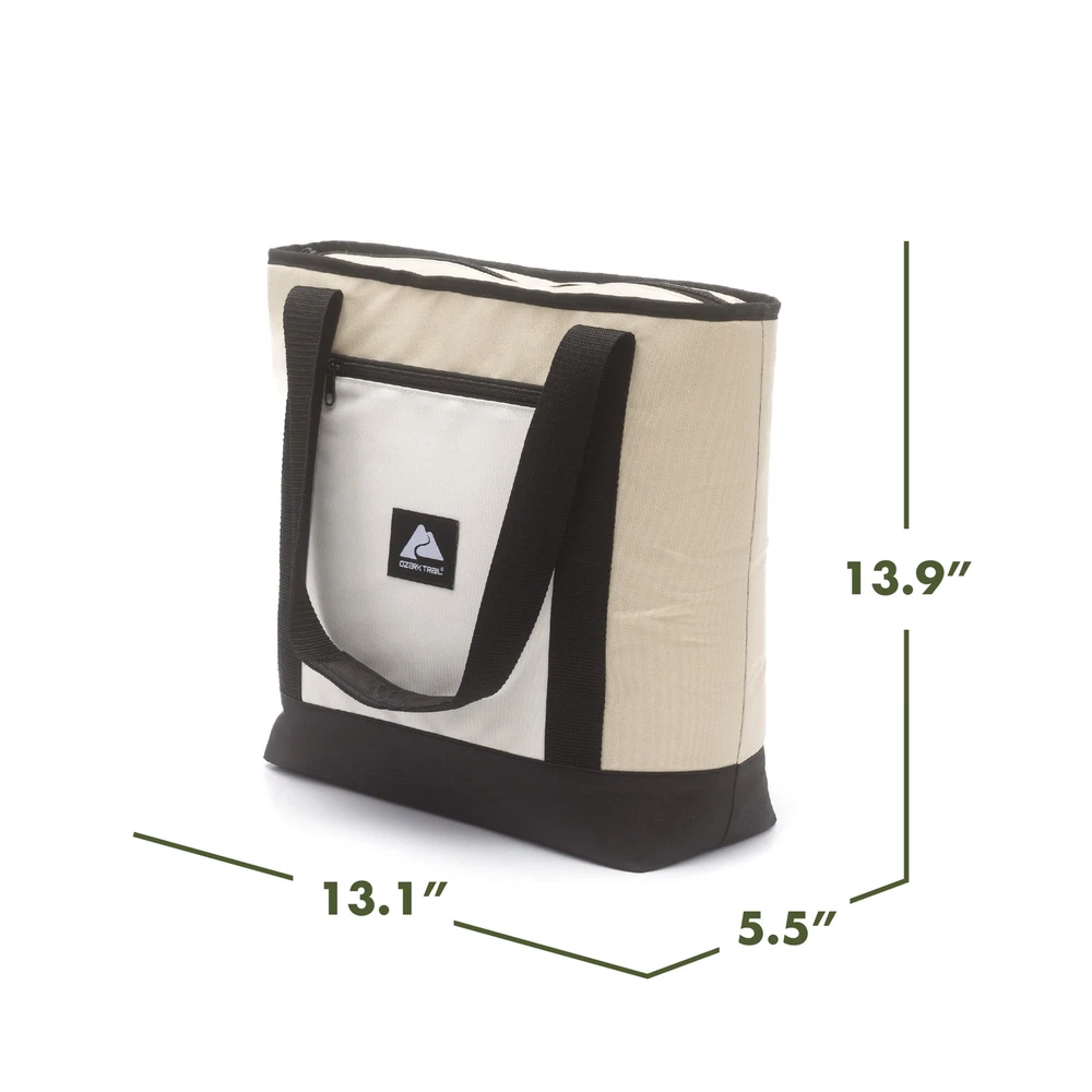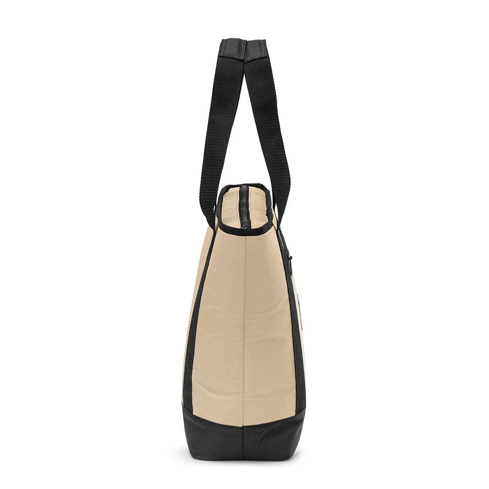 Keep your food and beverages cool with this soft-sided, 14.8 quart with 24 can capacity, Tote Cooler. This tote cooler keeps ice for up to 12 hours. The tote cooler is made with premium polyester outer fabric with nylon zipper closures. The perfect bag for the grocery store, camping and other outdoor adventures, sport events and tailgating. This tote cooler features an insulated main compartment with an easy-to-use top zipper and a front zippered pocket perfect for small snacks, your phone, sunscreen and keys. The leakproof interior has an easy clean PEVA lining with foam insulation. The dual-padded handle straps make this a comfortable to carry accessory for your next adventure. When not in use, this tote packs down flat for easy storage. Fits 24 cans 14.8 quart capacity Ice retention up to 12 hours Polyester outer shell fabric Nylon zipper closures Padded shoulder straps for comfortable carry Leakproof interior with easy clean PEVA lining Front accessory pocket Packs down flat for easy storage Product dimensions: 13.1” x 5.5” x 13.9” Available colors: Pink, Tan