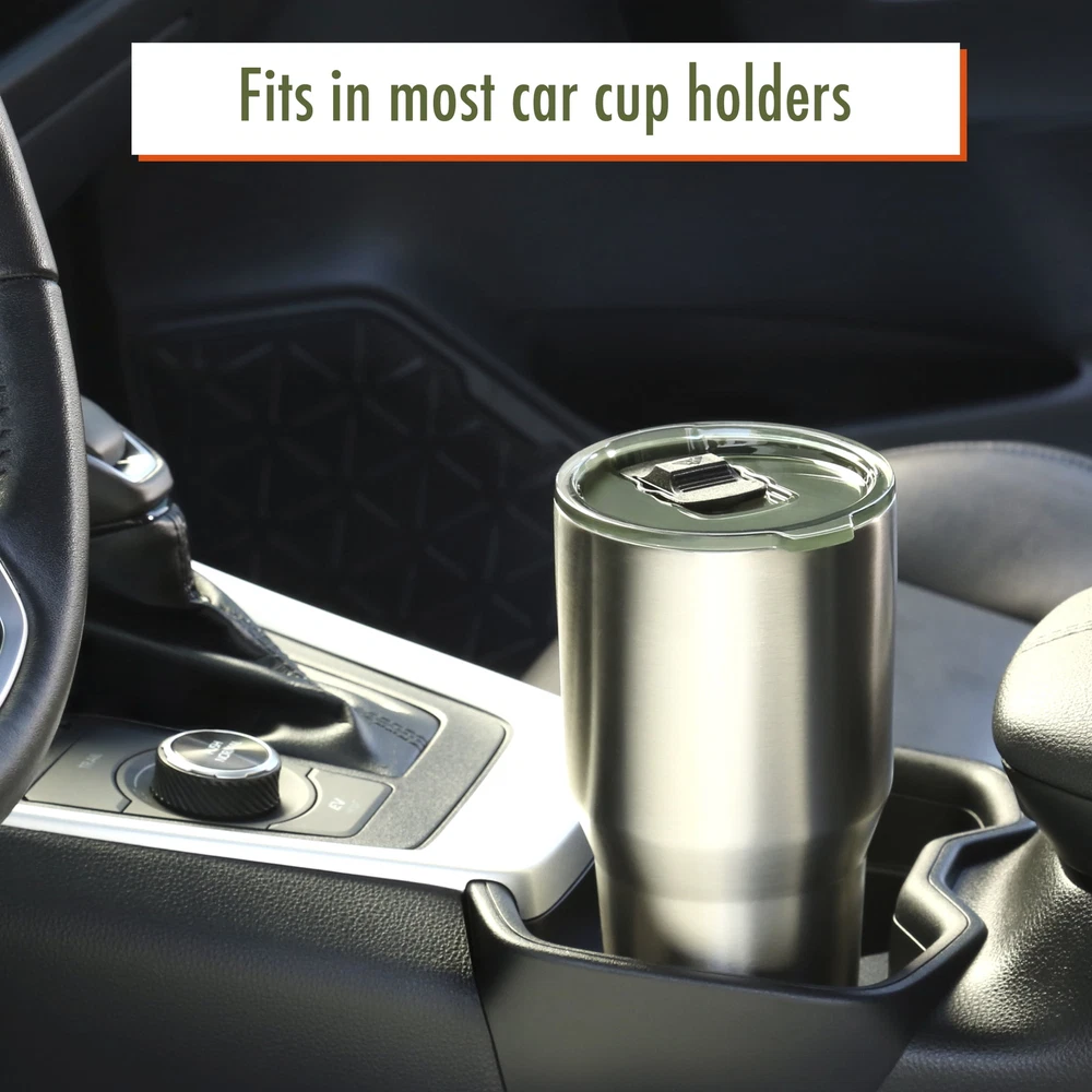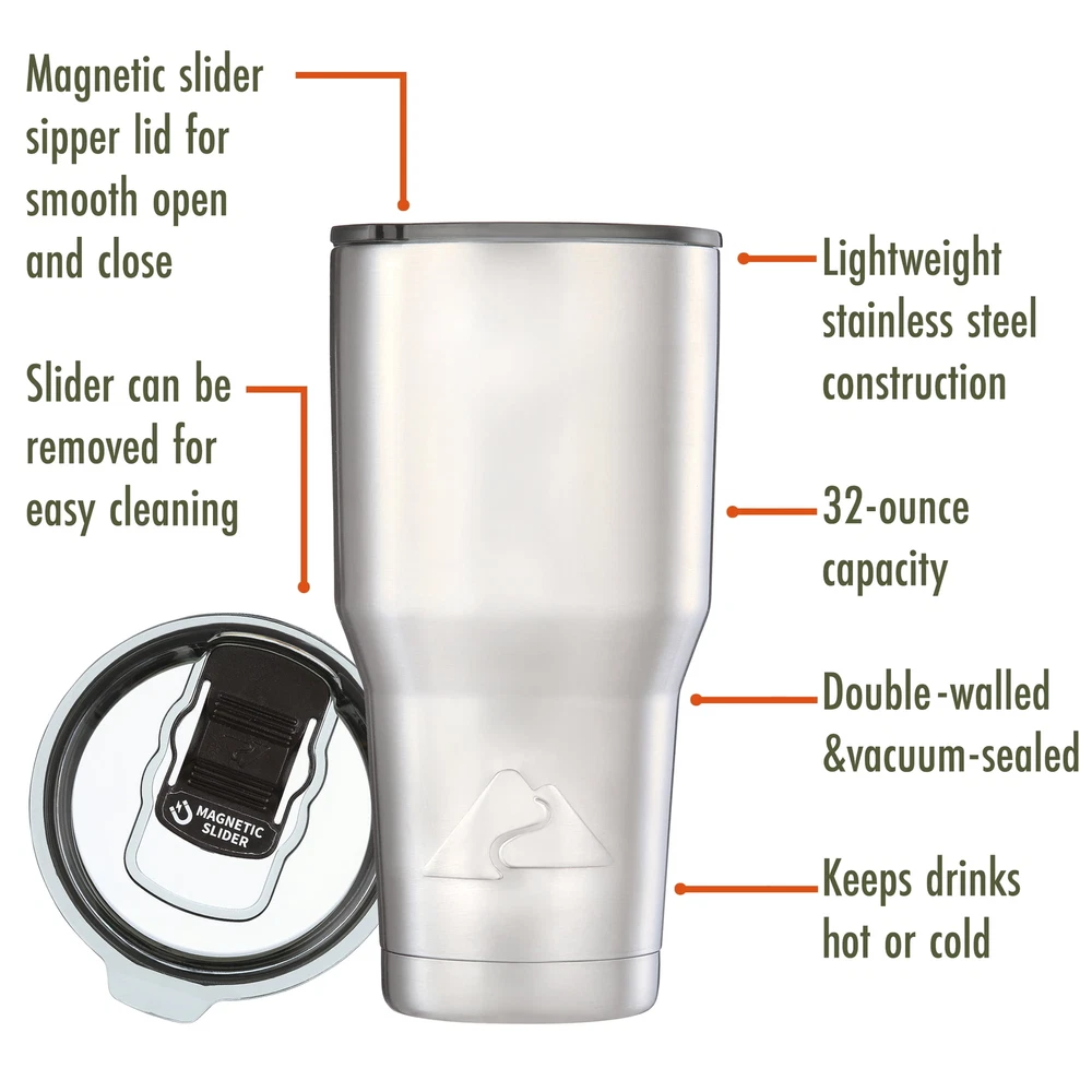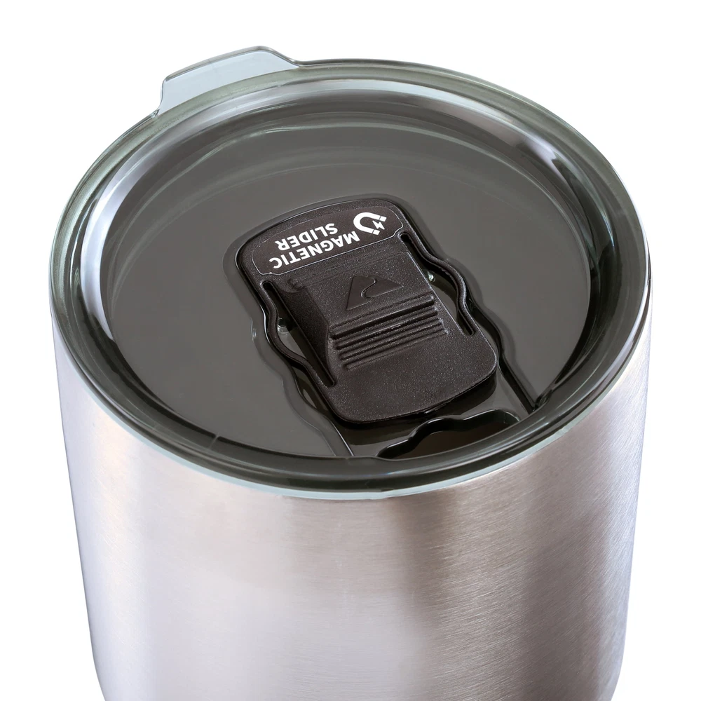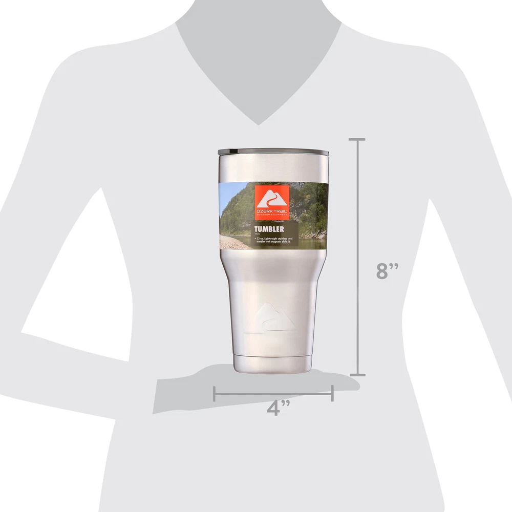 Whether you're on a camping adventure or jumping into your car for your morning commute, you can keep your thirst under control with this durable Ozark Trail 32-Ounce Double-Wall, Vacuum-Sealed Tumbler. This 32-ounce travel tumbler is made with high-grade 18/8 stainless steel and is double-walled and vacuum-sealed for maximum temperature control, so it's equally suited to sustaining the temperature of both hot and cold beverages. Whether you like to keep your sweet tea chilled on a hot summer day, or would rather keep your hot coffee from going lukewarm 10 minutes into your commute, this travel cup has you covered. Featuring a durable, rust-proof, and sweat-free design, the Ozark Trail Stainless Steel Tumbler is an ideal choice for taking beverages on the go. Adventure is where memories are made, whether it's campouts in the backyard with the kids, Saturdays at the river with friends, or a week in the wilderness alone. Ozark Trail helps you and your family create everyday adventures with gear and accessories built with you in mind. From backpacks, they're rugged, dependable, and priced to be practical. Because adventure is not a destination; it's a lifestyle. Ozark Trail 32 oz Vacuum Insulated Stainless Steel Tumbler, Silver Lightweight stainless steel construction 32-ounce capacity Double-walled and vacuum-sealed Keeps drinks hot or cold Magnetic slider sipper for smooth open and close Slider can be removed for easy cleaning