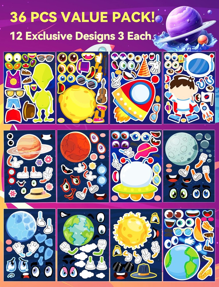 Ozepao 36 Pcs Outer Space Make-A-Face Sticker Sheets | Mix & Match Space Party Favors for Kids | Space Party Decorations, Crafts & Activities 👽Children's Space Sticker Set: Featuring cute cartoon planets, aliens, astronauts, rockets, and other outer space elements, this set offers rich expressions that allow children to immerse themselves in the joy of exploring the outer space world. (12 Designs, 3 Each) 🚀Eco-friendly & HD Printing: Crafted from high-quality vinyl with a glossy finish, these stickers are bright and colorful. 🌕Reusable:These stickers boast water resistance, sun protection, and fade resistance. The self-adhesive back ensures easy application and residue-free removal. 🚀Easy to Use: Our space stickers can be effortlessly attached to any smooth surface, including gift bags, scrapbooks, luggage, book bags, tables, and crafts. ☀️Versatile: Our adorable Universe stickers serve as engaging educational tools for kids to learn about space.They make perfect birthday gifts, party favors, or additions to fun classroom activities, offering kids the opportunity to create their own alien, astronaut, planet, or spaceship masterpieces! 👽Children's Space Sticker Set: Featuring cute cartoon planets, aliens, astronauts, rockets, and other outer space elements, this set offers rich expressions that allow children to immerse themselves in the joy of exploring the outer space world. (12 Designs, 3 Each) 🚀Eco-friendly & HD Printing: Crafted from high-quality vinyl with a glossy finish, these stickers are bright and colorful. 🌕Reusable:These stickers boast water resistance, sun protection, and fade resistance. The self-adhesive back ensures easy application and residue-free removal. 🚀Easy to Use: Our space stickers can be effortlessly attached to any smooth surface, including gift bags, scrapbooks, luggage, book bags, tables, and crafts. ☀️Versatile: Our adorable Universe stickers serve as engaging educational tools for kids to learn about space.They make perfect birthday gifts, party favors, or additions to fun classroom activities, offering kids the opportunity to create their own alien, astronaut, planet, or spaceship masterpieces! Shipping from the USA All of our products are shipped from the USA, ensuring quick delivery to your destination. Payment We offer the following payment methods: PayPal, credit card, bank transfer, and eBay's secure payment system. Free Shipping & Free Returns Shipping within the USA is FREE. Additionally, any return is absolutely free for you. Risk-Free Purchase You have the option to return an item within 30 days without any justification. We cover the return shipping costs! Fast Shipping We ship immediately upon receipt of payment. Generally, the package is delivered within 2-3 days in the USA. If it takes longer, we will contact you. Quality and Costs Made in Europe, USA, China No customs fees or additional charges Total satisfaction guarantee Invoice with declared VAT available upon request in .pdf format Feedback Your feedback is very important to us. After you pay for your purchase, you will automatically receive positive feedback from us.