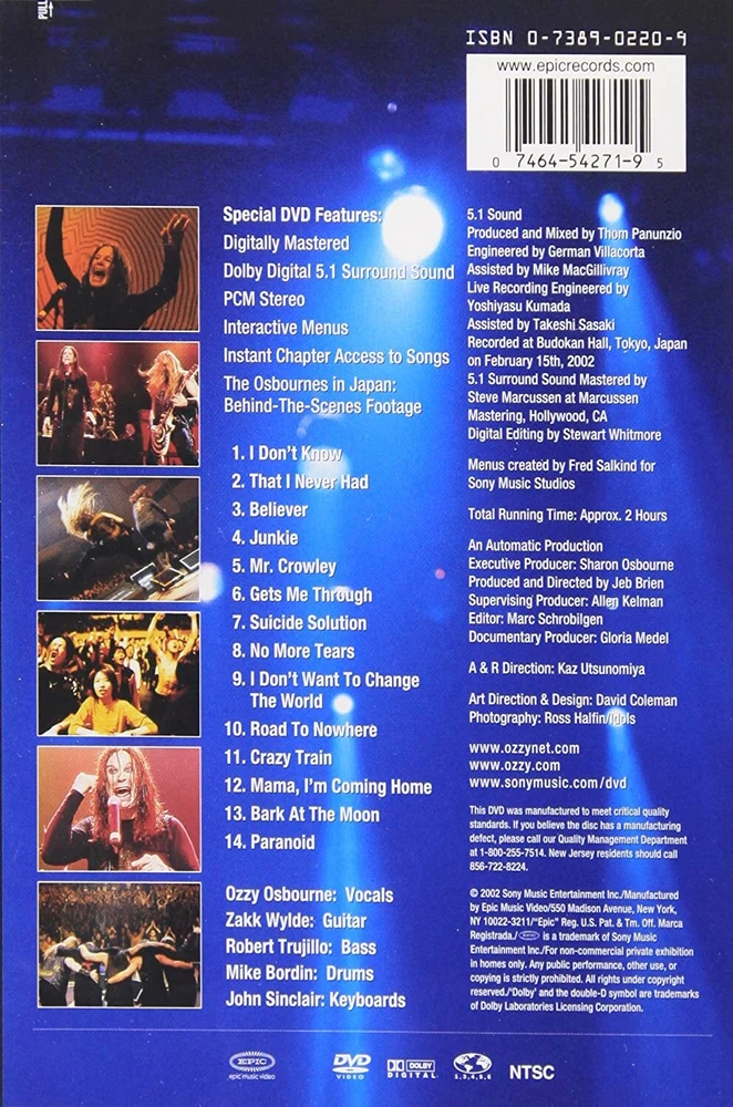 Further Details Title: Ozzy Osbourne - Live at Budokan Format: DVD Condition: New Number Of Discs: 1 Release Date: 06/25/2002 Actors: Ozzy Osbourne, Zakk Wylde, Robert Trujillo, Mike Bordin, John Sinclair Director: Jeb Brien Audio Language: English, English Runtime: 3 hours and 36 minutes Region Code: DVD: 1 (US, Canada...) Studio: Sony Legacy Certificate: Unrated Description: Ozzy Live At Budokan DVDs ARE REGION 1 UNLESS OTHERWISE STATED Missing Information? Please contact us if any details are missing and where possible we will add the information to our listing.